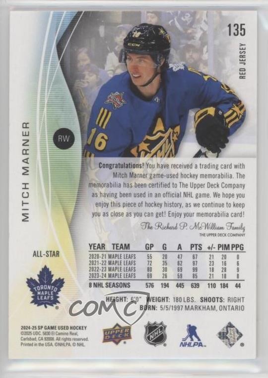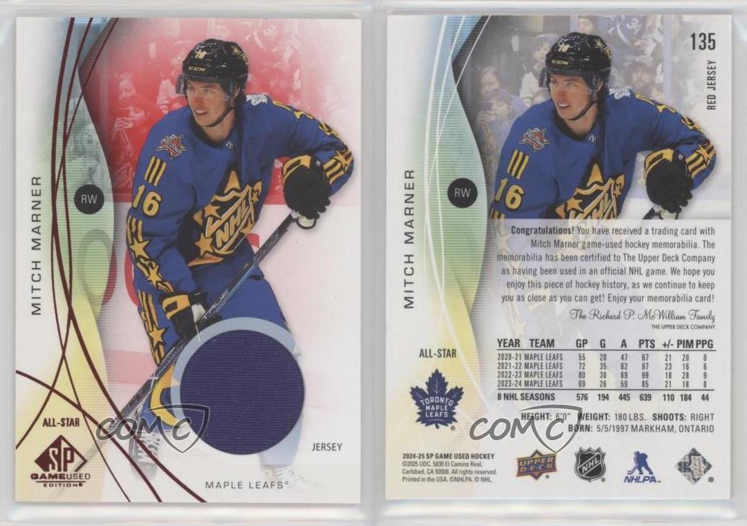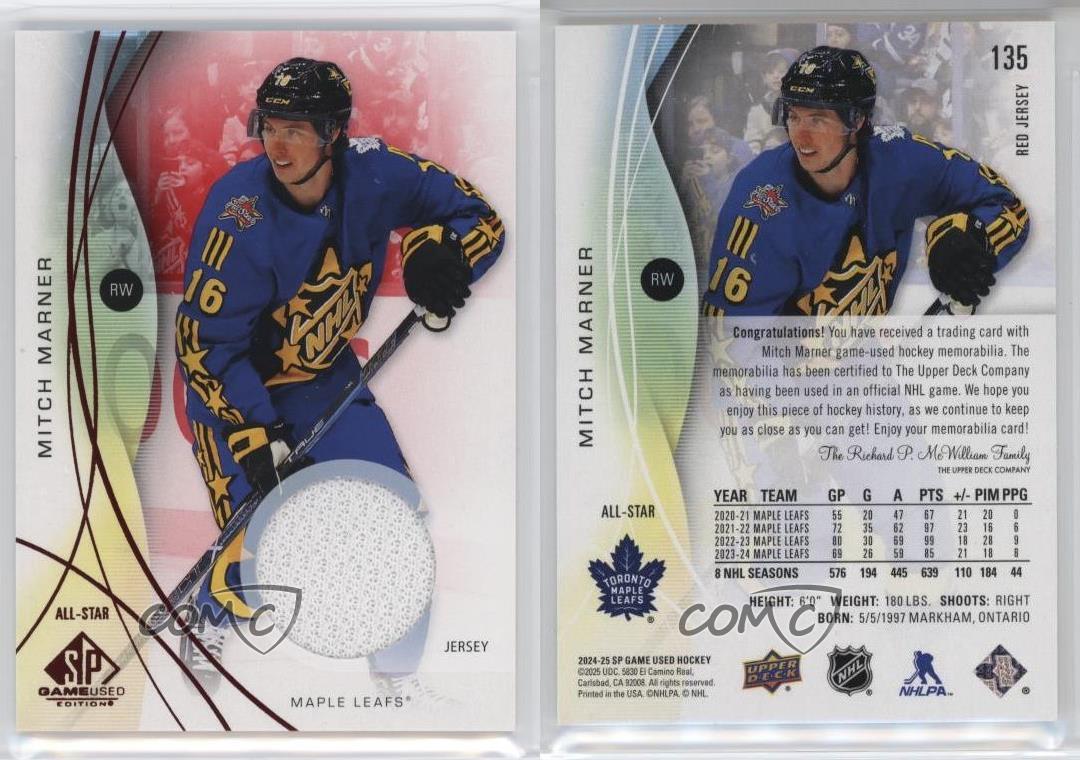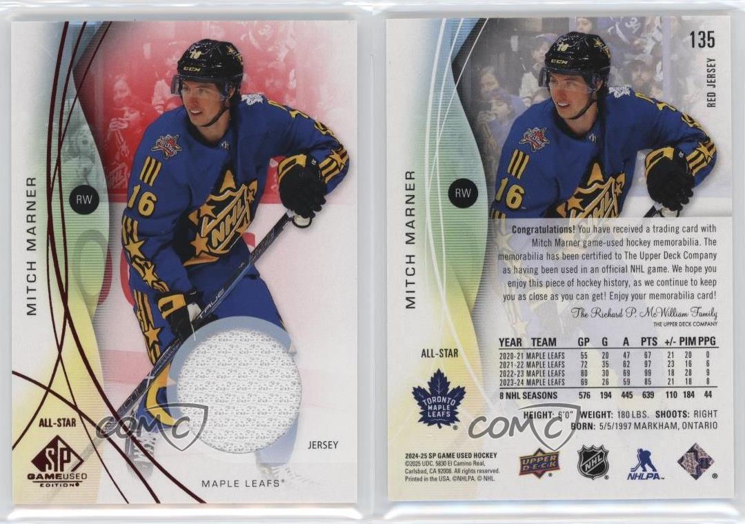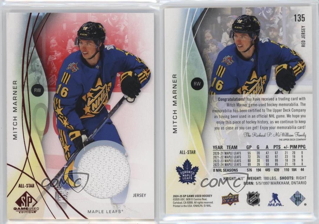 2024-25 Upper Deck SP Game Used - [Base] - Red Jersey #135 All-Stars - Mitch Marner - Ice Hockey Card - Featuring the Toronto Maple Leafs - Featuring Mitch Marner Search for more: 2024-25 Upper Deck SP Game Used Search for more: 2024-25 Upper Deck SP Game Used - [Base] - Red Jersey View all of our Listings Auctions Buy It Now About Us Located in the beautiful Pacific Northwest, COMC (Check Out My Cards) is the world's largest consignment service for trading card singles. More than 10,000 people have used our consignment service to list over 50 million trading cards. Find out how we can help you consign your items on eBay by contacting us through eBay messaging. COMC -- "The Safe & Easy Way to Buy & Sell" Representative Image - Select Specific Item above to see image of actual item Representative Image - Select Specific Item above to see image of actual item Raw Condition for Modern Cards Unless otherwise noted, raw modern cards are listed in Near Mint-Mint condition or better. A NM-MT card appears to be Mint at first glance, but upon closer inspection, may exhibit some of the following: minor print defects (e.g. roller marks, print line, dimple), minor scratches, slight edge wear, and slight corner wear. Centering is clearly visible in the images provided and does not factor into our condition assessment. Raw Condition for Vintage Cards Unless otherwise noted, raw vintage cards are listed in Excellent condition or better. An EX card may exhibit some of the following: minor rounding of corners, surface wear, print defects, light scratches, and slight edge wear/chipping. Centering is clearly visible in the images provided and does not factor into our condition assessment. Domestic Shipping Combined shipping for multiple items is available. To receive combined shipping, please ensure all desired items are in your eBay shopping cart before proceeding to checkout. eBay limits orders to 40 items per order. We automatically combine multiple orders placed on the same day. If you place multiple orders on the same day, please contact us to request a refund of applicable shipping costs. Signature confirmation may be required on invoices over $400. All cards are protected and shipped securely. International Shipping COMC offers eBay's International Shipping (EIS) for international orders under $2,500* (see country exceptions below). All duties and import fees are paid at checkout; in the rare event that there are additional import fees upon delivery, these are borne by the buyer. EIS packages route through a shipping hub in Erlanger, KY before shipping to their final destination. Please note that EIS does not allow for combined shipments. The shipping rates are determined by eBay and cannot be adjusted. *Maximum sale price exceptions: Colombia, Kuwait ($2,000); Taiwan ($1,539); Chile, Costa Rica, Guatemala, Honduras, Trinidad and Tobago ($1,000); Antigua and Barbuda, Aruba, Belize, Dominica, Grenada, Philippines, Saint Kitts and Nevis, Saint Lucia, Montserrat, Turks and Caicos Islands ($500); Dominican Republic, El Salvador ($200). Please request a shipping quote through eBay messaging for orders that exceed the maximum sale price supported by eBay's International Shipping. You will be responsible for all duties and import fees for international orders shipped outside the EIS. All cards are protected and shipped securely. Payment COMC does not accept offers on our cards through our eBay storefront. COMC utilizes eBay’s managed payments system. If you are experiencing difficulties making a payment, please contact eBay for assistance. Return Policy Returns are only accepted on the rare occasion the item is not as described. If you are making a return, please initiate the return process through eBay so a mailing label can be provided for you. Prior to listing, our expert team carefully assessed this item to represent it accurately. Please review the description and high-definition images prior to purchasing to ensure this item meets your satisfaction. We welcome you to contact us if you have further questions about this item. Trust and Integrity COMC carefully assesses each item consigned to us to prevent fraudulent items from entering the marketplace. If you believe an item offered on COMC may be fraudulent, please contact us with details so we can investigate the issue. Items we determine are outside our supported items policy may be removed. Last Modified: 12/5/2025 7:00:37 PM PDT