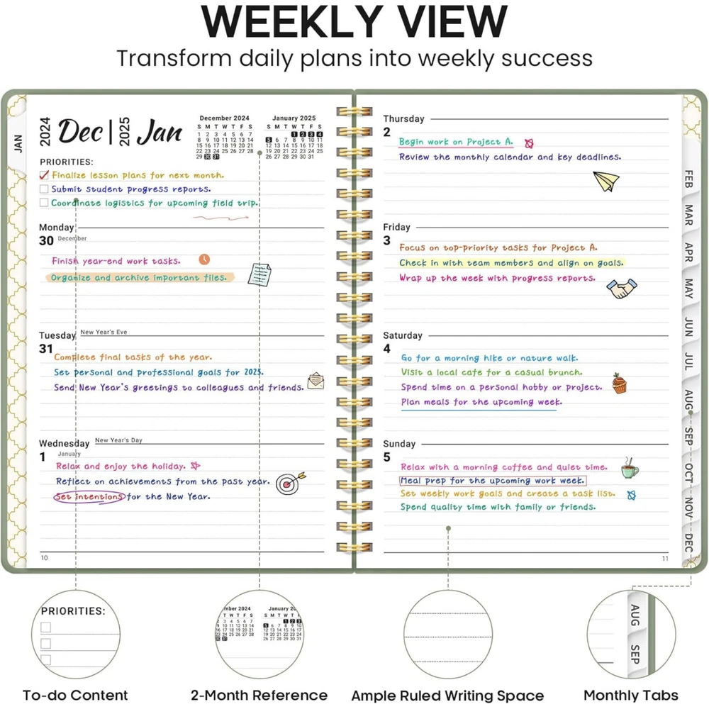 2025 Planner, Weekly and Monthly Calendar Planner Book, January 2025 - December 2025, HardCover Planner 2025 with Monthly Tabs, Notes Pages, Spiral Bound, Inner Pocket, A5 (6.4" x 8.5") - Green 2025 Planner Overview: Our aesthetic planner covers the period from January to December 2025, featuring 12 monthly pages and 53 weekly pages to help you easily organize the entire year, making it an essential supply for office, home, and school. Monthly Planner: Features previous and next month reference calendars, major holidays reminders for long-term planning, daily writing blocks and a dedicated notes section for important projects. With monthly tabs and motivational quotes, it's designed to inspire and organize your life, work, or study. Weekly Planner: Our agenda book planner 2025 features each two-page weekly spread, from Monday to Sunday, offering ample lined writing space. It also includes popular holidays, two-month reference previews, and a dedicated priorities area, making it easy to manage appointments, notes, and daily tasks. Paper to Meet Your Needs: Our premium thick paper not only prevents ink bleeding, allowing you to use your favorite pen on the planner, but also provides a smooth writing experience. Distinct Design: The strong spiral binding ensures the planner's durability. It also offers dedicated sections for notes, a 2025-2026 yearly overview, holiday reminders, dual-pockets, and more, making it a perfect planner for women, men, teachers, and students. Sustainability features This product has sustainability features recognized by trusted certifications. Forestry practices Made with materials from well-managed forests, recycled materials, and/or other controlled wood sources.