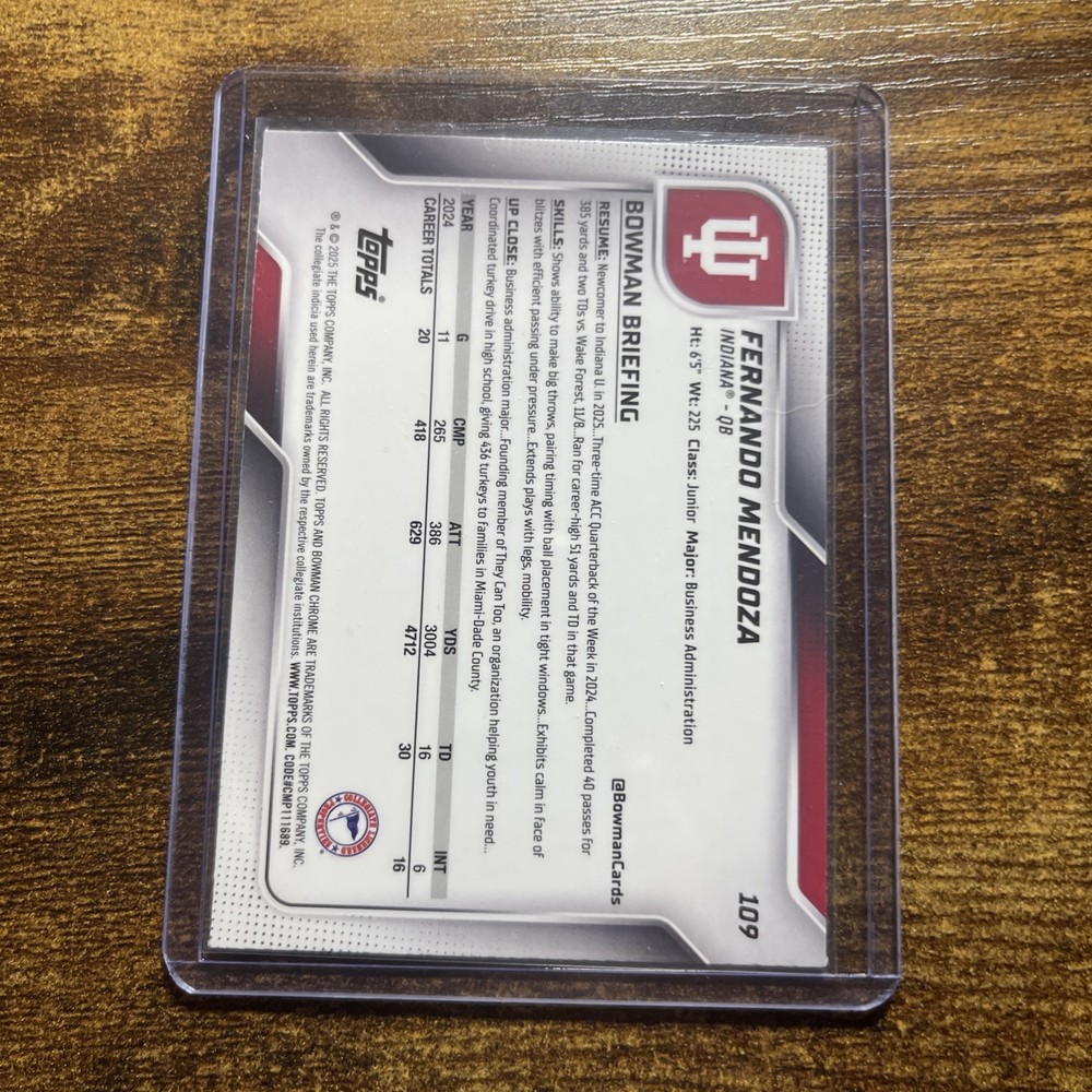 The product is a 2025 Bowman University Chrome Sapphire Edition trading card featuring Fernando Mendoza from the Indiana Hoosiers. This single sports trading card is a rookie edition with specific card attributes such as being a short print and part of the base set. It is manufactured by Bowman and is an original release for the 2024 season of the National Collegiate Athletic Association (NCAA) football league. This collectible item is a valuable addition to any sports trading card collection, especially for fans of the Indiana Hoosiers or Fernando Mendoza.