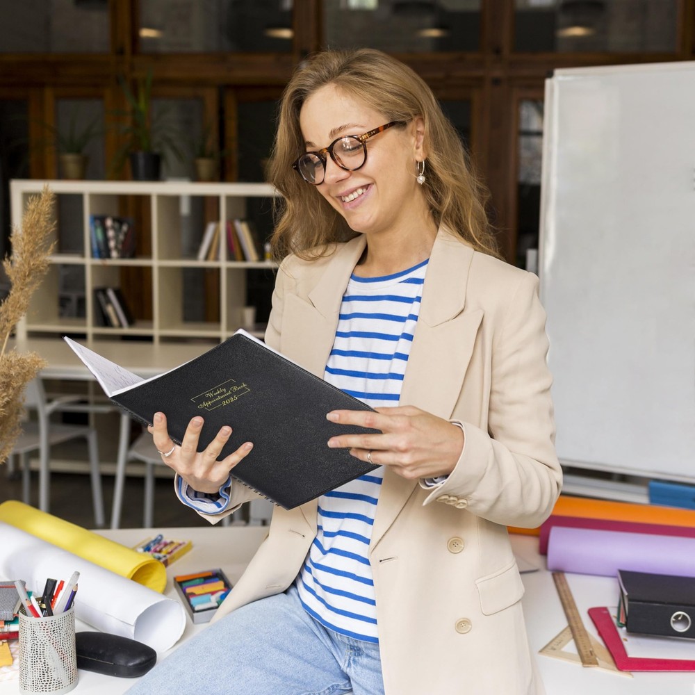 The 2025 Weekly Appointment Book is an 8.5" x 11" planner designed for optimal organization and productivity from January to December 2025. The 2025 planner features a soft cover and includes monthly, weekly, daily, and hourly planning with 15-minute increments, ideal for school, office, and work schedules. Keep Your Day On Track & Boost Your Productivity - Start planning ahead with this 2025 daily planner, featuring 12-month from January 2025 - December 2025, the comprehensive 2025 hourly, daily, weekly, monthly and yearly planner, allowing you to jot down detailed appointments, important things and other notes - all in one place, keeps yourself organized well for the whole year and increase productivity, perfect for school office work daily planning. Versatile Usage & Stay On Top Of Schedule- Sized at 8.5×11", each month displays across two full pages, offers ample space for academic daily affairs, work deadlines, and household task. This 2025 appointment book also features one week per two page spread. Schedule your day from 7:00 a.m. - 8:30 p.m. in 15-minute intervals from Monday to Sunday to set yourself up for purposeful days. Stay focused & manage your time efficiently! Elegant Design & Perfect For All Lifestyles- Enjoy a thicker planner appointment book with a soft leather cover and premium high-quality paper, a quick glance provides with a professional and structured approach to time management and personal growth. Ideal for college students, teachers, professionals and homemakers. A perfect school/work planner for setting your targets, managing daily assignments, cultivating healthy life habits and optimizing success. PERFECT ORGANIZATION - The 2025 hourly appointment planner measures 8.5×11", thicker than other 2025 daily appointment book on Amazon, with a soft faux leather cover. There are 1 page of future planning | 1 page of yearly overview for 2024-2026 | 1 page of major holidays of 2024-2026 | 1 page for quick reference information | 8 lined pages for some notes, ideas, meetings and appointments. Now Is The Best Time To Prepare Your 2025 - Open your fabulous 2025 with this daily planner! Our Appointment Book 2025 helps everyone keep on top of the long-term goals and detailed assignments in studies and works, making it an purposeful present that fosters organization and personal growth for birthdays, graduations, shcool open days and festive seasons throughout the year.