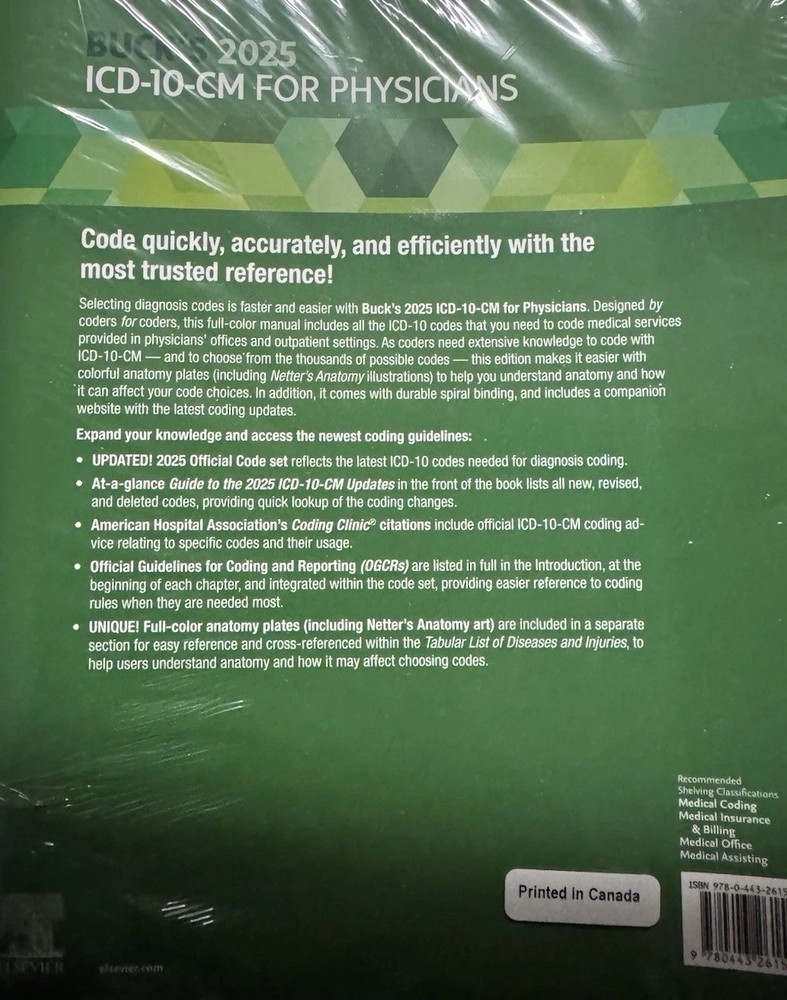 Buck's 2025 ICD-10-CM for Physicians is a comprehensive textbook authored by Jackie Koesterman and published by Elsevier. This spiral-bound edition provides detailed information on medical coding and is specifically designed for medical professionals, such as physicians and allied health services personnel. With 1646 pages of content, this textbook covers subjects like pathology, medical history, and nursing, making it a valuable resource for those in need of accurate and up-to-date information on ICD-10-CM coding.
