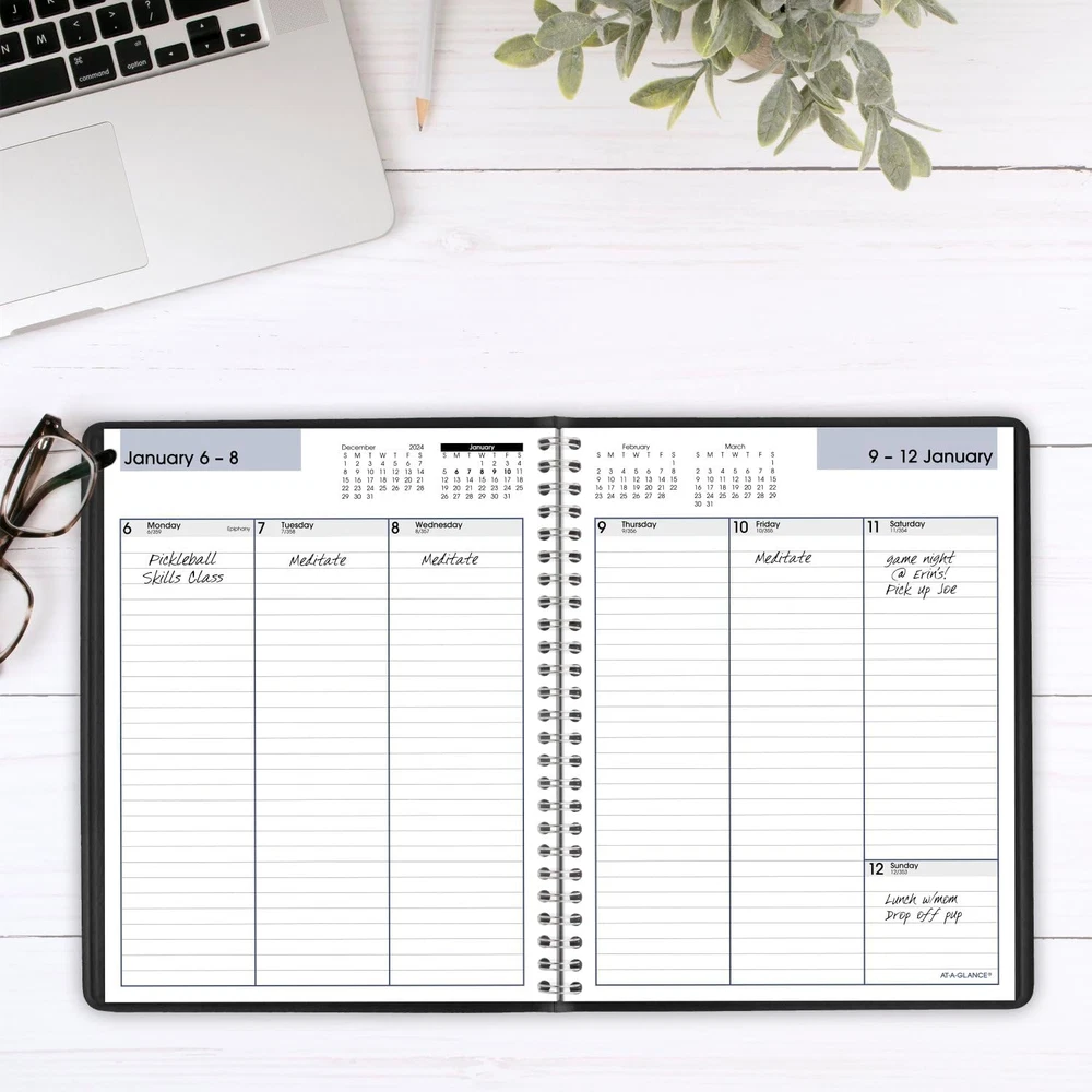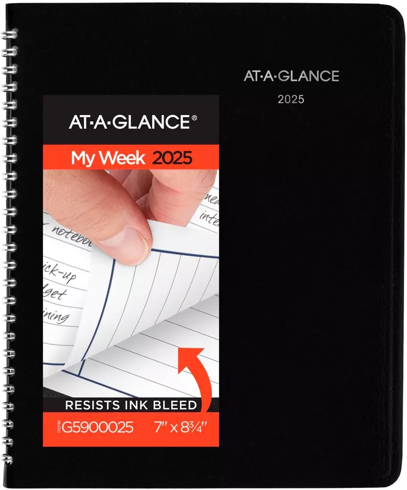 2025 Planner, Weekly, 7" X 8-3/4", Medium, Column-Style, Dayminder, Black (G590 YEAR ROUND PLANNING – Planner covers a 12-month date range from January 2025 — December 2025 with Julian dates GUARANTEED TO LAST ALL YEAR – ACCO Brands will replace any defective AT-A-GLANCE planner that is returned within one year from the date of purchase. This guarantee does not cover damage due to misuse or abuse. INK BLEED RESISTANCE – Plan your schedule without fear of distracting ink bleeding. Our high-quality paper is designed for ink bleed resistance, which keeps plans neat and legible. WEEKLY VIEWS – One week per two page spread features daily columns with ruled planning space. Past, present and future reference calendars included on each weekly spread. Pages measure 7" x 8-3/4". SPECIAL FEATURES – Includes a 3-year reference calendar, personal information and phone numbers pages PROFESSIONAL DESIGN – Planner has a durable black cover and twin wire binding to help prevent snags and secure pages ASSEMBLED IN THE U.S. – Thoughtfully designed and assembled in the U.S. using high-quality materials Confidently face every deadline this year with the AT-A-GLANCE DayMinder Column Style Weekly Appointment Book Planner. Date range covers 12 months from January 2025 — December 2025 with Julian dates. Guaranteed to last all year.* Plan your schedule without fear of distracting ink bleeding. High-quality paper is designed for ink bleed resistance, which keeps plans neat and legible. One week per two page spread features daily columns with ruled planning space. Past, present and future reference calendars included on each weekly spread. Pages measure 7" x 8-3/4". Expand your organizational skills with special pages. Includes a 3-year reference calendar, personal information and phone numbers pages. Planner has a durable black cover and twin wire binding to help prevent snags and secure pages. Thoughtfully designed and assembled in the U.S. using high-quality materials. *ACCO Brands will replace any defective AT-A-GLANCE planner that is returned within one year from the date of purchase. This guarantee does not cover damage due to misuse or abuse. 7.45 inches x 9.2 inches x 0.5 inches. Weight: 7.4 oz Item model number G5900025 Ink Color Black Style 2025 New Edition Material Paper Number of Items 1 Format Notebook, Organizer Color Black Material Type Paper Cover Material Faux Leather Calendar Type Weekly Binding Spiral-bound Manufacturer Part Number G5900025 Item Weight 7.4 ounces Pattern Name Column-Style Year 2025 Target Audience Teacher, Adult, Student Product Dimensions 9.2 x 7.45 x 0.5 inches