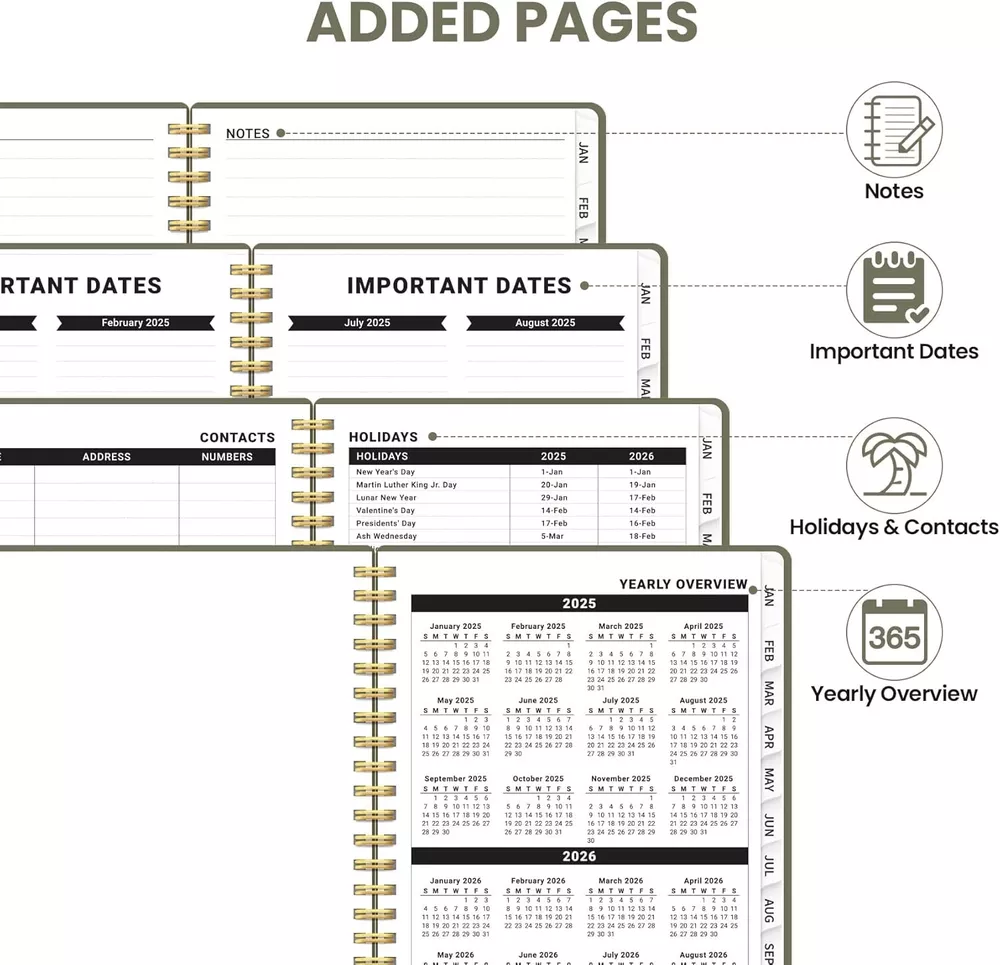 2025 Planner Weekly and Monthly Calendar January 2025 A.Green Writing Style:Style 1- Green Color: A.Green Cover Material Paper Year: 2025 Calendar Type Weekly & Monthly Target Audience Teacher, Adult, Student, Teen Sheet Size: A5 Inches Material: Paper Item Weight: 11.68 ounces Pages: 160 Pages Start 2025 with Purpose: Embrace the new year with confidence using our ZOTIA 2025 Planner! Designed to cover January through December, this planner perfectly balances monthly and weekly layouts. At a convenient 6.3" x 8.5", it’s the ideal companion for tracking work goals, appointments, and daily priorities with precision and purpose. Effortless Monthly Planning: Stay organized and ahead of the curve with spacious daily blocks and holiday reminders on each monthly spread. Access past and future reference calendars, ensuring you have all the tools for seamless long-term planning right at your fingertips. Streamlined Weekly Organization: Achieve your weekly goals with ease! Each weekly page offers ample lined space for appointments, events, and to-do lists, complete with checkboxes to keep you on track. Celebrate your achievements as you navigate through the week! Stylish and Functional Design: The ZOTIA 2025 Planner combines thick, high-quality paper with a durable hardcover, designed to fit your lifestyle. Monthly tabs, twin-wire binding, and an elastic band for secure closure add practicality while maintaining a sleek, modern aesthetic. Elevate Your Productivity: Take charge of your time and unlock your full potential! Capture daily tasks, notes, big ideas, and important meetings all in one place. Ready to transform your ambitions into reality? Grab your ZOTIA 2025 Planner today and make this your most productive year yet! Return Policy: We offer a 30 day return policy from the receiving date. Please contact us for a Free Return Label. Please use our return label so it will go back to our supplier and we can do a refund or replacement afterwards. Feedback: Your satisfaction is very important to us! If you have any problem with your order, please contact us and we will do our very best to make you satisfied. As long as you are happy with your purchase, please leave a positive feedback for us. We will always leave you a positive feedback in return. If you have any problem with your purchase, please do not leave a negative feedback. Please Contact us ... and your issue will be solved quickly and positively We are a small family-owned business trying to make a living, not a huge company that does not care ... We will ALWAYS do our best for you!