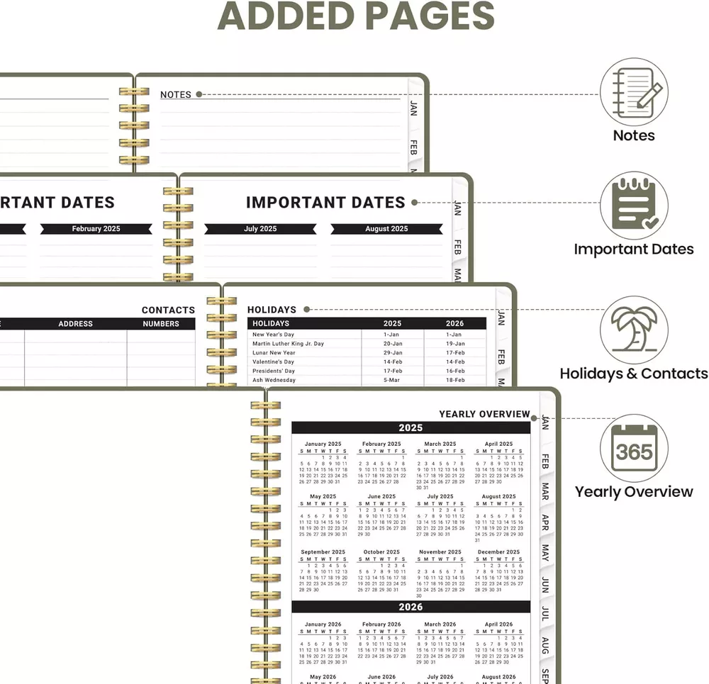 2025 Planner, Weekly and Monthly Calendar January 2025 - A.Green Start 2025 with Purpose : Embrace the new year with confidence using our ZOTIA 2025 Planner! Designed to cover January through December, this planner perfectly balances monthly and weekly layouts. At a convenient 6.3" x 8.5", it’s the ideal companion for tracking work goals, appointments, and daily priorities with precision and purpose. Effortless Monthly Planning : Stay organized and ahead of the curve with spacious daily blocks and holiday reminders on each monthly spread. Access past and future reference calendars, ensuring you have all the tools for seamless long-term planning right at your fingertips. Streamlined Weekly Organization : Achieve your weekly goals with ease! Each weekly page offers ample lined space for appointments, events, and to-do lists, complete with checkboxes to keep you on track. Celebrate your achievements as you navigate through the week.