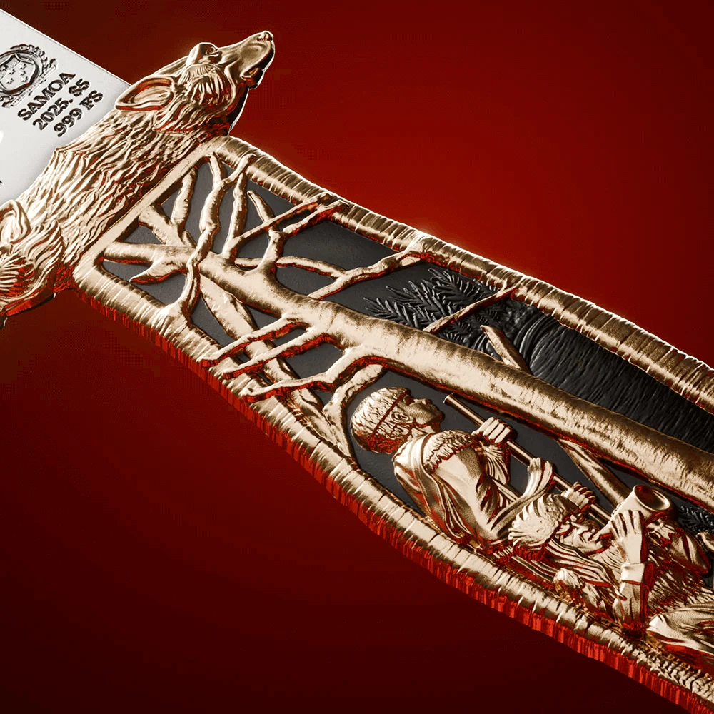 FREE SHIPPING ON DOMESTIC ORDERS New releases Deals Exclusives Bullion Gold Graded Licensed Standing behind our products & our name for over a century SINCE 1915 SHOP BY CATEGORY Animal Theme Art Coins Coin Sets Comics, Notes, & Foils Deals Famous Figures & Landmarks Gold Coins GR Reserve Exclusives Graded Coins Holiday Theme Licensed Products Lunar Calendar Nature Coins Premium Bullion Rare Certificate Numbers Shaped Coins Warriors & Gods Other PARTNERS & AFFILIATIONS STORE NEWSLETTER Add us to your Favorites and receive exclusive emails about new items and special promotions! Sign up 2025 Samoa Theodore Roosevelt’s Hunting Knife 2 oz Silver Gilded Coin Product Description Theodore Roosevelt’s Hunting Knife – A Masterpiece of Craftsmanship Celebrate Theodore Roosevelt’s adventurous legacy with this 2 oz silver coin, a stunning replica of his iconic 1909 hunting knife. Featuring intricate gold gilding and craftsmanship, this collectible is limited to 1,909 pieces. Theodore Roosevelt, the 26th President of the United States, was an adventurer, conservationist, and military leader whose legacy as a champion of the American frontier remains unmatched. In 1909, as he prepared for his African expedition, Roosevelt received a ceremonial hunting knife from his friend Justice James W. Gerard. This knife, an exquisite symbol of Roosevelt’s legacy, is meticulously recreated in this 2 oz silver collectible. The original knife, a masterpiece of early 20th-century craftsmanship, featured an eagle’s head handle with red garnet eyes, intricate forest scenes, and the U.S. arms with Roosevelt's initials, all reproduced with gold gilding on this coin. One side of the hilt displays two men of the American Frontier—likely Daniel Boone and Davy Crockett—gathered around a campfire, while the other showcases the stylized eagle from the Great Seal of the United States between two trees, flanked by a wishbone. Below is an Art Nouveau-style intertwining of the initials "TR," where the "T" is shaped like the wings of the eagle and in silver. The handguard is shaped like two outward-facing bear heads. The blade is engraved with the inscription: “Presented to Theodore Roosevelt by His Friend, James W. Gerard”. Issued by Samoa in 2025, this 2 oz legal tender .999 fine silver coin measures 150 x 28 mm and features an antiqued high-relief finish with selective gold gilding. Limited to 1,909 pieces, commemorating the year Roosevelt received the original knife, this unique collectible is a must-have for history and coin enthusiasts alike. Contact Shipping Payment Returns To contact our Customer Service Team, simply click the button here and our Customer Service team will be happy to assist. Domestic Shipping Options - Free shipping USPS Ground Advantage UPS Ground Saver International Shipping Options – Calculated USPS Priority Mail International UPS Worldwide Expedited UPS Worldwide Saver UPS Standard to Canada Handling time Will ship within 1 business day of receiving cleared payment. Ship From Location Attleboro, Massachusetts, 02703, United States Note to international buyers The item price and shipping charges do not include import duties, import taxes, and customs clearance fees. These charges are the buyer's responsibility. Please check with your local customs office to determine what these additional charges may be prior to bidding or purchasing an item. If your order is returned to GR Reserve due to your refusal to pay duties or taxes, or if the carrier (for example, Federal Express or UPS) was unable to deliver your order, you agree you are responsible for any return shipping fees, additional duties, or applicable taxes for returning the package back to GR Reserve. In addition, if your package is returned to GR Reserve, we will not reship your order unless and until we are paid in full for any return shipping costs, duties, taxes we have had to pay or advance for you as well as any subsequent re-ship fees back to you. Immediate payment is required upon selecting "Buy It Now" or upon checking out through the cart. We accept payment via U.S. PayPal accounts and all Major Credit Cards, Debit Cards & Google Pay. We are legally required to collect sales tax in those states and localities where we maintain a physical presence. The applicable amount of sales tax charged to an order will be calculated based on the shipment destination's state and local sales tax laws. Thank you for shopping with us on eBay! Standard Other eBay Mastercard® Earn up to 5x points when you use your eBay Mastercard®. Learn more GR Reserve’s return, refund, and exchange policy is limited to (30) business days from the date that you received your item. If you find you have received a defective item, please contact us, and include detailed photos. GR Reserve will then assess whether the product is eligible for a return, refund, or exchange. For approved exchanges, you must follow all instructions provided by us, including packaging the product appropriately. We are responsible for the cost of return domestic shipping and the risk of loss during the return shipment. Refer to eBay Return policy for more details. You are covered by the eBay Money Back Guarantee if you receive an item that is not as described in the listing. Free Shipping On all domestic order 100% SATISFACTION GUARANTEED About Feedback GR Reserve - Attleboro, MA 02703