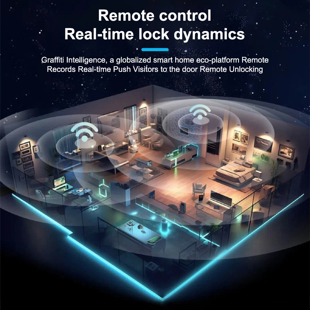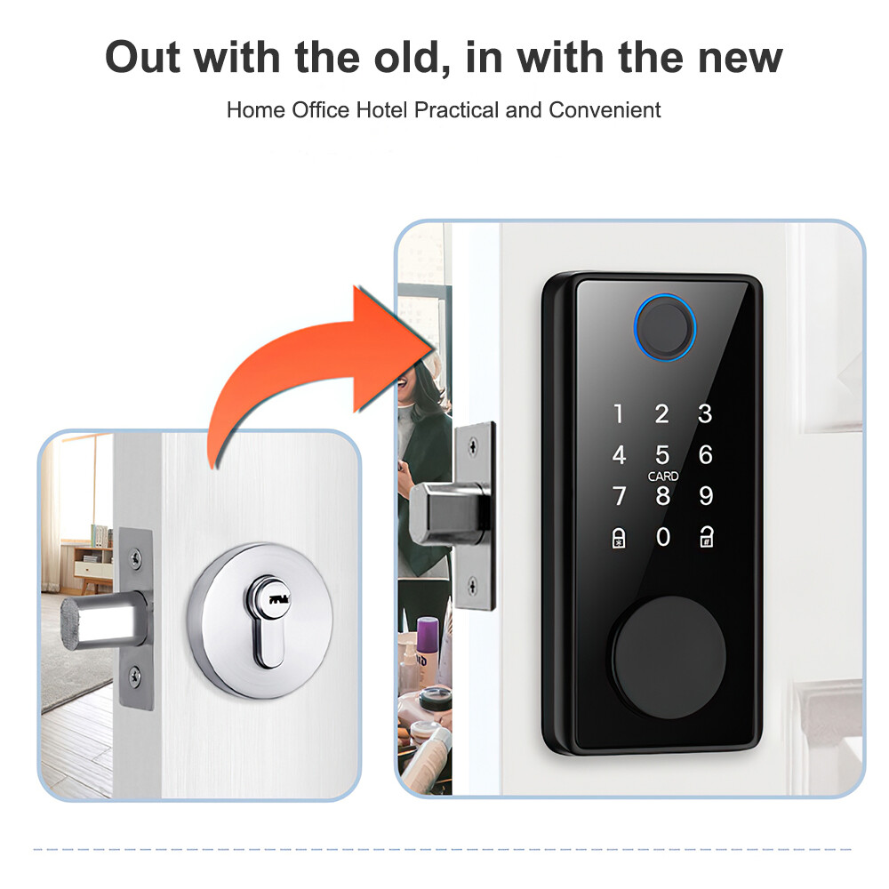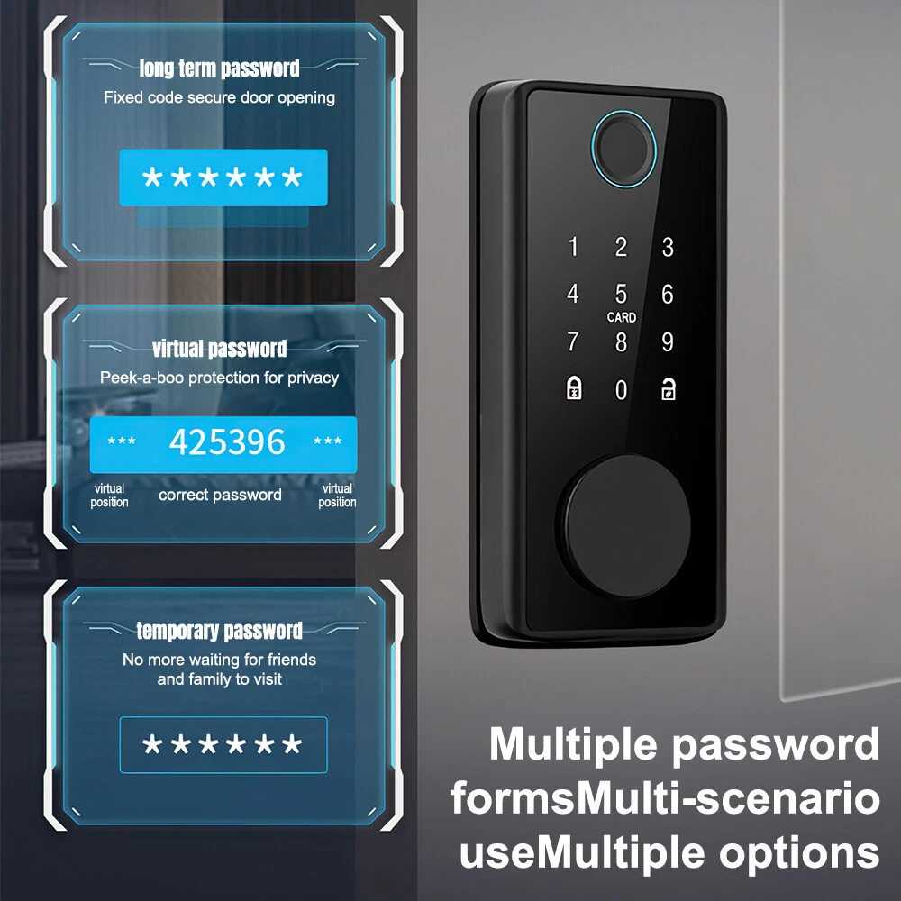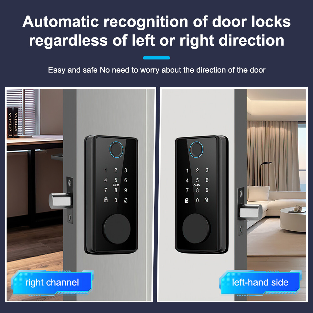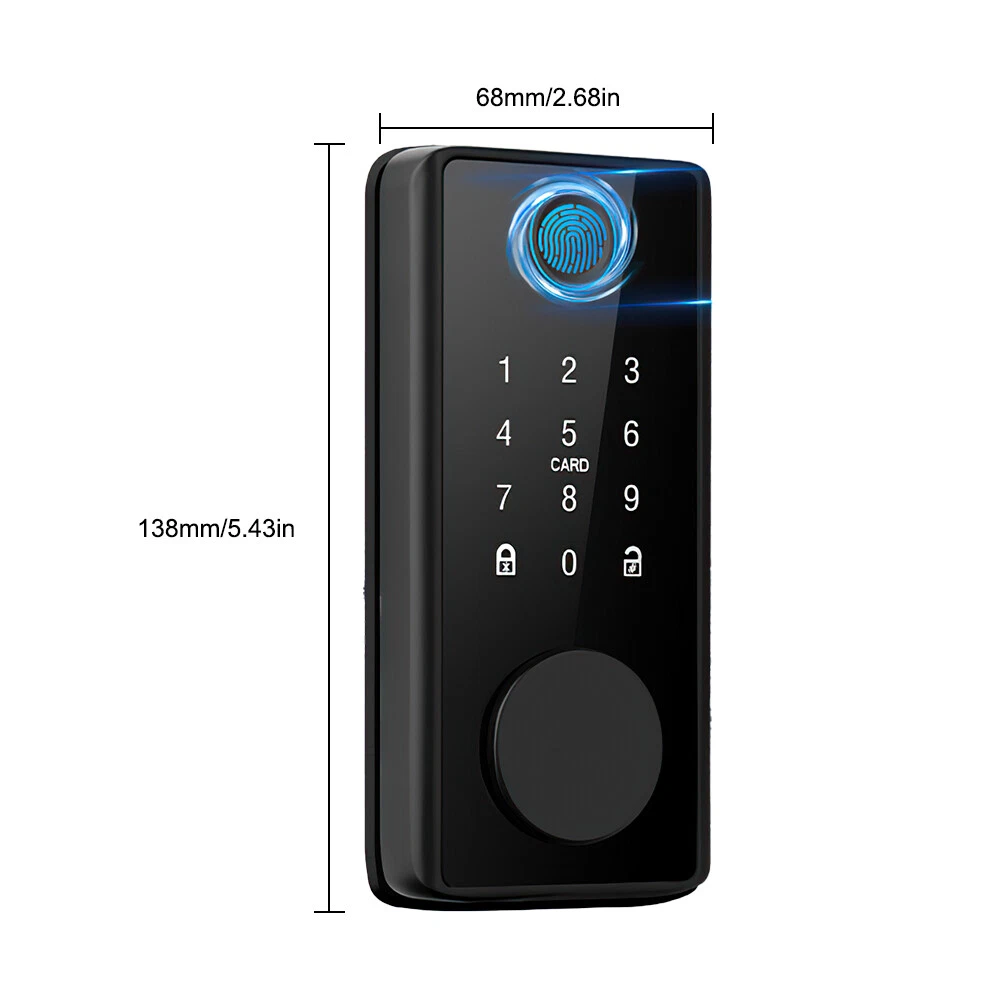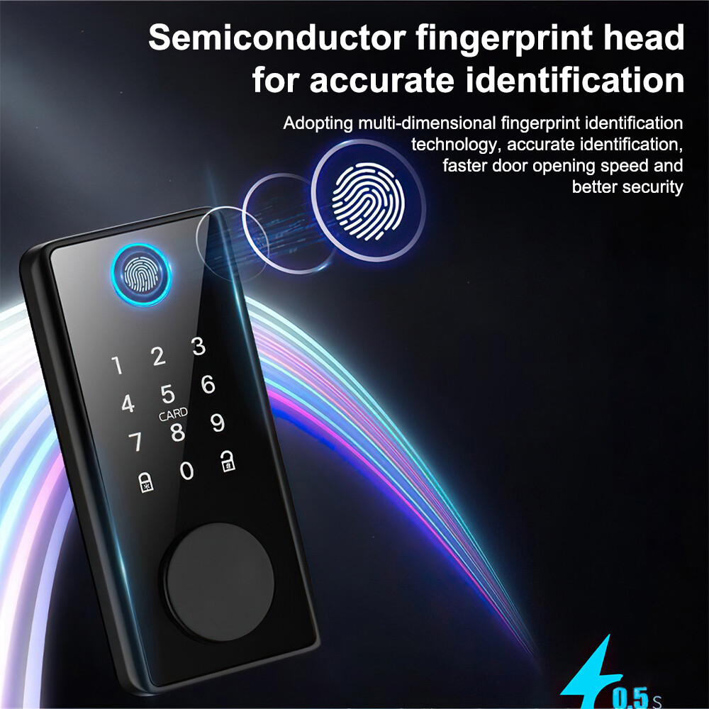 Product Details APP:TUYA Basic functions: fingerprint+password+IC card+key+graffiti app Fingerprint module specification: 108 * 108 Resolution: 508 Fingerprint recognition time:< 110ms Fingerprint capacity: 100 pieces Fingerprint power supply voltage: 3.3V Waterproof grade: ip65 Bluetooth transmission power: minimum -20DB maximum+4DB 5.0 Bluetooth Number of administrators: 3 Number of users: 197 fingerprints, 100 passwords, 100 cards, 100 Virtual password length: ≤ 16 bits Low voltage alarm: 4.7V ± 0.2V Static current: ≤ 60uA Dynamic current:> 250mA Power supply: 4 No. 5 alkaline batteries (provided by the customer) Standby duration:>8 months Emergency power supply: 5VDC USB Type-C interface Working temperature:- 25℃~70℃ Working humidity: 20% to 90% RH Working life:>100000 times Voice navigation: English/Chinese voice Error alarm: supports 10 consecutive trial and error attempts, locked for 1 minute Suitable door thickness size:> 33mm Lock body specifications: American standard 60, 70 adjustable About this item Smart Door Lock with APP Control:With a remote control from the Tuya APP, you can generate a temporary password and share it with your family and guests.Enjoy easy setup, access management, real-time notifications and event history.Suitable for homes, apartments, offices, and hotels M ulti-Mode Intelligent Management: With this door locks for front door, you no longer need to fumble for your keys or worry about forgetting them.Instead, you can use your IC card, a PIN code, or even your fingerprint to unlock the door effortlessly.It can also allow homeowners to create temporary access codes for guests or service providers, eliminating the need to be physically present to grant access to your home Auto Lock and One Touch Lock: When you unlock, you can lock the door with just one touch, providing convenience and speed. In addition, auto-lock of the deadbolt lock secures your door if you forget, locking automatically based on your time setting, whether the door is open or closed Enhanced Home Security: The fingerprint door lock's incorrect-try protection temporarily locks the system after multiple wrong attempts, deterring unauthorized access and enhancing your home's security.Additionally, this keypad lock features a low battery alarm and operates reliably in temperatures ranging from -4℉ to 131℉ (-20℃ to 55℃) Easy Installation:Compatible with most standard Deadbolts. Simple DIY installation. Golspark is on standby for you 24/7. For any questions regarding installation, app issues, or additional information about the keyless entry door lock, please feel free to reach out to us Note: Need 4 AA batteries for power supply(but not included) Product List Front panel+rear panel * 1+screws * 1+buckle plate+buckle box * 1+lock body * 1+card * 2+key * 2+screw package * 1+instruction manual * 1