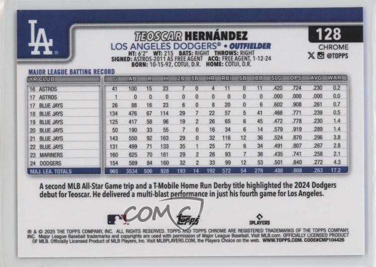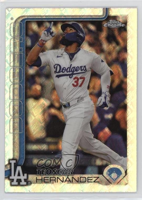 2025 Topps Chrome - [Base] - Topps Refractor #128 Teoscar Hernández - Baseball Card - Featuring the Los Angeles Dodgers - Featuring Teoscar Hernandez Search for more: 2025 Topps Chrome Search for more: 2025 Topps Chrome - [Base] - Topps Refractor View all of our Listings Auctions Buy It Now About Us Located in the beautiful Pacific Northwest, COMC (Check Out My Cards) is the world's largest consignment service for trading card singles. More than 10,000 people have used our consignment service to list over 50 million trading cards. Find out how we can help you consign your items on eBay by contacting us through eBay messaging. COMC -- "The Safe & Easy Way to Buy & Sell" Representative Image - Select Specific Item above to see image of actual item Representative Image - Select Specific Item above to see image of actual item Raw Condition for Modern Cards Unless otherwise noted, raw modern cards are listed in Near Mint-Mint condition or better. A NM-MT card appears to be Mint at first glance, but upon closer inspection, may exhibit some of the following: minor print defects (e.g. roller marks, print line, dimple), minor scratches, slight edge wear, and slight corner wear. Centering is clearly visible in the images provided and does not factor into our condition assessment. Raw Condition for Vintage Cards Unless otherwise noted, raw vintage cards are listed in Excellent condition or better. An EX card may exhibit some of the following: minor rounding of corners, surface wear, print defects, light scratches, and slight edge wear/chipping. Centering is clearly visible in the images provided and does not factor into our condition assessment. Domestic Shipping Combined shipping for multiple items is available. To receive combined shipping, please ensure all desired items are in your eBay shopping cart before proceeding to checkout. eBay limits orders to 40 items per order. We automatically combine multiple orders placed on the same day. If you place multiple orders on the same day, please contact us to request a refund of applicable shipping costs. Signature confirmation may be required on invoices over $400. All cards are protected and shipped securely. International Shipping COMC offers eBay's International Shipping (EIS) for international orders under $2,500* (see country exceptions below). All duties and import fees are paid at checkout; in the rare event that there are additional import fees upon delivery, these are borne by the buyer. EIS packages route through a shipping hub in Erlanger, KY before shipping to their final destination. Please note that EIS does not allow for combined shipments. The shipping rates are determined by eBay and cannot be adjusted. *Maximum sale price exceptions: Colombia, Kuwait ($2,000); Taiwan ($1,539); Chile, Costa Rica, Guatemala, Honduras, Trinidad and Tobago ($1,000); Antigua and Barbuda, Aruba, Belize, Dominica, Grenada, Philippines, Saint Kitts and Nevis, Saint Lucia, Montserrat, Turks and Caicos Islands ($500); Dominican Republic, El Salvador ($200). Please request a shipping quote through eBay messaging for orders that exceed the maximum sale price supported by eBay's International Shipping. You will be responsible for all duties and import fees for international orders shipped outside the EIS. All cards are protected and shipped securely. Payment COMC does not accept offers on our cards through our eBay storefront. COMC utilizes eBay’s managed payments system. If you are experiencing difficulties making a payment, please contact eBay for assistance. Return Policy Returns are only accepted on the rare occasion the item is not as described. If you are making a return, please initiate the return process through eBay so a mailing label can be provided for you. Prior to listing, our expert team carefully assessed this item to represent it accurately. Please review the description and high-definition images prior to purchasing to ensure this item meets your satisfaction. We welcome you to contact us if you have further questions about this item. Trust and Integrity COMC carefully assesses each item consigned to us to prevent fraudulent items from entering the marketplace. If you believe an item offered on COMC may be fraudulent, please contact us with details so we can investigate the issue. Items we determine are outside our supported items policy may be removed. Last Modified: 11/21/2025 2:54:40 AM PDT