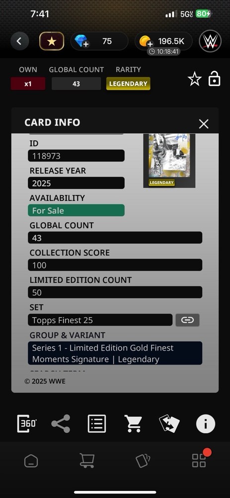 The product is a rare and highly sought-after 2025 WWE Topps Slam Digital trading card featuring Asuka, a legendary wrestler in the WWE league. This particular card is a Finest Gold Moment Auto, limited to only 50 copies, making it a valuable addition to any sports trading card collection. Manufactured by Topps, this digital card offers a unique and collectible experience for wrestling fans looking to commemorate Asuka's legendary moments in the sport. This is a digital card only, not a physical card. You will need a Topps Slam account in order to obtain this card. Message me your IGN after purchase so I can send it to you, thanks!