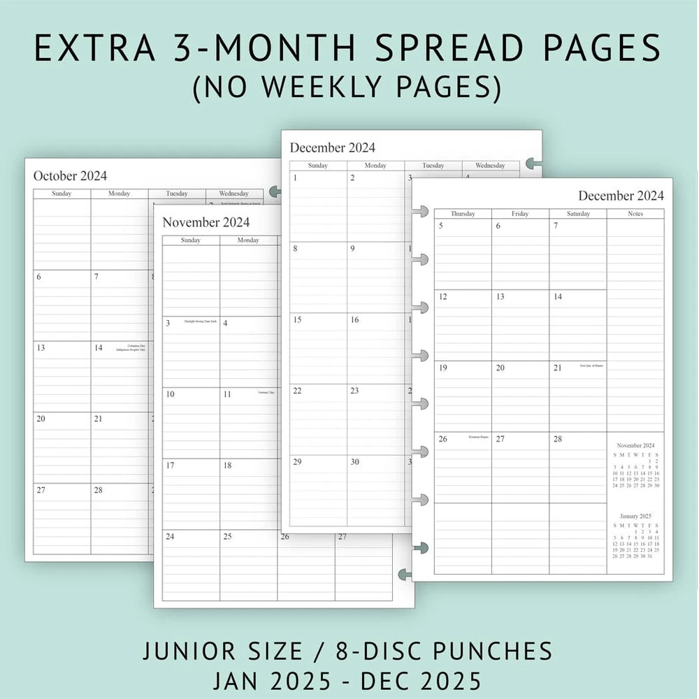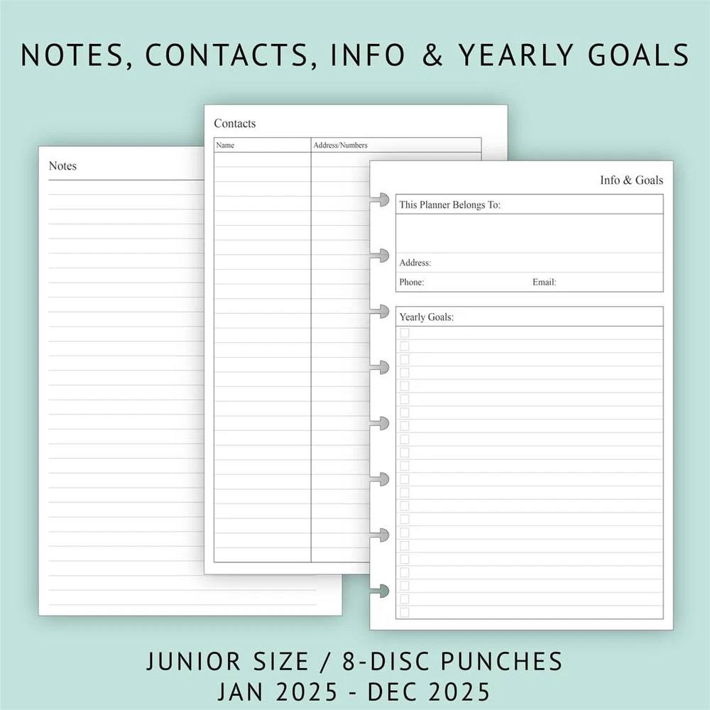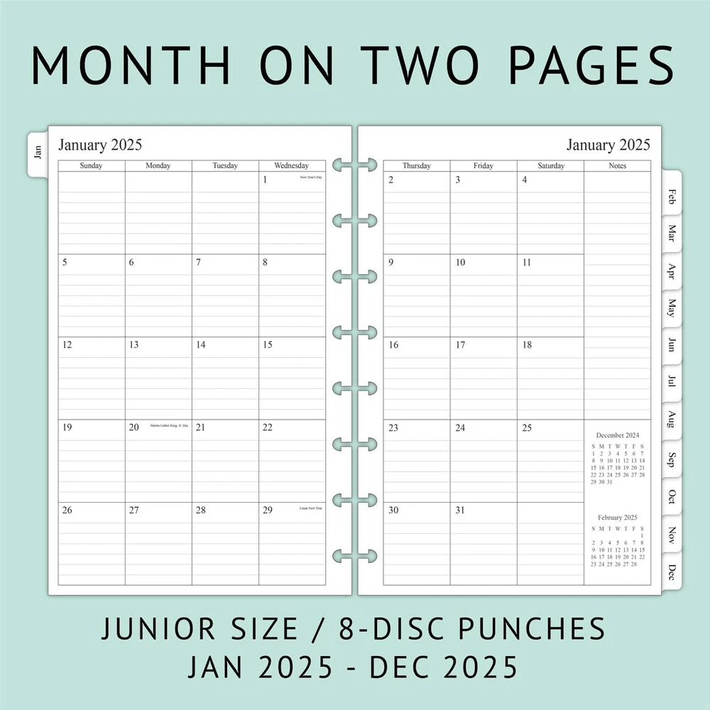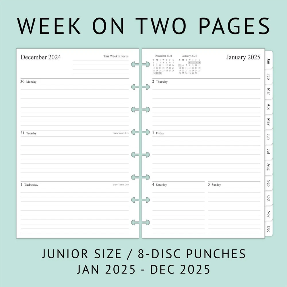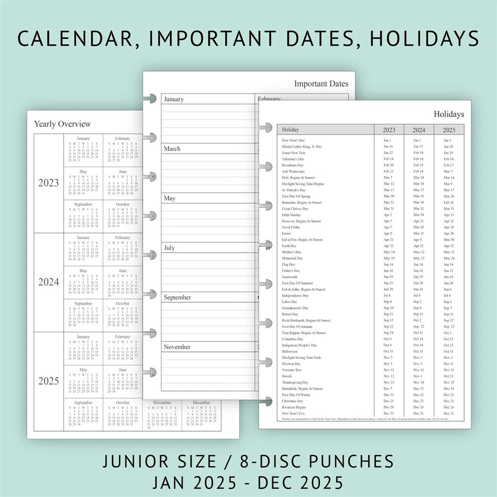 2025 Weekly & Monthly Planner Refill for 8-Discbound Planners, Two Pages Per Week, Junior Size, 5-1/2"x8-1/2" Refill your junior size 8 disc planners and keep organized with this 2022 weekly calendar refills that feature Tabs, Notes section, To-Do & Review pages. 8-disc punched planner refills compatible with Arc, Levenger, TUL junior size discbound planners 2025 year weekly pages run from January 2025 to December 2025 Weekly spread includes Week's Focus & 2-month calendar sections on the top and a Monday to Sunday format 2 page monthly spread with ruled daily blocks, calendar & notes section, laminated tabs to allow quick turning Additional pages: calendar & holidays, contacts, yearly goals and important dates pages, 3 monthly spread pages for early planning (Oct 2024 to Dec 2024, no weekly pages) Shipping from the USA All of our products are shipped from the USA, ensuring quick delivery to your destination. Payment We offer the following payment methods: PayPal, credit card, bank transfer, and eBay's secure payment system. Free Shipping & Free Returns Shipping within the USA is FREE. Additionally, any return is absolutely free for you. Risk-Free Purchase You have the option to return an item within 30 days without any justification. We cover the return shipping costs! Fast Shipping We ship immediately upon receipt of payment. Generally, the package is delivered within 2-3 days in the USA. If it takes longer, we will contact you. Quality and Costs Made in Europe, USA, China No customs fees or additional charges Total satisfaction guarantee Invoice with declared VAT available upon request in .pdf format Feedback Your feedback is very important to us. After you pay for your purchase, you will automatically receive positive feedback from us.