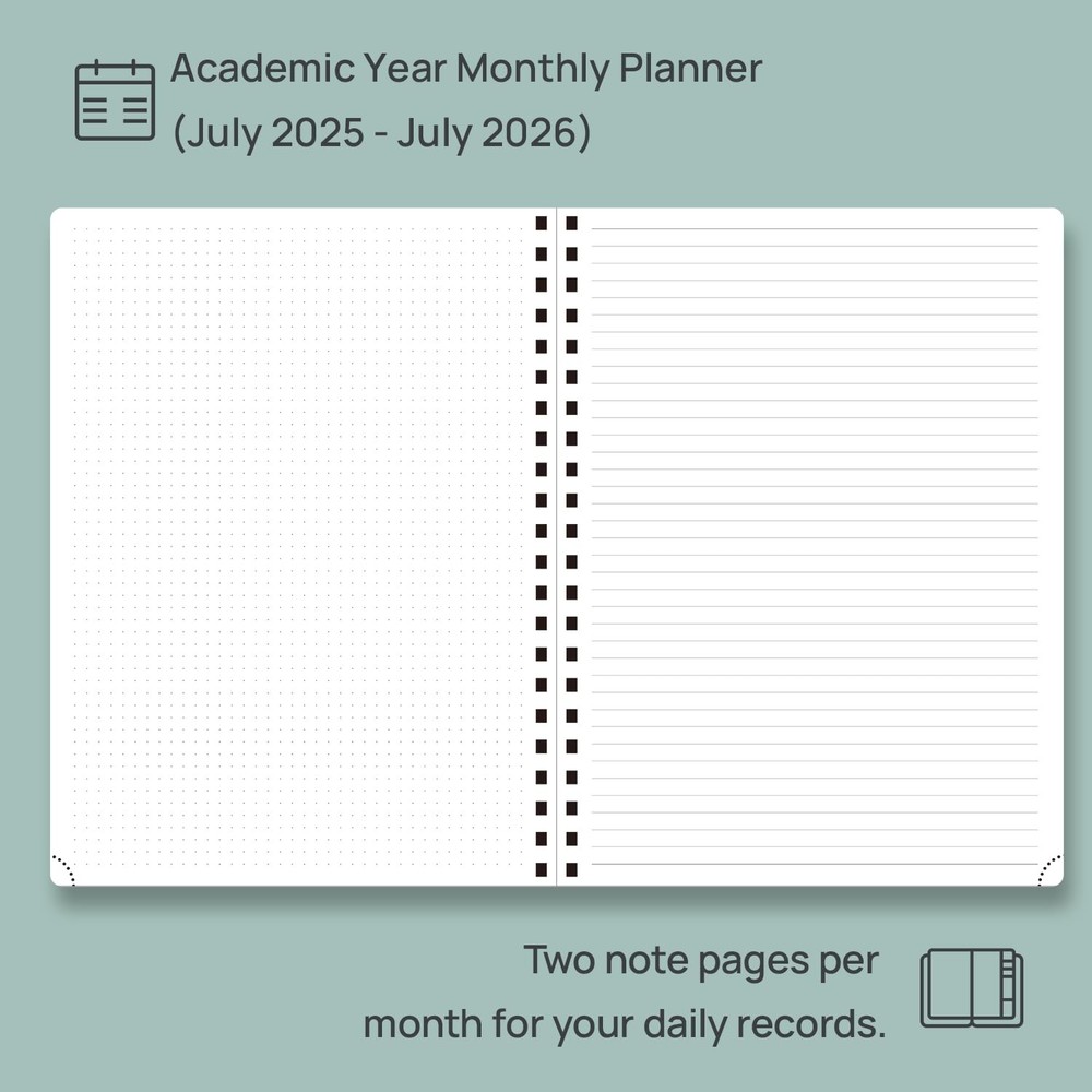 MONTHLY ACADEMIC PLANNER 13 MONTHS JULY 2025-JULY 2026 WITH SOFT COVER JULY 2025 - JULY 2026 ACADEMIC PLANNER: This planner covers 13 months of 2025-2026 academic year with an approximate A4 size(8.5'' X 11.25''), which permits large writting space. It is perfectly tailored for students to fit in with their school schedule. 2 PAGES PER MONTH: This 2025-2026 monthly planner (Jul.2025 - Jul.2026) presents a spacious and unique calendar-like design, each month has a 2-Page spread with dotted and lined notes to help you manage deadlines and goals effectively. BONUS FEATURES: The "TODAY" Ruler, Tear-Off Corners and Stair-like Monthly Tabs enable easy locating of the current date. Bookmark Ribbons are included to mark important pages.The Elastic Closure ensures the planner securely closed, while the self-adhesive Pen holder holds your pen. Additionally, 2 Foldable Pocket offers a convenient space to store important documents. EXTRA FUNCTION PAGES: This monthly calendar also contains "2025-2026 Yearly Overview" Pages + "2025-2026 Holiday & Calendar" Pages + Contact Pages + Password Pages + Dotted Notes Pages, providing space for recording important information and enhancing organization. THICK PAPER: The use of high-quality 100GSM paper from sustainable forests makes it silky smooth to write on and ink resistant, bringing you the ultimate writing experience.