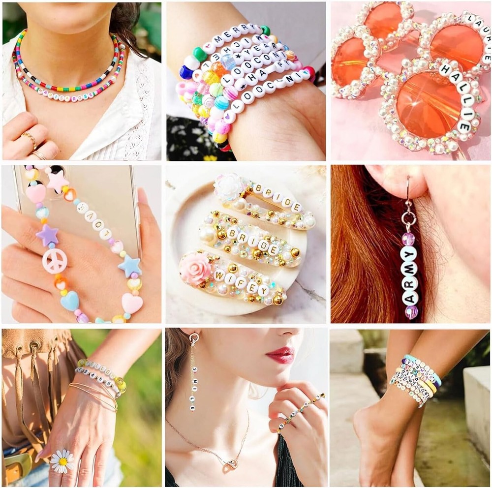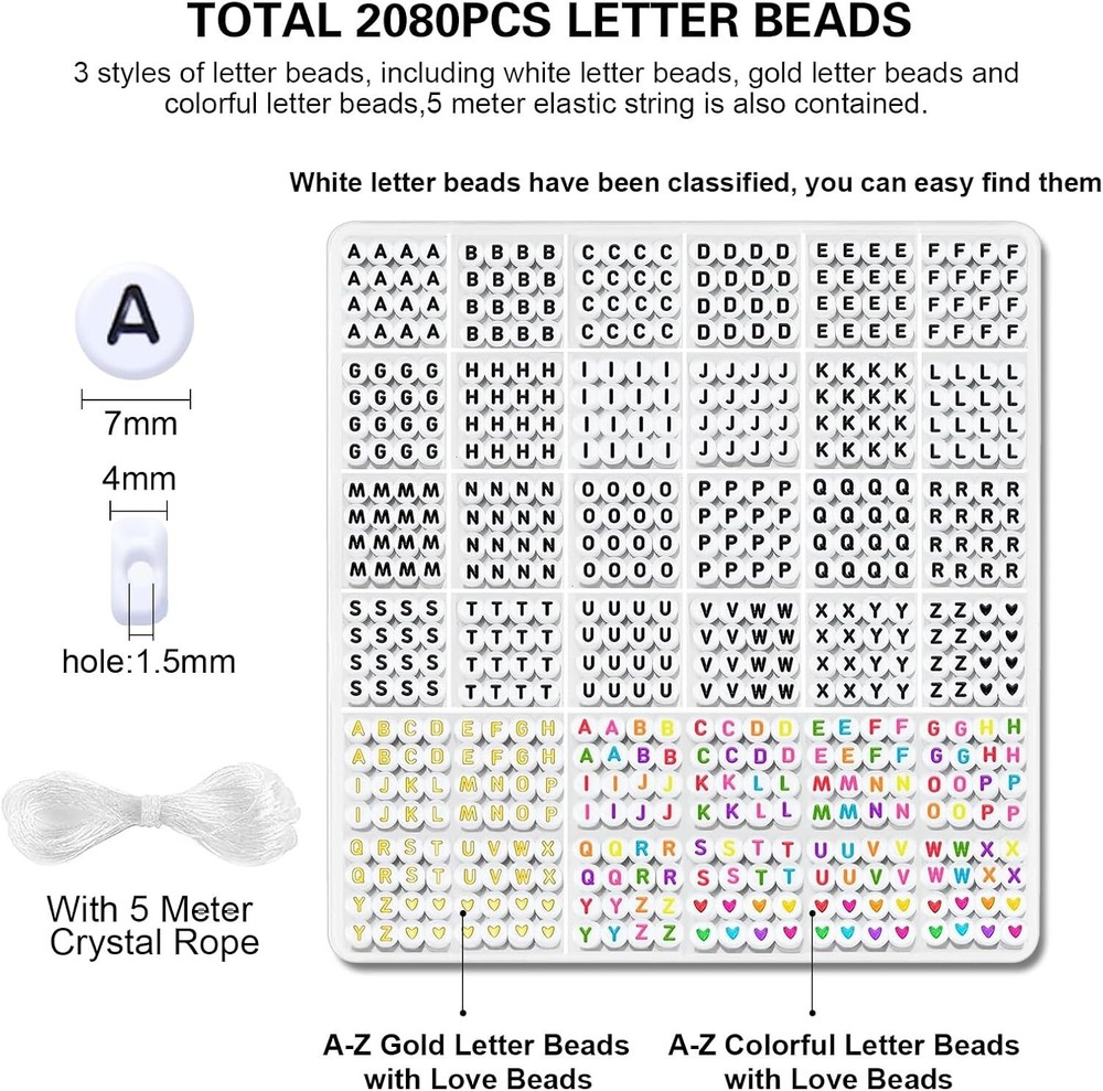 2080PCS Letter Beads 3 Colors A-Z Alphabet Beads for Jewelry Making Friendship Color: A1#White Material: Acrylic Size: Small Shape Round Item Weight: 300 Grams Number of Pieces: 2080 A total of 2080 letter beads. 3 styles of letter beads, including white letter beads, gold letter beads and colorful letter beads,5 meter elastic string is also contained. All of these helping you DIY a unique jewelry. Making someone a letter friendship bracelet is a great way to show them how much you care for them. Pick the word you want to express from the A to Z letter beads and give your christmas thanksgiving gift exclusive meaning. The cute stuff letter beads have been carefully classified and stored in the containers, you can effortlessly complete any intricate beading. Say goodbye to wasting valuable time search alphabet beads. Each delicate pattern letter beads is made of acrylic material and advanced paint spray & grinding technology results in smooth beads. It can perfectly combine with clay beads, pony beads and colorful beads, widely used in jewelry making, name bracelets, necklaces, keychains, other decoration, accessories, wedding crafts, stage dresses and etc. These letter beads will add new creativity to your design. Beads kit can be used to sorting matching games and alphabet bead activities. Beading craft helps promote hand-eye coordination, intellectual and fine motor skills. Return Policy: We offer a 30 day return policy from the receiving date. Please contact us for a Free Return Label. Please use our return label so it will go back to our supplier and we can do a refund or replacement afterwards. Feedback: Your satisfaction is very important to us! If you have any problem with your order, please contact us and we will do our very best to make you satisfied. As long as you are happy with your purchase, please leave a positive feedback for us. We will always leave you a positive feedback in return. If you have any problem with your purchase, please do not leave a negative feedback. Please Contact us ... and your issue will be solved quickly and positively We are a small family-owned business trying to make a living, not a huge company that does not care ... We will ALWAYS do our best for you!