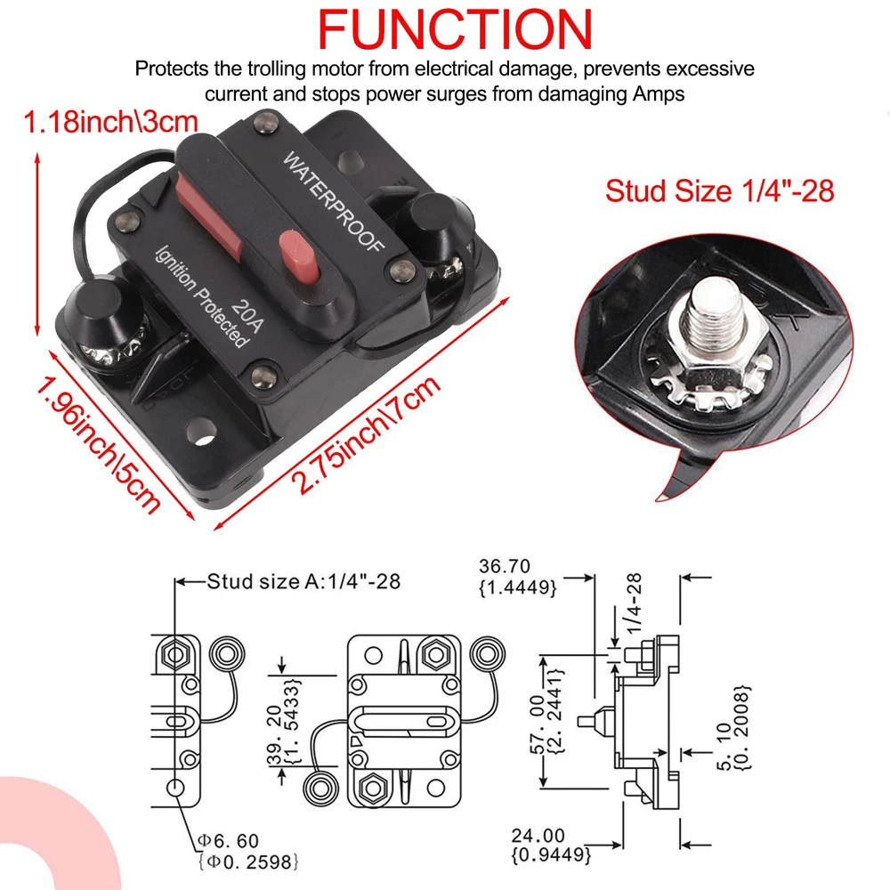 20A Manual Reset Switch Circuit Breaker Holder for Yachts and Marine Vessels DESCRIPTION Features: *20A Circuit Breaker wManual Reset: The visible reset lever indicates the open condition, and the unique push-button reset feature allows it to be used as a kill switch. The button on the circuit breaker can also serve as a master disconnect for circuits. *Breaker fuse holder protects your system: Designed for a wide range of DC system voltages from 12V to 48V, this 20A fuse holder is essential for protecting your system from over-current situations caused by high power draw, short-circuits, wiring mistakes, equipment faults or any other high current event. The mount cover provides isolation, making it splash and dust proof. *Premium material: The screw inside the breaker is made of alloy, efficient conductivity. The housing is made from thermal plastic UL rated 94V0, making it flame retardant. Additionally, it is water-resistant with an IP67 rating. The included waterproof cover further prevents rust on metal parts. *Easy to use: This 20 amp circuit breaker can be used as a direct replacement for an inline fuse holder in DC 12V-48V systems. It can be easily mounted on panels or firewalls for convenient access and usage. *Wide application: The 20 Amp circuit breaker is suitable for auxiliary and accessory circuits in various applications such as boats, marine vessels, RVs, yachts, batteries, trailers, buses, trucks. It can also be used in battery charges and DC sound systems. Specifications: *Product Name:20A Circuit Breaker Holder W/Manual Reset Switch *Material:Plastic+ Alloy *Size:As shown *Color:Black Package Content: 1 x Circuit Breaker Switch Note: 1. The real color of the item may be slightly different from the pictures shown on website caused by many factors such as brightness of your monitor and light brightness. 2. Please allow slight manual measurement deviation for the data. POLICES Shipping Payment WARRANTY We only ship to confirmed ebay Order addresses. Please comfirm that your Order address is in line with your shipping address. Please kindly note that the c ombined shipping is not provided because the shipping fee is calculated by weight. Also, the each additional item means exactly the the same color and size. It takes about 7 -15 working days to US; about 10-30 working days to other countries. Transit time may be a little delayed because of the bad weather and customs inspection . If you do not receive your item within 30 working days since payment finished, please contact us immediately for further assistance. Payment must be completed within 5 days. If you have any problems about payment, please contact us via ebay message. We strive for 100% customer satisfaction! Positive Feedback is very important to us. If you have any questions, p lease feel free to contact us via "Ask seller a question" . We will reply your email within 24 working hours.