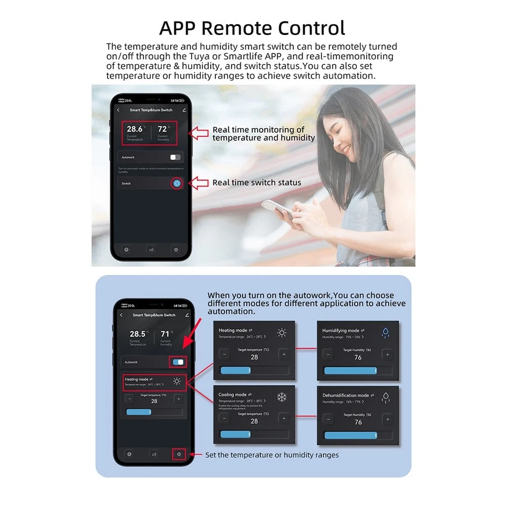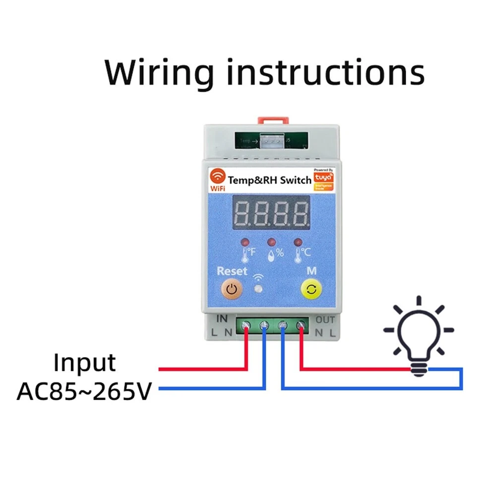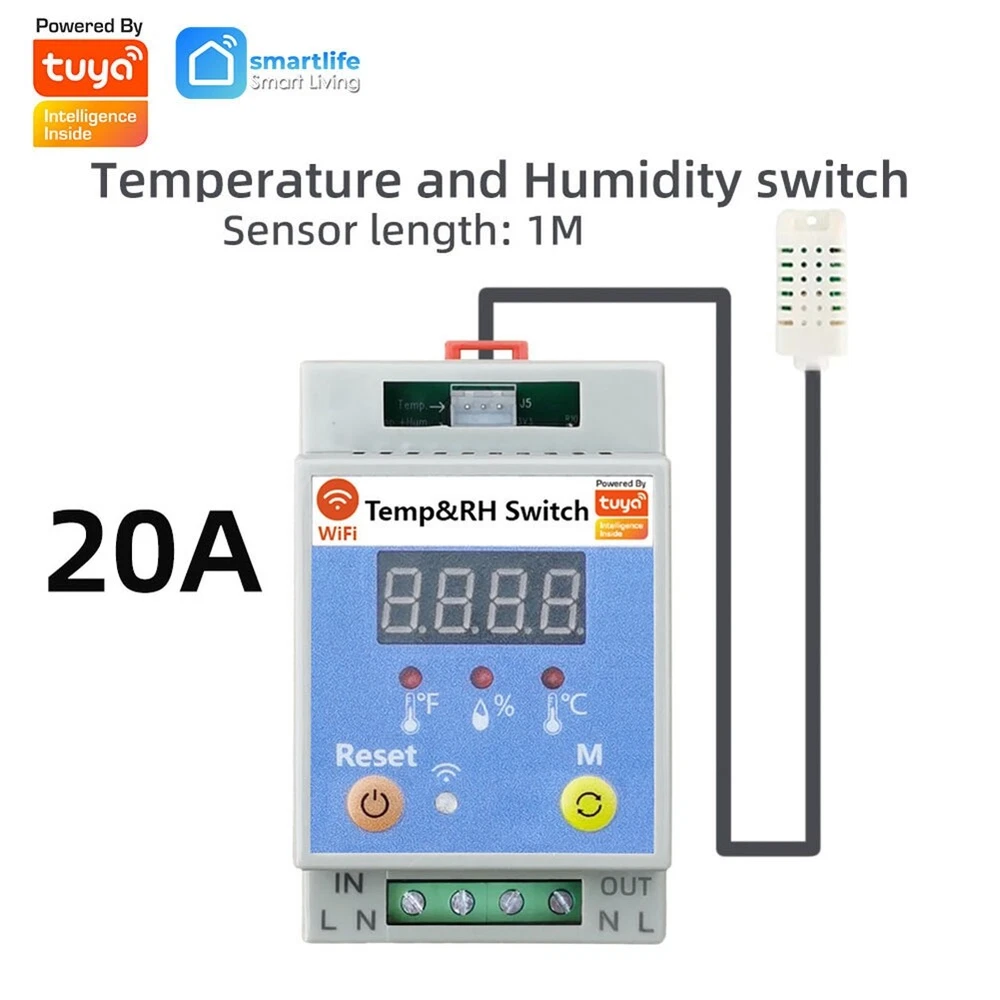 20A Tuya WiFi Temperature Humidity Switch Temp/Humidity Control9426 [Integrated Management System]: With the ability to remotely turn on/off the switch and soil conditions via the Tuya or Smartlife APP, users gain real-time into environmental parameters. This allows for precise adjustments and automation based on predefined settings, enhancing the convenience and efficiency of managing various environments such as greenhouses, homes. [Data Analytics & Historical Data Statistics]: Users can obtain detailed statistics fluctuations over time, providing valuable for optimizing environmental conditions, perfect for scientific research, agricultural planning, and so on. [Flexible Automation & Customization]: The device supports setting specific thresholds to trigger automated actions. Whether it's maintaining proper conditions for plant growth, ensuring comfort in living spaces, or regulating water temperatures in aquariums, it adapts to various needs through customizable modes and timing schedules. [Device Sharing & User-Friendly Collaboration]: Device sharing allows you to share control of the device with family members or cooperative workers for collaborative management of shared spaces. Multiple users can observe and adjust settings remotely, promoting cooperative maintenance of appropriate environmental conditions. [Voice Control & Wide Compatibility]: With high compatibility, it is compatible with for Alexa and for Assistant for voice control, allowing you to control the switch simply by using your voice. 20A with 1m temperature & humidity wire:142.1g/5.01ounce Due to different batches, there may be differences in product appearance, color, and printed text, which not affect the use. Colour:White & Blue Material:ABS Package Contents: 1 * Tuya WiFi Temperature Switch