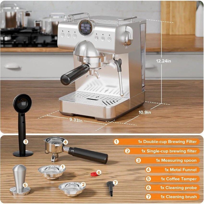 About this item 【Hot & Cold, One-Touch Switch】 The coffee maker is equipped with a 20-bar professional pressure system, allows you to switch between cold and hot brewing with just one touch. With this powerhouse in your kitchen, every day becomes a new coffee adventure. 【Smart Guidance for Effortless Brewing】 The intuitive LED display of the espresso machine monitors the brewing time, temperature, and pressure in real-time. With step-by-step guidance from single/double cup icons, even coffee beginners can easily make rich and aromatic coffee, enjoying the fun of professional coffee making. 【Professional Milk Frothing for Creative Latte Art】 The automatic coffee machine is equipped with a powerful steam wand that produces smooth and creamy milk foam. It allows you to easily make lattes, cappuccinos, and create creative latte art like hearts and clouds, adding a romantic touch to your coffee. 【Energy-Saving Sleep Mode for a Worry-Free Experience】 After 25 minutes of inactivity, the expresso coffee machine automatically enters an energy-saving standby state, turning off the display and cutting off the power supply, reducing energy consumption. It's both environmentally friendly and cost-saving, and can be quickly woken up by pressing any button. 【Portable Design for a Thoughtful Experience】 The espresso maker features a 1.5L detachable water tank for easy refilling, a built-in cup heating system on top to keep your coffee at the optimal temperature, and a compact body that saves space and is easy to operate. It also comes with professional accessories and cleaning tools, providing a perfect coffee experience in every way. 1---Please feel free to contact us through eBay Message ifrou have question,such as tracking number,shipping statusct.. 2---Please DON'T GIVE NEGARTIVE or NEUTRAL REVIEW or OPEN ANY CASES before contact us through ebay inbox. 3---Sometimes we may send small gift for you,please keep it if you get some gift from us.And hope you like it. 4---To offer best service,sometimes we will update the status of your order,please check your ebay inbox time by time. Anyway,thanks so much,enjoy shopping.