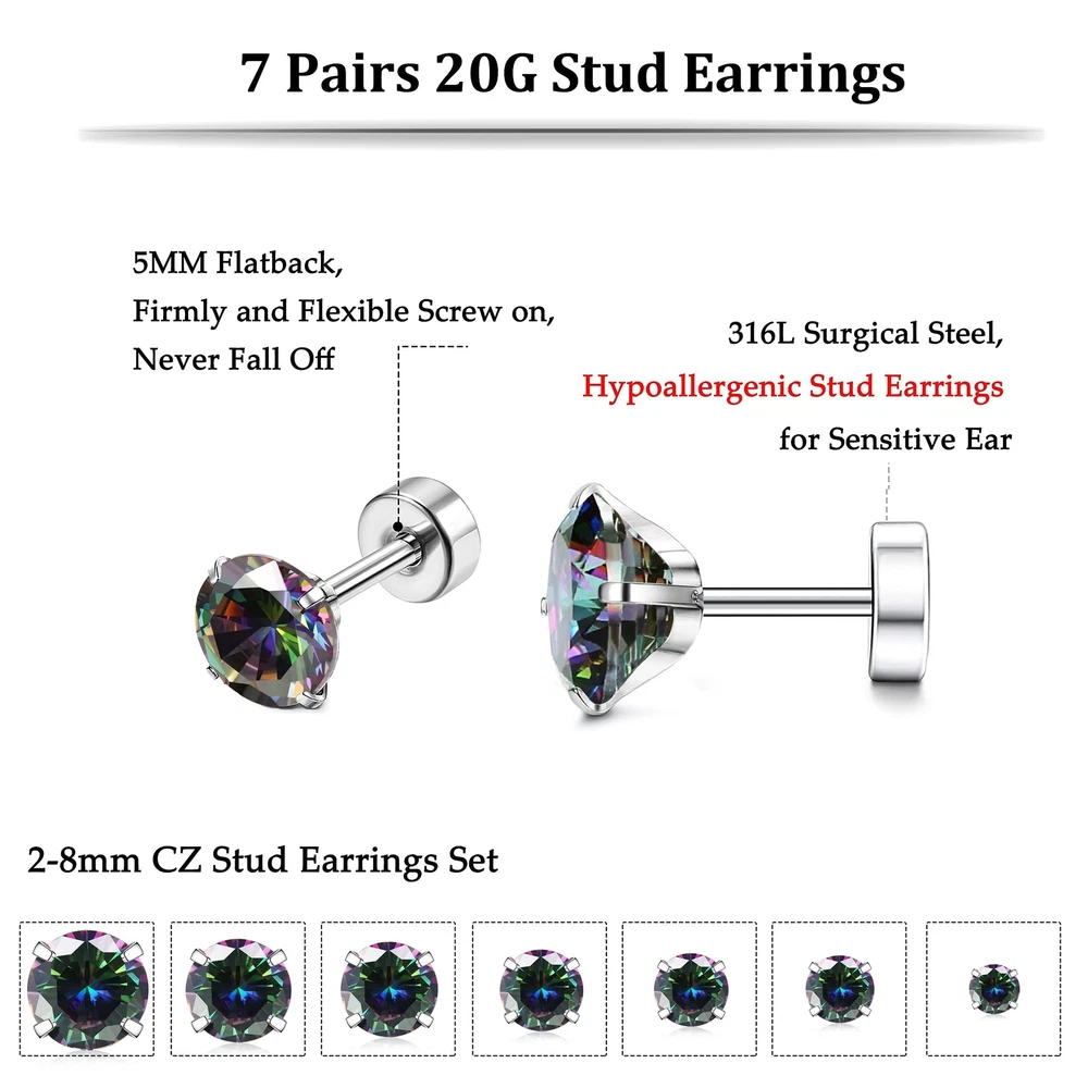 20G Hypoallergenic Flat Back Earrings for Women Men Silver 14K Gold Stainless Steel Stud Earrings Brithstone Cubic Zirconia Studs Surgical Steel Cartilage Earrings for Sensitive Ears 7Pairs Multi Size Stud Earrings :1 Set=7 pairs stud earrings, comes with 7 different sizes round cubic zirconia, 2mm, 3mm, 4mm, 5mm, 6mm, 7mm, 8mm are available, more choices for daily wear. Meet your needs in multiple sizes Hypoallergenic Earrings for Daily Wear : 20 Gauge(0.8mm), with 5mm flatted back end; made of 316L durable stainless steel, nickel free and lead free, never rust and never turn your ear green, hypoallergenic ear piercing for sensitive ear Flatback Stud Earrings : Flatback design for protect skin from painful pokes, can be wear in sleep or sport; Classic barbell design with shiny cubic zirconia well inlaid, simple and delicate. Excellent internal screw thread, firmly screw on and flexibly screw off Comfortable to Wear : Highly polished finishing and strict metal electroplating craft makes super smooth and shiny surface, comfortable to wear. 2-8mm Clear cz flatback earrings, also can be used as tragus piercing, helix piercing, cartilage earrings 365 Days After Service : Enjoy a 365-day after-sales service of . If you have any questions, please feel free to contact us by email. We will solve your problem within 12 hours. Hope you can enjoy shopping in our store Notice: Please check the tightness of the back before exercising and sleeping, which can reduce the probability of the back of the ear falling off, and can make the service life increase Shipping We offer FREE shipping on all orders! We ship within Three business days of payment, usually sooner. We use a selection of shipping services such as UPS, FedEx, USPS etc. We only ship to the lower 48 states, no APO/FPO addresses or PO Boxes allowed. Local pickups and combined shipping options are not provided at this time. Return You can return a product for up to 30 days from the date you purchased it. Any product you return must be in the same condition you received it and in the original packaging. Please keep the receipt. Payment We accept payment by any of the following methods: PayPal Please pay as soon as possible after winning an auction, as that will allow us to post your item to you sooner! Feedback Customer satisfaction is very important to us. If you have any problem with your order, please contact us and we will do our best to make you satisfied. Contact Us If you have any queries, please contact us via ebay. We usually respond within 24 hours on weekdays. Please visit our eBay store to check out other items for sale! Thank you for shopping at our store.