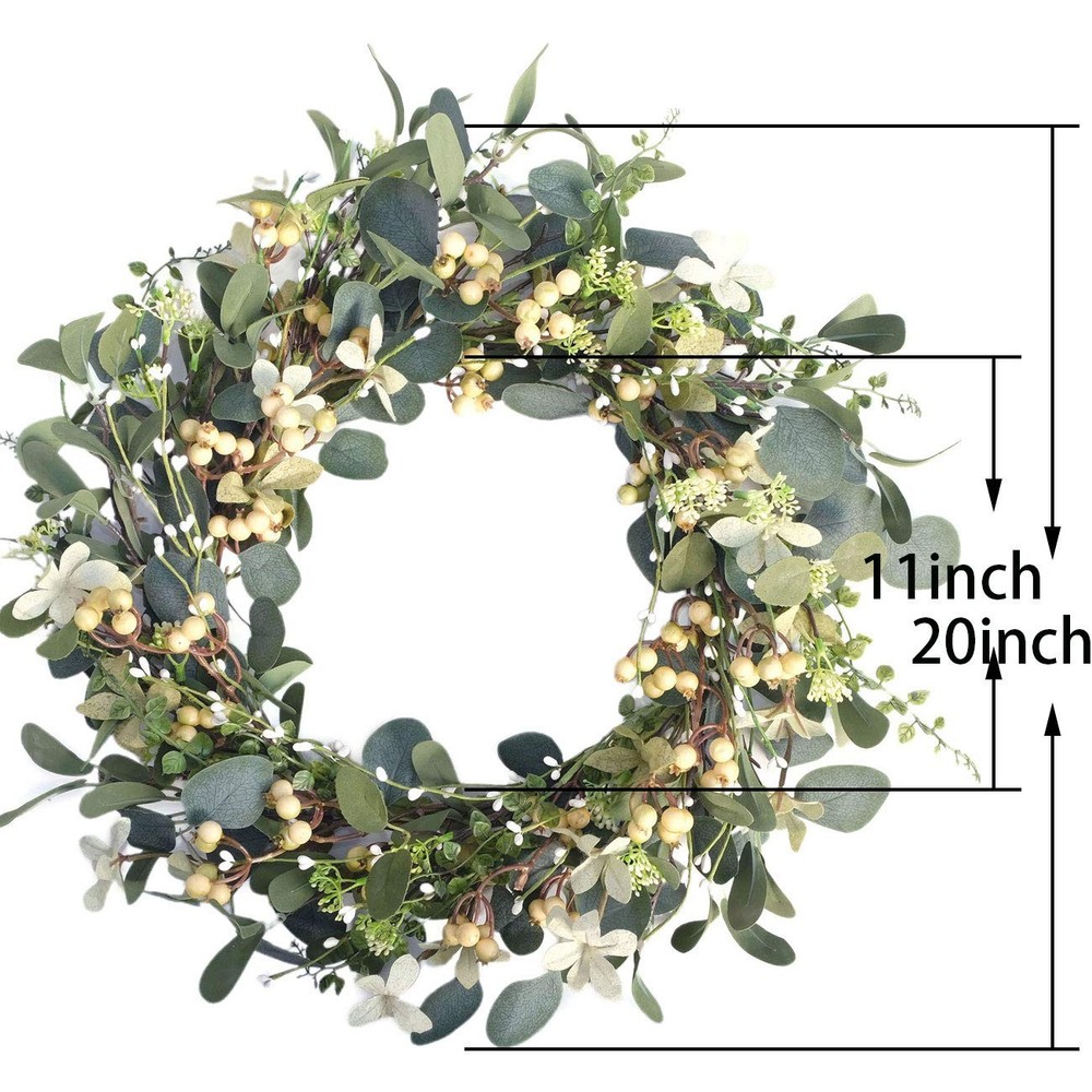 【Moderate Size】:The wreath has a fully expanded diameter of 20 inches. Due to transportation needs, the wreath is slightly compressed and placed in the packaging box. Please do not worry, all branches on the wreath can be adjusted or bent, allowing you to easily shape the wreath to achieve the desired size and appearance 【Delicate and Natural】:The eucalyptus berry wreath features a realistic and exquisite appearance, as if freshly picked from nature. With evergreen leaves as the base, adorned with plump berries and delicate wildflowers, the entire wreath is a perfect display of natural beauty, bringing a vibrant energy to your home decor 【Sturdy and Durable】:The base of the evergreen front door wreath is made of an iron ring, which is solid and not prone to falling off, ensuring lasting stability. All decorations are securely tied and will not easily come apart, allowing you to easily hang the wreath wherever you desire. The fresh colors make the wreath suitable for every season, and you can use it all year round 【Multi-functional Decoration】:The elegant and simple wreath can be used to decorate front doors, walls, windows, or above fireplaces. It is also suitable for a variety of occasions, including indoor or outdoor seasonal holiday decorations, wedding decorations, parties, farms, shopping malls, classrooms, or as a shooting background. Its versatility ensures that you can enjoy its beauty in various settings 【Usage Suggestions】:We recommend using the wreath indoors and in covered outdoor areas, avoiding prolonged exposure to sunlight and rain; the wreath does not require special maintenance and can maintain a fresh texture and color all year round; if you have any questions, please , and we will provide you with a satisfactory response