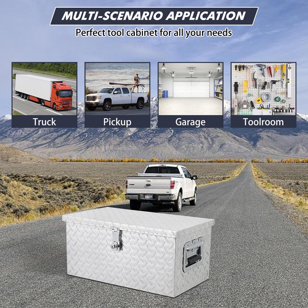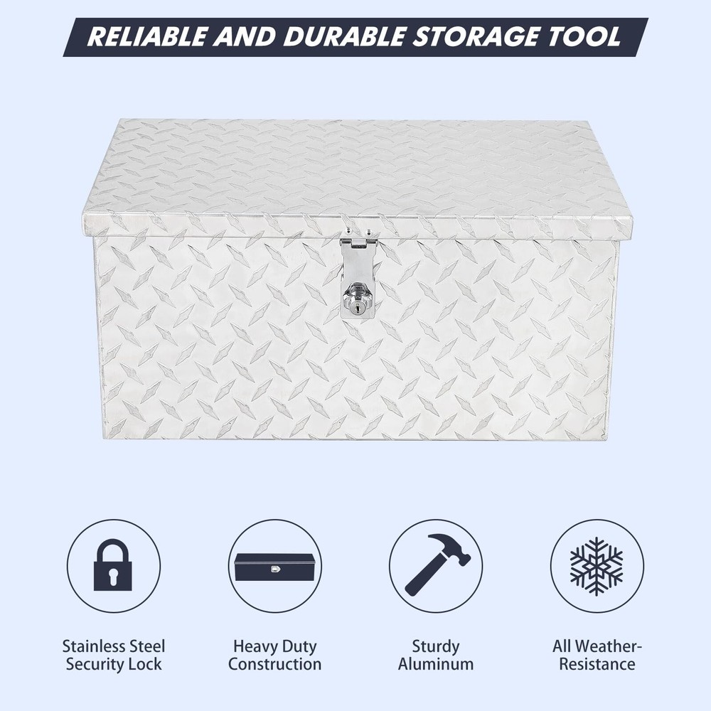 About this item STURDY AND DURABLE: This truck toolbox is constructed with high-density aluminum and a non-slip surface while being highly resistant to oxidation, ensuring it maintains an attractive appearance and stable performance in harsh environments over time. SPACE-SAVING STORAGE: This spacious trailer toolbox measures 20 x 12 x 9.5 inches, providing plenty of room for buckets, maintenance tools, fire extinguishing canisters, warning signs, and other items in your truck. It's versatile and can be used in pickups, trucks, trailers, RVs, and even at home. You no longer need to worry about misplacing small objects with this toolbox. SECURE AND PROTECTIVE: A stainless steel latch keeps your tools and supplies secure, protecting against theft and weather elements. Fully welded seam construction and a weatherproof seal allow this toolbox for trucks to protect your stored items from the rain in all types of harsh weather conditions. LIFT WITH EASE : Features wider carrying handles on both sides, making the tool box easy to grip even with gloves on. Moreover, it comes with an easy-to-open-and-close gas strutted notched lid to assist with opening and closing, hold the lid in place and allow for a soft close. Making it easy for you to access what you need at any time. WIDELY USED: Not only does this toolbox provide ample storage for your tools, it can also be used to store camping supplies, extra accessories or holiday items. Perfect for use at home, in the garage or at work. Product Description STAINLESS STEEL LOCKING MECHANISM The rotating two-position latch helps prevent theft and weatherproofing, and the full weatherproof seal prevents moisture inside the case and on your equipment, protecting your belongings in every way. THOUGHTFUL AND PRACTICAL DESIGN 2 chain to maintain lid opeaning angle and handles on both sides for easy access. Our toolboxes are dedicated to providing you with a convenient and comfortable experience. VERSTAILE USE This toolbox provides ample storage for not just your tools, but can also be used to store camping supplies, extra accessories, or holiday items. Perfect for use at home, garage, or jobsites. Payment Delivery details Terms of sales About us Contact us Payment We accept payment either via PayPal or any of the following credit cards; Visa, MasterCard, Discover, and American Express. Delivery details 1. We will delivery out at the handing time when we receive the payment. 2. The delivery time is 3-5 business days to US by usually time.The parcel maybe delay 1-2day of the weekend.Due to the bad weather,Holidays,Hot Season ect.the parcel maybe delay,If you have any problems,mssage us,we will try our best to solve it. 3. We ship to your eBay address. Please make sure your eBay address is correct before you pay. 4. If you want to change the shipping address,message us before our send out. Terms of sales If you are not satisfied with the item for any reason, please do not quick to leave negative/neutral feedback even open request and case without any communication with us. We devote ourselves making EVERY CUSTOMER in 100% Satisfactory and resolve any problem. Thank you for your understanding and recognition,we are always leave positive feedback to all our customers. About Reply: All replies will be sent to your email box, if you do not get response within 24 hours (Sat. & Sun. excluded) please check your eBay My Messages in case that our emails will be filtered automatically by your settings. About us automobilee-01 is a brand new store but we are one of North America’s top online suppliers of specialized, high-quality aftermarket online retailers and suppliers, committed to developing new markets. We primarily offers tool sets, auto parts, home goods, etc..With over 20 years of product selection and manufacturing experience, we delivers unparalleled quality, value, service and satisfaction. Our highly-trained, professional staff offer in-depth knowledge and personalized assistance for customers worldwide. Providing our customers with a simple, hassle-free experience with best-in-class customer service is more than a goal. Contact us Any problem please rest assure to contact us by eBay message first. We will reply you as soon as we can. We will deal with it within 24hs on working days. Brand Unbranded Type Tool Box Features Lockable, Waterproof Number of Items 1 Material Aluminum Number of Drawers 1 Model Tool Box MPN Does not apply Color Silver Country/Region of Manufacture China Manufacturer Warranty 5 Years Shape Rectangular Item Length 20 in Item Width 12 in Item Height 9.5 in Item Weight 10.36 pounds