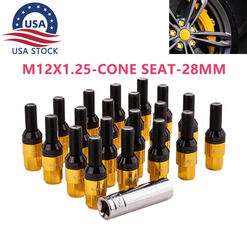 20PCS 28mm M12x1.25 Wheel Lug Bolts Cone Seat Studs Set for Jeep Chrysler Gold