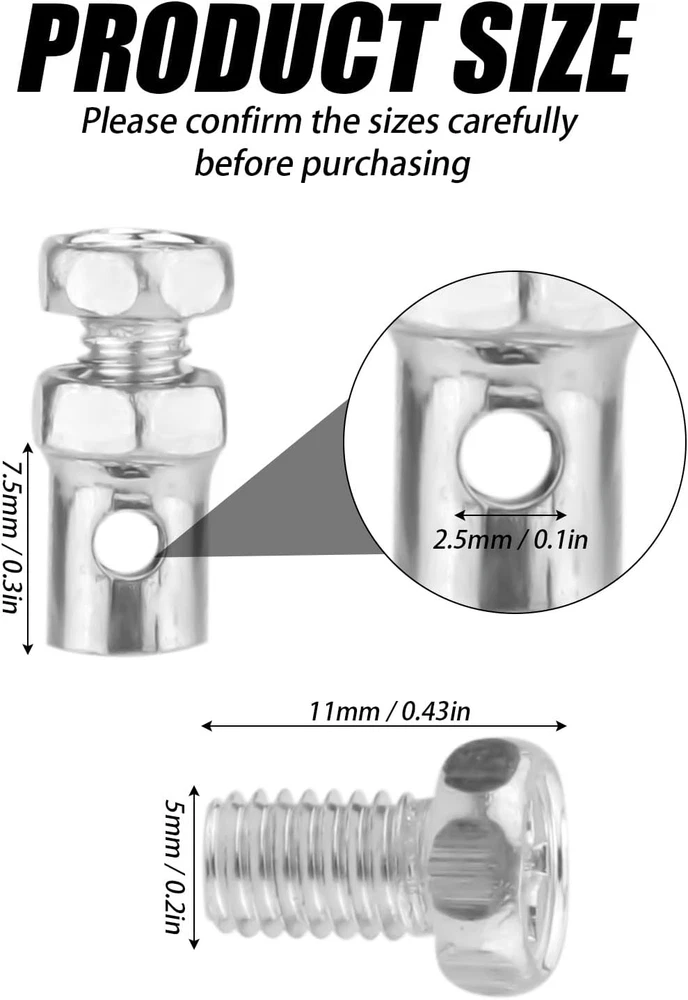 Store New Arrivals Add to Favorite View Feedback Contact 20Pcs Universal 1/8" Clutch Brake Throttle Cable Ends, Go Kart Throttle Cable Description Item model number 06057 Part Number 132895 Batteries Required? No Color Silver Product Dimensions 2.76 x 2.05 x 2.05 inches Country of Origin China Item Weight 2.89 ounces Size Medium Package Content: You will receive 20 pieces of throttle brake cable locks to repair old and broken brake cables. They have strong compatibility and can fit most bicycles, motorbikes, scooters, go-karts, etc. Product Size: The cable hole measures about 1/8" (0.32cm) in diameter, and suitable for 1/8" throttle brake cables. Reliable Material: Our throttle cable ends are made of premium stainless steel, strong, waterproof and durable, practical and reusable. They will work well and provide great user experience. Easy to Install: Pass the brake cable through the hole on the brake cable stop and then tighten the screw from the end to secure the brake cable stop to the cable. Wide Application: These throttle brake cable ends can be widely applied for bicycles, motorbikes, motorboats, motorized bikes, go-karts, lawn mowers, tractors, scooters, etc. Specification: Color: silver Material: stainless steel Product Size: as shown in the detail picture Package details: 20 x throttle brake cable ends Note: Due to manual measurement, the size and weight may have a certain error. Due to the difference between different monitors, there may be a slight color difference existed. ABOUT US We offer the best prices around on high quality products. Our E-store includes media such as books, movies, music and games while offering electronics, toys, sporting apparel, clothing, tools, general home, garden items and more. SHIPPING We are always working hard to ensure your package arrives as soon as possible. Please understand that some factors like weather, high postal traffic, and the performance of shipping companies are outside of our control. We offer free shipping to the lower 48 states and ship within 2 business days of payment, usually sooner. We do not accept P.O. Boxes. Please provide a physical address. RETURNS We offer a 30-Day Return Policy on items which you are not completely satisfied with. You have the option for a full-refund or an exchange of the item. No returns are available on items shipped outside of the USA. PAYMENT We accept PayPal. CONTACT US This page content is yet to come Please ad us to your favorite seller and visit again later Thank You CUSTOMER SATISFACTION We try our very best to make sure every customer is completely satisfied. If there's a problem, message us! We're happy to help.