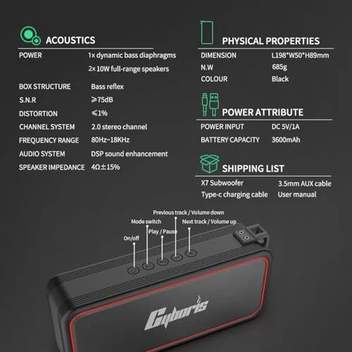 CYBORIS Portable Bluetooth Speaker, Wireless Speakers with 20W HD Sound, IPX7 Waterproof, Bluetooth V5.3, Dual Stereo Pairing, 30H Playtime for Home, Outdoor, Travel, Party, Beach 【HiFi Loud Stereo Sound】Experience pristine audio quality with our portable speakers. Utilizing advanced audio processing technology, 20W dual speaker drivers, and a powerful amplifier module, these speakers deliver impeccably balanced sound without any distortion. 【Updated Bluetooth V5.3】The Cyboris wireless Bluetooth speaker features an upgraded Bluetooth 5.3 signal, ensuring a stable connection up to 100 feet even in challenging conditions. Its advanced chip easily reads music playlists and connects seamlessly with devices like smartphones, TVs, and laptops. With support for U Disks, and AUX-in, this versatile speaker is perfect for travel, parties, and home use. 【30H Playtime Function】With a high-quality rechargeable Li-ion battery, the wireless portable Bluetooth speakers offer an impressive 30 hours of playtime at 50% volume. They are a must-have in your life, providing uninterrupted entertainment. 【Wireless Stereo Pairing】Elevate your party to the next level with the Cyboris wireless speakers' wireless stereo pairing feature. By connecting two speakers to a single device, you can enjoy immersive stereo sound and double the volume for a bolder audio experience. Create a captivating atmosphere and amplify the party vibes with this convenient and powerful wireless stereo pairing capability. 【IPX7 Waterproof for Outdoor Adventures】The IPX7 Bluetooth outdoor speakers waterproof is built with a sturdy and rugged design, ensuring its resilience in various outdoor conditions. Whether it accidentally drops in a puddle, gets caught in the rain, or faces exposure to the elements, this speaker is designed to withstand it all. With its waterproof capabilities, you can enjoy your music whenever and wherever, making it an ideal gift for family or friends who love outdoor activities. SHIPPING Domestic Buyers - We have confidence in our products, but if you are not fully satisfied please contact us within 30 days of purchase and you will get full refund. - We ship within 3 business days of payment, usually sooner - We offer FREE shipping on all orders! - We only ship to the lower 48 states, no APO/FPO addresses or PO Boxes allowed International buyers – please note: Import duties, taxes, and charges aren't included in the item price or postage cost. These charges are the buyer's responsibility. - Please check with your country's customs office to determine what these additional costs will be prior to bidding or buying. * Order Cancellation Policy ** You can return a product for up to 30 days from the date you purchased it. 1. The seller reserves the right to cancel the special case only due to eBay cancellation fee. 2. The decision of seller is the final. 3. The seller will respond to the cancellation request within 2 business days. Please wait for the result of cancellation. 4. In case the cancellation is not completed by some reasons, the buyer can follow the options below to get the refund. 4.1 The buyer can reject the item when it arrives. 4.2 The buyer can send the item back to the seller within 30 days If the buyer receives item (USA Shipment ONLY). The seller will provide the FREE return label to the buyer when the buyer opens " Return Item" case on eBay by using the reason as "Change my mind" ONLY. 5. When buyer has placed the order. The order will be processed and completed by automatic warehouse system within 5 minutes. In case that buyer sends the cancellation request after 5 minutes of placing the order, the request will be rejected. **Sending direct message to cancel the order is not allowed for every case.* Return Policy For the return case - If buyer would like to return the items for refund or replacement, please CONTACT SELLER to receive the free return label from seller. The refund or replacement will be processed with the tracking number of return label which is provided by seller only. The other ways of return which are not approved by seller will not be processed for the refund or replacement.