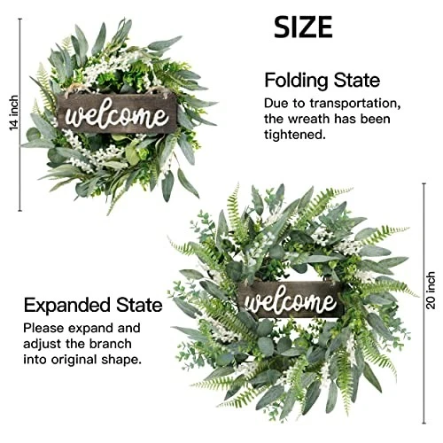 Menu 1. We require immediate payment. 2. We currently accept payment via eBay managed payments only. 3. Once payment is cleared, we will dispatch your shipment within 1-3 business days. Please refer to the "Shipping" tab for more information regarding shipping speed to your destination. Green Artificial Eucalyptus Wreath with Welcome Sign 20in Mixed White Berries Spring Summer Wreath for Front Door Wall Window Farmhouse Festival Porch Patio Garden Decor Product description HIGH QUALITY WREATH: This green eucalyptus wreath is made of silk, plastic and wood. The base is durable grapevine full of faux silk eucalyptus leaves and clusters of realistic berries. The entirely realistic wreath has bright color and vibrant looking, the 3D wood alphabet makes this wreath more texture and romantic. PROPER SIZE: 14inch when you received is folding state but you will get a 20 inch wreath after fluffing. Since the wreath is packed in a relatively small box to satisfy transportation, you need to expand the branches and adjust leaves into best shape and you'll get a 20 inch full wreath of enough size. VERSATILE DECOR:This artificial eucalyptus wreath is suitable for front door, wall, indoors,outdoors,window,fireplace,farmhouse, living room, porch, centerpiece party, wedding, holiday and festival celebration. It will provide your home a feeling of natural and vitality. EASY CLEAN: This spring summer wreath is convenient to clean, just wipe it with a try towel to make the wreath like brand new. The green leaves and branches are not easily falling apart. This wreath can be used for a long time. ATTENTION: The wooden sign is separated from the wreath, but the welcome sign can be stuck to the wreath for easily hanging on the door, please find the last picture for your reference. Please don’t hesitate to contact us if you have any questions, we will try our best to help you! PLEASE MESSAGE US IF YOU HAVE ANY OTHER QUESTIONS, AND MANY THANKS FOR READING ALL OF THIS. Copyright ©#. All Rights Reserved.