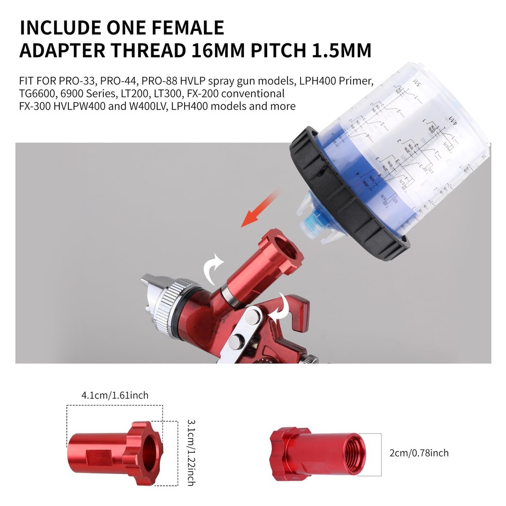 Disposable Paint Gun Cup, HVLP Paint Sprayer Gun Mixing Cups 20 Ounce(600ML) Kit with 50 Cups and Lids System, 10 Plugs and 1 Hard Cup with Retainer Ring, 1 Cup Adapter PLEASE NOTE: Paint gun cup adapter has a thread size of 16mm and 1.5mm pitch, fits for PRO-33 PRO-44 PRO-88 HVLP paint spray gun Models, LPH400 Models W400 W400LV LPH440 Primer TG6600 6900 Series LT200 LT300 FX-200 Conventional FX-300 HVLP and more. Even if this adapter doesn’t fit your spray gun, you can still choose our disposable paint cup kit because it is very cost-effective. Value Package Includes: This hvlp paint cups with adapter set contains 50 disposable cup liners at 20 ounces (600ml),50 lids with built-in 125-micron fluid strainers, 1 hard cup with 1 retainer ring, 1 cup adapter and 10 sealing plugs. Mixing & Paint 2-In-1: This disposable automotive paint gun cup system can improve your spraying efficiency, saving you time, labor, and money. You never need to mix paint in an extra paint mixing cup! High-Quality Material: Our solvent-based paint lids can maximize equalized pressure and filter area even to paint flow as it is made of top-notch silicone-free material, minimizing waste of your paint and saving money. Wide Application: Suitable for automotive, furniture, industrial, marine, and art crafts. These automotive paint mixing cups are ideal for primers, topcoats, stains, and sealers as well as with gel coats, lacquers, and varnishes. Easy To Use: Our spray gun hard cup is designed with clear graduations and mixing ratios for common paint systems. A clear paint gun cup makes it easy to see the liquid level. Please note this cup system cannot be used with new 2.0 spray gun adapters, only suitable for 1.0 spray gun adapters(Please see the first bullet point for adapter information). 50 Pack Disposable Paint Gun Cups With Adapter - Set includes: 50 disposable liners, 50 lids, 1 hard outer cup and 1 retainer ring, 10 sealing plugs, 1 cup adapter Shipping We offer FREE shipping on all orders! We ship within Three business days of payment, usually sooner. We use a selection of shipping services such as UPS, FedEx, USPS etc. We only ship to the lower 48 states, no APO/FPO addresses or PO Boxes allowed. Local pickups and combined shipping options are not provided at this time. Return You can return a product for up to 30 days from the date you purchased it. Any product you return must be in the same condition you received it and in the original packaging. Please keep the receipt. Payment We accept payment by any of the following methods: PayPal Please pay as soon as possible after winning an auction, as that will allow us to post your item to you sooner! Feedback Customer satisfaction is very important to us. If you have any problem with your order, please contact us and we will do our best to make you satisfied. Contact Us If you have any queries, please contact us via ebay. We usually respond within 24 hours on weekdays. Please visit our eBay store to check out other items for sale! Thank you for shopping at our store.