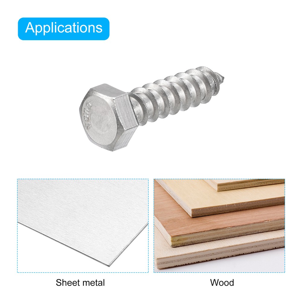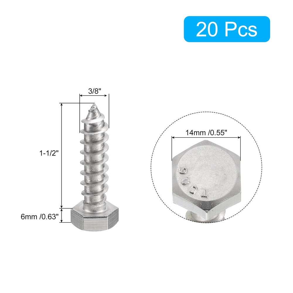 Document 1. Hex lag screws, also known as lag bolts, are wooden fasteners commonly used in construction projects such as building decks, fences, docks, bridges and other outdoor structures. They are hexagonal in shape with a pointed tip and have coarse threads making them strong and durable. They have a high level of holding power and are resistant to vibration and loosening.2. Made of 304 stainless steel material, which is corrosion-resistant and oxidation-resistant, ensuring that the bolts can withstand pressure and tension without deformation or breakage. The pickling passivation surface treatment gives the bolts a clean, beautiful and shiny finish.3. The hex self-tapping screws can be installed quickly and easily with a socket wrench or a hex wrench.4. Hex head lag screws can be used in a variety of applications including wood to wood, wood to concrete, and other heavy construction projects such as bridge building, dock building, deck building, shelving, furniture building, etc.Tips: To prevent splitting, drill a guide hole slightly smaller than the screw.Specification:Material: 304 Stainless SteelSurface Treatment: Pickling PassivationThread Size: 3/8" x 1-1/2"Threads Per Inch: 16Hex Head Size: 14 x 6mm / 0.55" x 0.63"(W*T)Package Content: 20pcs x Hex Lag Screws Hex Head Lag Screws Bolts, 20pcs 3/8" x 1-1/2" 304 Stainless Steel Wood Screws 1. Hex lag screws, also known as lag bolts, are wooden fasteners commonly used in construction projects such as building decks, fences, docks, bridges and other outdoor structures. They are hexagonal in shape with a pointed tip and have coarse threads making them strong and durable. They have a high level of holding power and are resistant to vibration and loosening. 2. Made of 304 stainless steel material, which is corrosion-resistant and oxidation-resistant, ensuring that the bolts can withstand pressure and tension without deformation or breakage. The pickling passivation surface treatment gives the bolts a clean, beautiful and shiny finish. 3. The hex self-tapping screws can be installed quickly and easily with a socket wrench or a hex wrench. 4. Hex head lag screws can be used in a variety of applications including wood to wood, wood to concrete, and other heavy construction projects such as bridge building, dock building, deck building, shelving, furniture building, etc. Tips: To prevent splitting, drill a guide hole slightly smaller than the screw. Specification: Material: 304 Stainless Steel Surface Treatment: Pickling Passivation Thread Size: 3/8" x 1-1/2" Threads Per Inch: 16 Hex Head Size: 14 x 6mm / 0.55" x 0.63"(W*T) Package Content: 20pcs x Hex Lag Screws Hot Item Payment 1.We accept eBay payment . 2.Payment must be received within 7 business days of auction closing. Shipping 1.We ship to your eBay or Paypal address. Please make sure your eBay and Paypal address is correct before you pay. 2.Items will be shipped within 1-3 business day when we received payment. 3.Delivery time depends on destination and other factors. Description Policy Hex Head Lag Screws Bolts, 20pcs 3/8" x 1-1/2" 304 Stainless Steel Wood Screws 1. Hex lag screws, also known as lag bolts, are wooden fasteners commonly used in construction projects such as building decks, fences, docks, bridges and other outdoor structures. They are hexagonal in shape with a pointed tip and have coarse threads making them strong and durable. They have a high level of holding power and are resistant to vibration and loosening. 2. Made of 304 stainless steel material, which is corrosion-resistant and oxidation-resistant, ensuring that the bolts can withstand pressure and tension without deformation or breakage. The pickling passivation surface treatment gives the bolts a clean, beautiful and shiny finish. 3. The hex self-tapping screws can be installed quickly and easily with a socket wrench or a hex wrench. 4. Hex head lag screws can be used in a variety of applications including wood to wood, wood to concrete, and other heavy construction projects such as bridge building, dock building, deck building, shelving, furniture building, etc. Tips: To prevent splitting, drill a guide hole slightly smaller than the screw. Specification: Material: 304 Stainless Steel Surface Treatment: Pickling Passivation Thread Size: 3/8" x 1-1/2" Threads Per Inch: 16 Hex Head Size: 14 x 6mm / 0.55" x 0.63"(W*T) Package Content: 20pcs x Hex Lag Screws Hot Item Payment 1.We accept eBay payment . 2.Payment must be received within 7 business days of auction closing. Shipping 1.We ship to your eBay or Paypal address. Please make sure your eBay and Paypal address is correct before you pay. 2.Items will be shipped within 1-3 business day when we received payment. 3.Delivery time depends on destination and other factors.