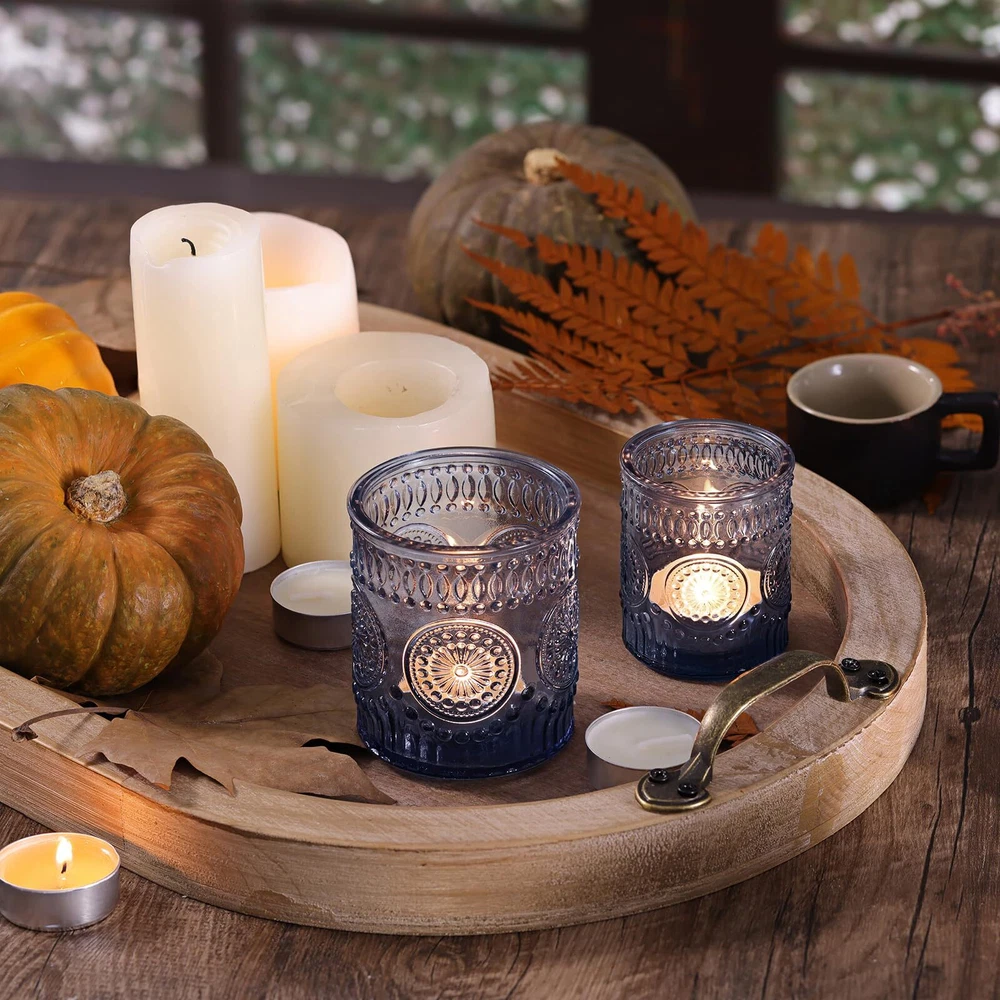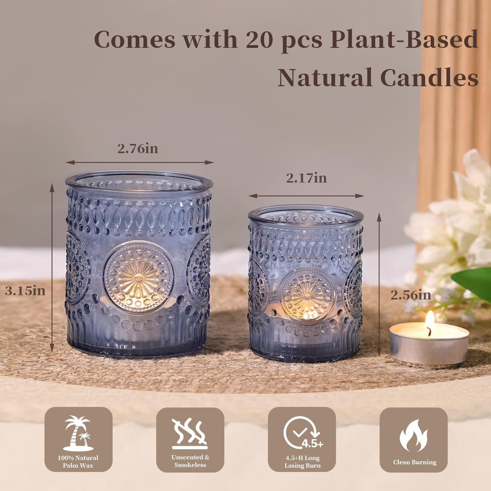 Volens 20pcs Assorted Blue Votive Candle Holders with 20pcs Tealight Candles, Large Glass Votive & Tea Light Candle Holder for Wedding Table Centerpieces, Christmas Party Decorations, Fall Home Decor TWO-SIZE CANDLE HOLDERS-- Meeting Various Needs: You will get 20pcs assorted blue candle holders bulk in your package, the large votive candle holders measure 2.76ʺ diameter (top) and 3.15ʺ height, and the small glass candle holders measure 2.17ʺ diameter(top) and 2.56ʺ height approximately. It works with regular tealight/ votive/ floating and flameless candles, and two different sizes will add some dimension to your table decor. ECONOMICAL ASSORTED PACK-- Comes with 20pcs Palm Wax Tea Lights Candles: [ 4-5 hour extended burn time ] [ Unscented and Smokeless] [ Clean and Even Burn ] [ Recyclable Aluminum Shell ] Whether you're creating a serene ambiance for meditation and yoga, or setting the mood for an intimate dinner, these candle holders with palm tea lights candles are your trusted companions. Elevate your moments with 4-5 hours of long-lasting burn time. WEDDING CENTERPIECES-- Enhance a Warm and Inviting Atmosphere: The vintage sunflower embossed look and warm shine make the glass votives ideal for wedding decorations and bridal showers. Two different shapes of blue candle holders allow for interesting arrangements. Whether you use them clustered or spread them out in groups or individually, they harmonize beautifully, adding visual richness to the guest tables. SAFE PACKAGING & NICE SERVICE-- No Worry About Damaged: Made of lead-free thick glass, durable and shiny. Each of our large candle holders was carefully and securely packaged in the box, individually wrapped in bubble wrap to ensure they were delivered to you in perfect condition. If you have any questions, please feel free to contact us, and we will reply to you with a solution. WIDELY USED-- Suitable for Versatile Decorations, Such as birthday parties, bridal showers, baby showers, Valentine's Day, Mother's Day, Christmas, Halloween, Diwali, thanksgiving, and more. Whether you are planning a special party, creating a cozy home decoration, or giving it as a return gift, our large decorative candle holders can create a unique atmosphere for every important occasion. Shipping We offer FREE shipping on all orders! We ship within Three business days of payment, usually sooner. We use a selection of shipping services such as UPS, FedEx, USPS etc. We only ship to the lower 48 states, no APO/FPO addresses or PO Boxes allowed. Local pickups and combined shipping options are not provided at this time. International buyers – please note: Import duties, taxes, and charges aren't included in the item price or postage cost. These charges are the buyer's responsibility. Please check with your country's customs office to determine what these additional costs will be prior to bidding or buying. Order Cancellation Policy * Order Cancellation Policy ** You can return a product for up to 30 days from the date you purchased it. 1. The seller reserves the right to cancel the special case only due to eBay cancellation fee. 2. The decision of seller is the final. 3. The seller will respond to the cancellation request within 2 business days. Please wait for the result of cancellation. 4. In case the cancellation is not completed by some reasons, the buyer can follow the options below to get the refund. 4.1 The buyer can reject the item when it arrives. 4.2 The buyer can send the item back to the seller within 30 days If the buyer receives item (USA Shipment ONLY). The seller will provide the FREE return label to the buyer when the buyer opens " Return Item" case on eBay by using the reason as "Change my mind" ONLY. 5. When buyer has placed the order. The order will be processed and completed by automatic warehouse system within 5 minutes. In case that buyer sends the cancellation request after 5 minutes of placing the order, the request will be rejected. **Sending direct message to cancel the order is not allowed for every case.* Return Policy - If buyer would like to return the items for refund or replacement, please CONTACT SELLER to receive the free return label from seller. The refund or replacement will be processed with the tracking number of return label which is provided by seller only. The other ways of return which are not approved by seller will not be processed for the refund or replacement. Return You can return a product for up to 30 days from the date you purchased it. Any product you return must be in the same condition you received it and in the original packaging. Please keep the receipt. Payment We accept payment by any of the following methods: eBay Payments Please pay as soon as possible after winning an auction, as that will allow us to post your item to you sooner! Feedback Customer satisfaction is very important to us. If you have any problem with your order, please contact us and we will do our best to make you satisfied. Contact Us If you have any queries, please contact us via ebay. We usually respond within 24 hours on weekdays. Please visit our eBay store to check out other items for sale! Thank you for shopping at our store.