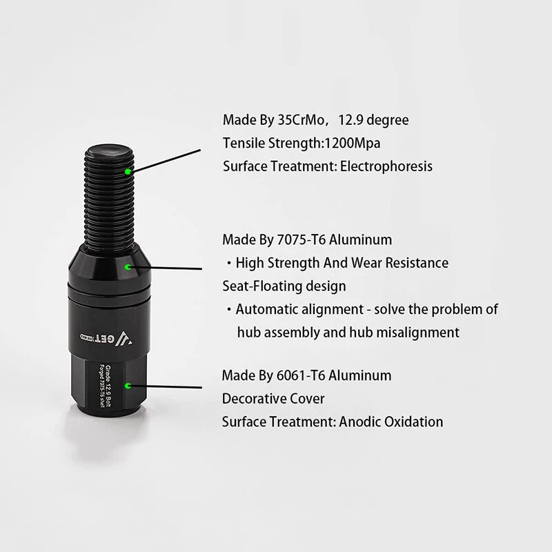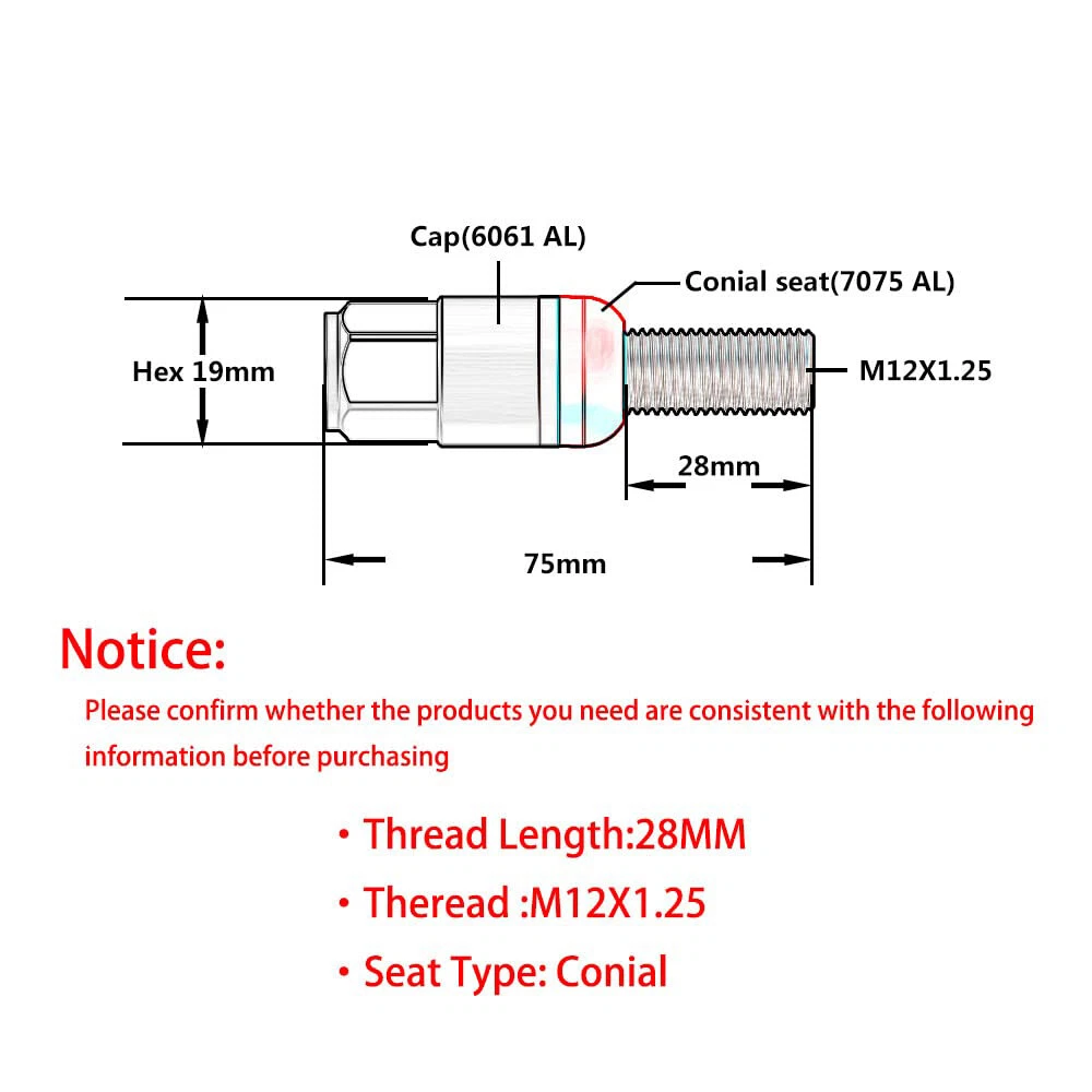 M12x1.25 Wheel Lug Bolts, 20pcs Forged Studs Set for 2014+ Jeep Cherokee, 2018+ Jeep Compass, 2015+ Jeep Renegade, 2015-2017 Chrysler 200, Wheel Accessories Parts FEATURES: 1. Application: Wheel Lug Bolt's Replacement OEM Number is 53182366, 6511051AA, 611-005, they are compatible with 2014+ Jeep Cherokee, 2018+ JEEP Compass, 2015-2017 for Chrysler 200, 2013-2016 Dodge Dart (only fit Aluminum wheels, don't fit Iron wheels), 2015+ Jeep Renegade. 2. High-Performance Material: Made of forged 35CrMo material and aircraft grade aluminium, lightweight, and heat-treated to 12.9 grade for superior strength and durability. 3. Seat-Floating Design: Prevents hub assembly and hub misalignment issues for a smoother ride. 4. Precise Specification: M12x1.25 thread pitch, 17mm hex, 28mm shank, 60 conical seat, and 75mm length for a perfect fit 5. Rigorously Tested: These wheel studs have passed proof load, salt spray, hardness, and thread testing to meet strict standards and ensure high temperature resistance.