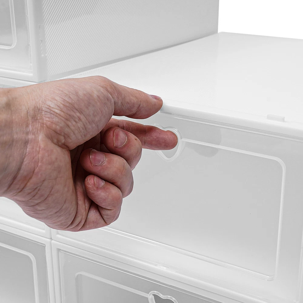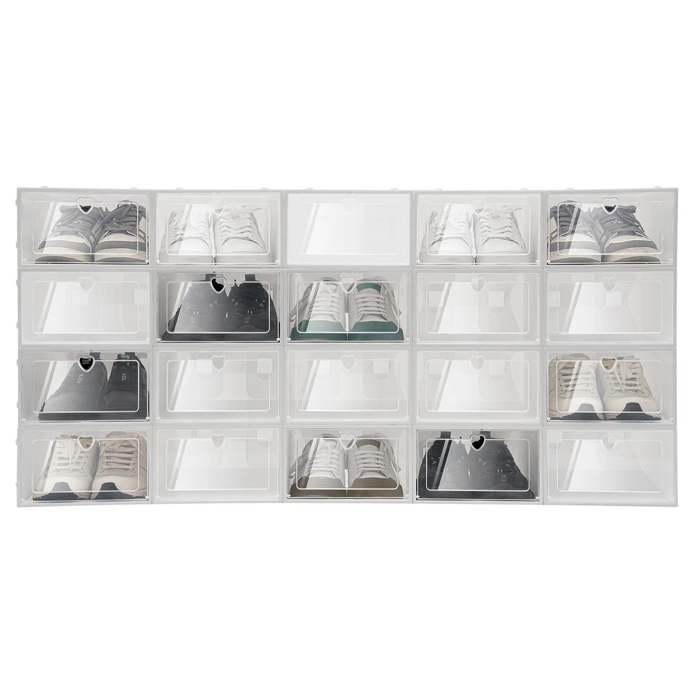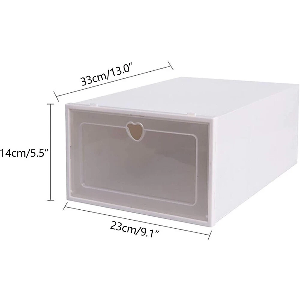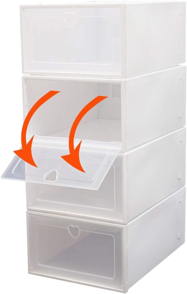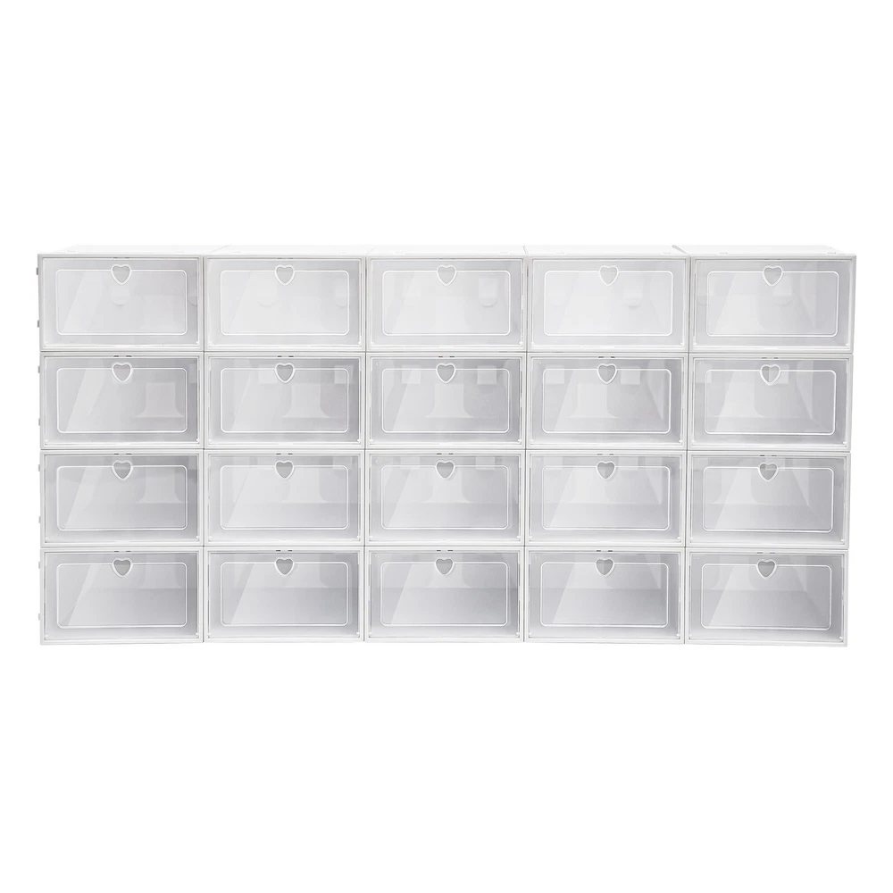 20x Large Plastic Shoe Storage Boxes Drawer Stackable Foldable Clear Organiser Description A beautiful life starts with organized storage. A set of 20 shoe organizers is enough for your neat storage needs. The transparent design ensures that your collection can be displayed and also allows you to easily find the right shoes without opening the box. In addition, it can maximize your space saving and keep your home neat and beautiful. If you are still struggling with messy shoes, try the stackable shoe organizers! Key Features High-quality Material: It is made of PP, which is harmless, environmentally frie ndly, impact-resistant, non-yellowing, and non-deformable, making it suitable for long-term use. Free Stacking: With the snap interlocking system, they can be firmly stacked up and down and be connected side to side to create different shapes without easy separation when you accidentally bump into them to suit different sized spaces and unique decorations. Stacking upwards saves a lot of space. Easy to Access: The transparent doors allow you to quickly find and select the shoes you want to match your outfit for the day. Flip-up doors allow for secure and easy shoe access. Powerful Storage Capacity: The combination of 20 shoe organizers can meet almost all your shoe storage needs. Besides, it can also store a large number of living and learning items to lighten the load of your cabinet . Placing boards on top of the stacked boxes can also hold keys and other miscellaneous items. Lightweight and Foldable: They can be folded for easy storage and transportation when not in use. The lighter PP organizer makes it easy for you to move it to any room to serve its storage and decorative purpose. Easy to Install: The already-made creases, simple construction, step-by-step installation diagram and installation video allow you to spend less time and effort on the installation. Easy to Clean : It is made of dirt-resistant PP. When it gets stained, you just need to rinse it with water and dry it to make it look new again. Life Assistant : This practical shoe storage assistant can help us organize our messy shoes, avoiding the panic of finding shoes in a pile and creating a cleaner, warmer living environment. Ideal Gift: With its simple appearance and good performance, this product can be used as a gift for housewarming, or you can give it to your family or friends so that they can also enjoy a neater environment. Details Heart-shaped Hollow Handle: The lovely heart-shaped handle not only is convenient for opening the door, but also promotes air circulation to prevent shoes from moisture and odor. Practical Door: Compared to a doorless organizer, it comes with a door to protect your precious shoes from dust and moisture. Flip-up doors are easier to open/close and also better protect your skin from scratches, compared to left and right opening doors. Smooth Rounded Corners: They protect your hands from being scratched during installation and movement for safer use. [ More Product Detail ] Heart Holes There is a heart hole on each cover of the shoe boxes which is beautiful and practical. The holes improve air circulation and make the shoes odorless. You can also store and take the shoes easily with the holes. PP Plastic Material PP plastic materials are odorless. They are safe to use. Efficient Storage In addition to shoes, the box can also be used to store other items such as belts, scarves, socks, cosmetics as well as fashion accessories. Easy to Pick Up The shoe boxes have a side flap design, it is easy to store and take shoes out of it. The shoe boxes are convenient to use. Easy Installation We provide videos and instructions for you and you can install the shoe boxes without any tools. So the shoe boxes are easy to be installed. Stackable Design The stackable design can save more space for you and make your home more organized. To stack, simply insert the boxes into the buckle. Connected joints for better stability. Waterproof & Easy Clean Simply rinse under clean water; Wipe dry with cloth; The air vents will dry the box quickly. Application The set of shoe o rganizer s can store flat shoes, leisure shoes and sneakers, and women's shoe size 10 (US) and men's shoe size 9 (US) . It is widely used in the entrance, study, toy room, bedroom and closet to organize clothes, toys, toiletries, books, magazines, documents, sundries and so on. Installation Steps 1. Shape the box along this crease. 2. Bend the bottom of the box. 3. Snap the buckle into the bottom holes. 4. Fold the 3 tabs. 5. Snap the tabs into the frame of the box. 6. Installation is complete. Specifications Material: PP Color: White, Clear Style: Simple, Modern Special Feature: Stackable Shape: Rectangular Number of Items: 20 Suitable Shoes: Up to 10 (Women, US), Up to 9 (Men, US) Frame Thickness: 1.1cm/0.43inch Each Organizer Size: 23*33*14cm/9*13*5.5inch Package Size: 47*37*12cm/18.5*14.6*4.7inch Gross Weight: 4.45kg/9.8lbs Net Weight: 4kg/8.8lbs Package Included 20*Shoe Organizers Notes Please note that this product is manual available in English, German and French, please contact customer service for more information. Please measure your shoe size before your purchase. High-top shoes and boots can't be put up vertically, but can be placed flat if they are true to size. For greater stability, it is recommended not to stack the boxes too high. Please allow the slight color difference caused by the shooting light and 1-3cm error due to manual measurement, and make sure you do not mind before you order. Notes:Please note that this product is manual available in English, German and French, please contact customer service for more information. Payment Delivery details Terms of sales About us Contact us Payment We accept ebay payment 。 Fees such as import duties, taxes are not included in the item price or shipping costs. These charges are the buyer's responsibility. Delivery details Shipping: 2-9 working days to: USA Terms of sales We mainta