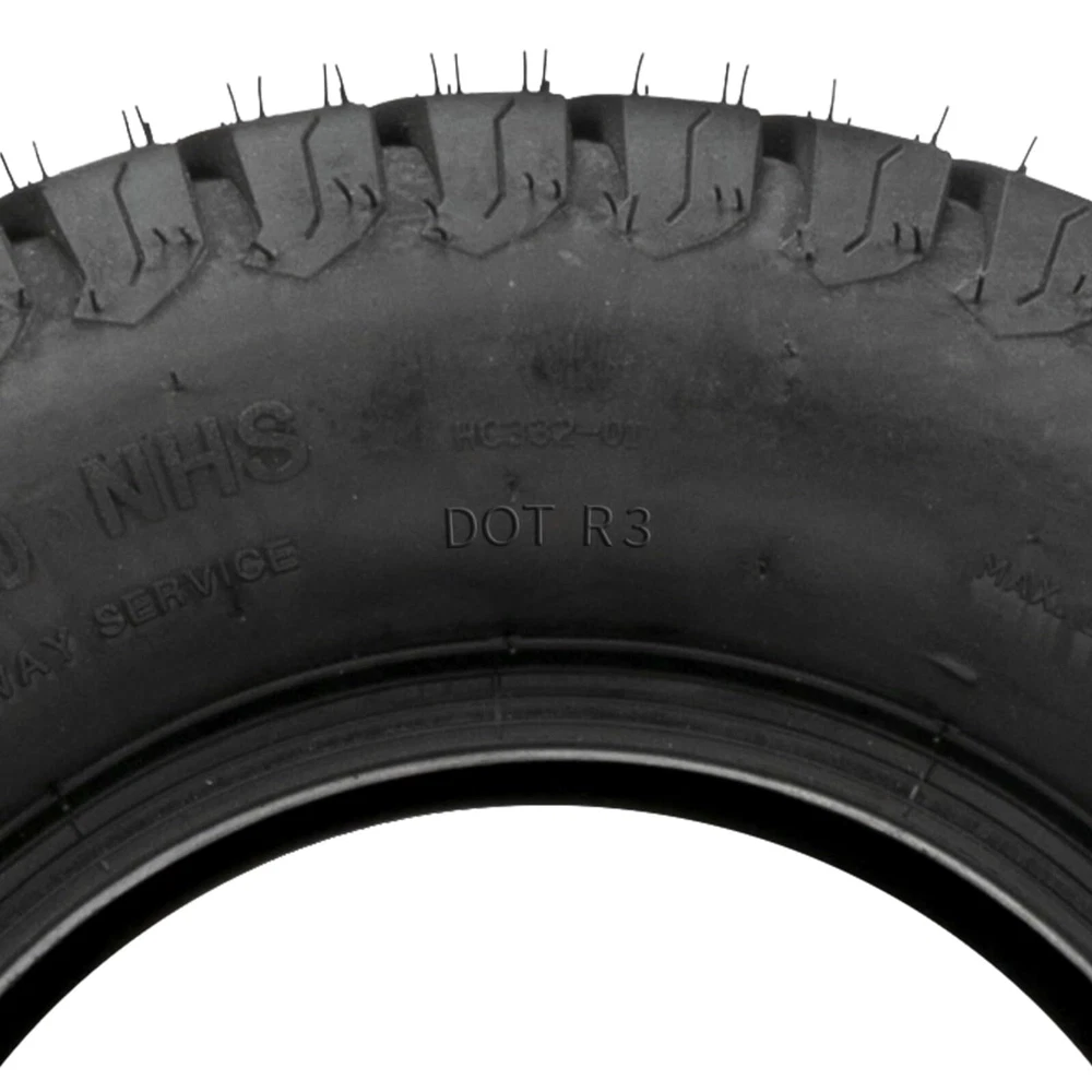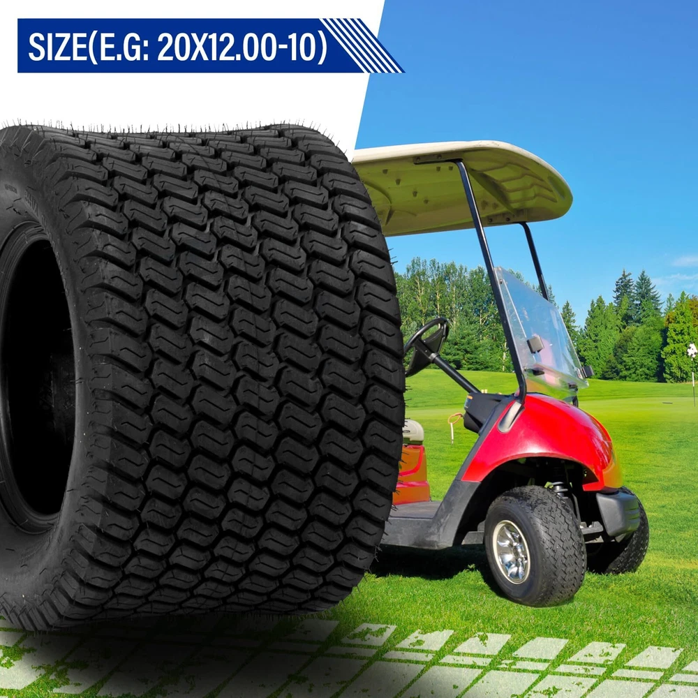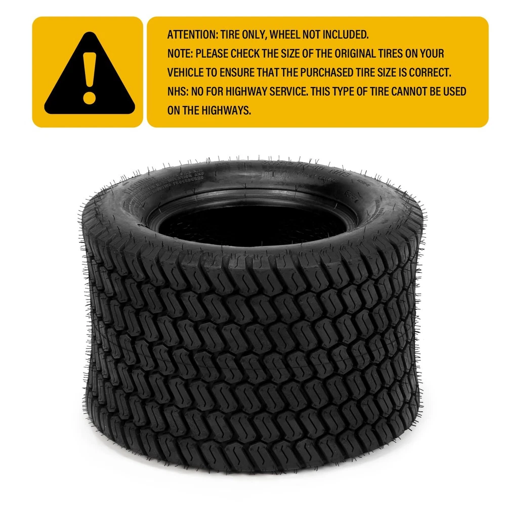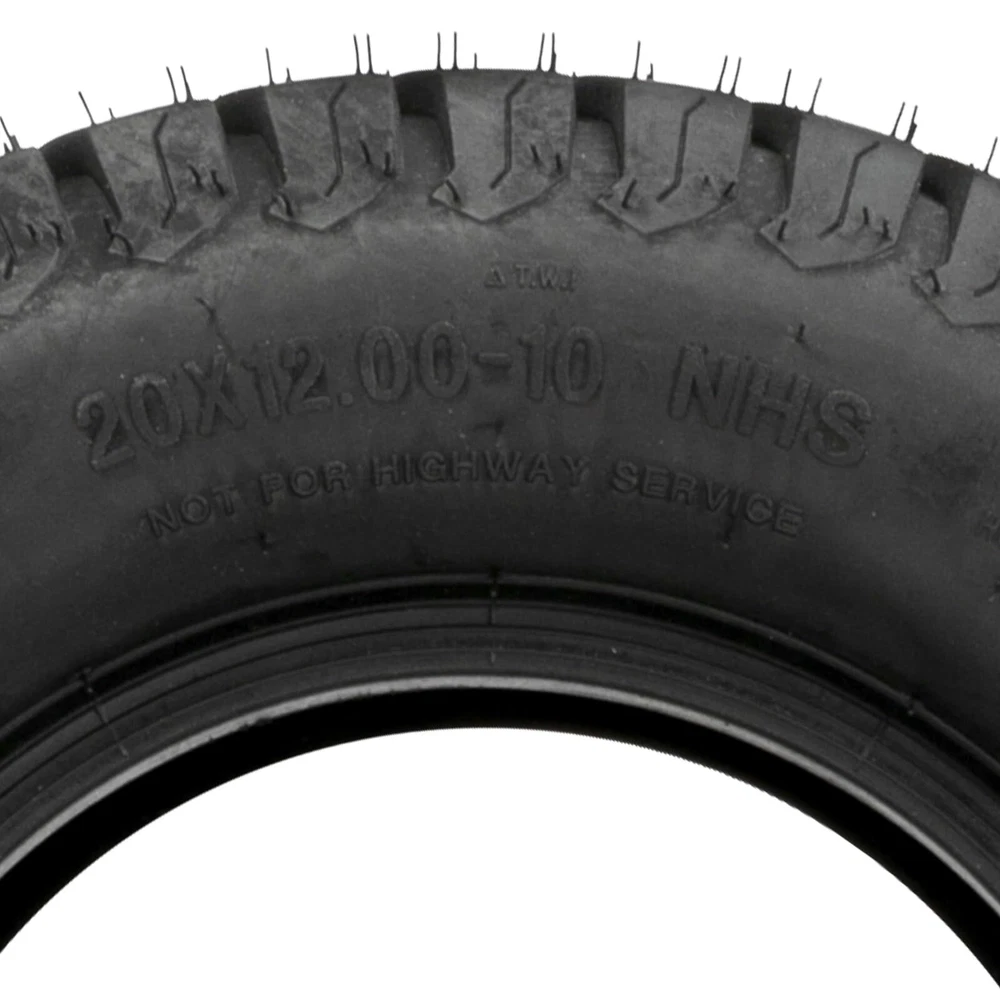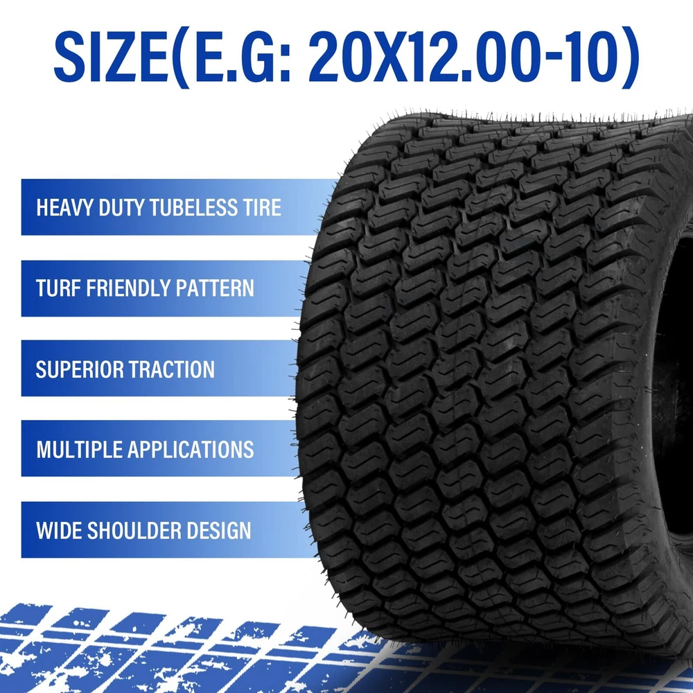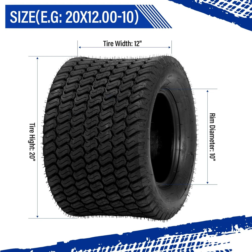 Description Specifications: 1.PLY:4 3.Tread Depth: 0.28in(7.1mm) 4.Rim width: 8.50in(215.9mm) 5.SW:11.02in(280mm) 6.OD:20in(508mm) 7.Max load:1320Lbs 8.PSI:20 Package Includes: 2 x Tires Specification: Tire Size: 20x12.00-10 4 Ply Rated, Tread Depth: 7.1mm; Rim Width: 8.5", SW: 280mm; OD: 508mm; 1320Lbs@20psi Feature: Turf Tech tread is made to give you better traction on grassy surfaces, especially on hills where the potential for slippage exists, The design will greatly reduce the damage to your lawn Compatibility: 20x12.00-10, 20x12.00x10 tires is widely used on many kind of lawn mower, riding lawn mower, lawn tractor, garden tractor, garden tractor pulling, farm equipment,various grass cutting equipment. Package Include: 2 Pack of 20"x12"-10" lawn tractor tires. Tire only - Wheel not included. NOTE: This tire has registered DOT, register compliance number: R3, And This tire CAN'T BE USED ON THE HIGH WAY,and tire speed cannot exceed 80 km/h;【 Directsale from factory & DOT APPROVED】