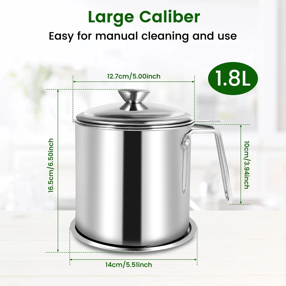 Oil Pots 2/1.5L Stainless Steel Fine Mesh Strainers Grease Container Storage Can Upgrade your kitchen with this stainless steel oil strainer pot, available in 2L and 1.5L capacities. Featuring a fine mesh strainer, it efficiently filters food particles from cooking oil, making it reusable and perfect for frying or storing grease. The multifunctional design doubles as a fry basket and oil storage container, offering convenience and versatility for home cooking. Made from high-quality stainless steel, it is durable, easy to clean, and built to withstand daily use. A practical addition to any kitchen, ideal for those who value efficiency and cleanliness in food preparation. Specification: Item: Oil Storage Can Type: Colanders & Strainers Material: Stainless Steel Size: 1.5L pot body about: 14x12.5x13.5cm 2L pot body about: 14x12.5x16cm A: 2L Oil Filter Pot: Top of pot caliber approx: 13cm / 5.1 inches Height: approx. 16cm / 6.3 inches Bottom diameter: approx. 14.5cm / 5.7 inches Total height with lid approx. 19.5cm / 7.68 inches Basket diameter approx: 11.8cm / 4.6 inches Height approx. 15cm / 5.9 inches Certification: CE / EU,CIQ Color: Silver Feature: Oil Strainer Pot with Fine Mesh Strainer Usage: Grease Container Package Included: 1 x Pc Oil Filter Pot 1 x Pc Dustproof Lid 1 x Pc Oil Strainer Grid 1 x Pc Frying Basket Drainer Grid