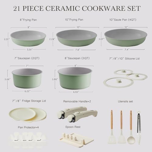Return Policy Fast Delivery Trusted seller 21 Pcs Ceramic kitchen Cookware Set,Nonstick Pots and Pans with Removable Handles Stackable Camping Cookware Dishwasher&Oven Safe Frying Pan,Green Product Description 【Non Toxic】: Made of natural ceramic, our kitchen ceramic cookware set is no Teflon and no PFAS, PTFE, PFOA, lead, or cadmium. It ensures no peeling even when scratched during prolonged use. Ideal for preparing meals for your family, especially those with babies. 【Optimized Storage Idea】: Save 75% space by neatly stacking pots and pans in cabinets. Whether you have limited storage or simply wish to keep your kitchen neat and organized, our stackable cookware will be your go-to choice.Perfect for compact spaces, RVs and campers. The reinforced removable handles can support up to 24 pounds, ensuring a secure grip. Transform pots with a "CLICK" into baking dishes, serving plates, or fridge storage, enhancing versatility. 【Ultra Non-Stick Performance】: 's pots and pans sets itself apart with its unique patented technology, offering a stronger and more durable surface coating, resulting in a longer lifespan compared to most ceramic pots and pans set on the market. With a non-stick surface, this cookware set ensures effortless food release. Also it requires less oil or butter for healthier cooking options. 【Easy Cleaning】: Sided Ceramic Coating: ceramic pots and pans set boasts an innovative dual-sided ceramic coating, inside and out; This advanced ceramic finish ensures effortless cleaning, allowing you to effortlessly wash both the interior and exterior of your pots and pans. Clean the cookware set with mild dish soap, warm water, and a soft sponge or cloth. While our cookware is dishwasher-safe for your convenience, we highly recommend handwashing. 【Universal Cooktop Compatibility】: Enlarged and upgraded base ensures all stovetops compatible, including induction cooktop, gas, electric or more. It's also oven safe for more cooking or baking needs. This kitchen pots and pans set heats up quickly and distributes heat evenly, ensuring no hot spots or sticking during cook. 30 years of experience in the manufacture of high-end professional cookware, capable of perfecting all classic cooking techniques. 【21 Piece Set Includes】: 2QT(7") & 3QT(8") saucepans, 8" & 10" frying pans, 4QT(10") sauté pan, 2 removable handles, 7" 8" & 10" glass lids, 7" & 8" fridge lids, 4 pot protectors, 1 spoon rest, silicone turner, ladle, tongs. Shipping Returns Payment Shipping Shipping is FREE to all addresses other than APO/PO boxes in the lower 48 states. All our stock ships from US-based warehouses. Shipped via USPS or UPS (depending on location and package weight) Unless stated otherwise, all orders will ship within 24-72 hours of your payment being processed. Check our feedback to see the great reviews of FAST shipping we offer. Returns Seller does not accept returns Payment We currently accept payment via eBay managed payments only. Once payment is cleared, we will dispatch your shipment within 1-3 business days. Please refer to the "Shipping" tab for more information regarding shipping speed to your destination.