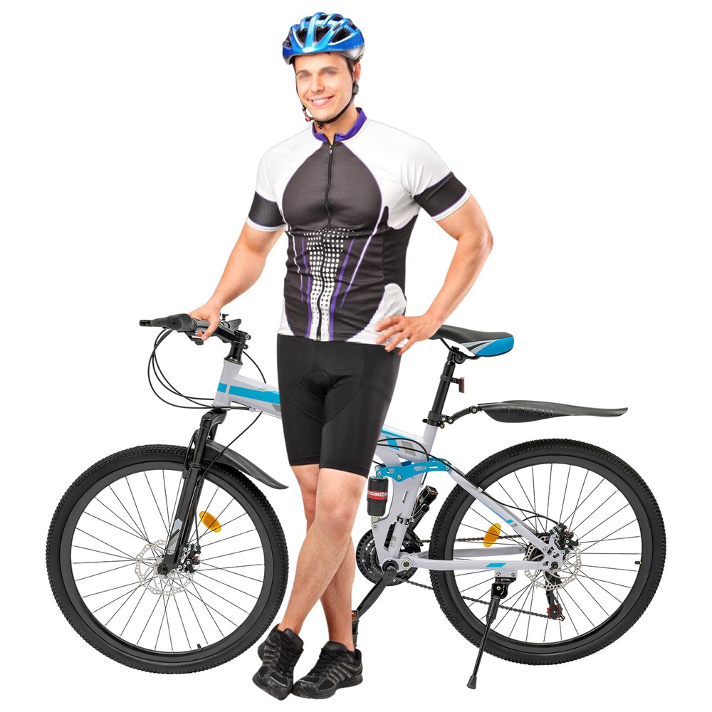 Specifications Color: Blue, White Material: Rubber, High-carbon Steel, Sponge Process: Spray Paint Assembly Required: Yes Number of Speeds: 21 Wheel Diameter: 66cm/26in Load-bearing Capacity: 100kg/220.46lbs Adjustable Height(Seat): About 10cm/3.94in Product Size: 1.72*1.06m/5.64*3.48ft Folded Product Size: 95*100*35cm/37.4*39.37*13.78in Suitable Height: 1.6-1.8m/5.25-5.9ft Package Size: 135*19*70cm/53.15*7.48*27.56in Gross Weight: 21kg/46.3lbs Net Weight: 19kg/41.89lbs Package Included 1* Mountain Bike 1* English Manual Other Needed Accessories WELCOME Description This mountain bike will be your ideal companion for both urban exploration and outdoor adventures. Its lightweight and tough frame with smooth-shifting 21-speed gear system and seven-piece alignment wheels make it easy to ride on both steep and flat roads. The unique folding design makes storage and carrying easy and convenient. The front and rear dual shock absorbers, and double disc brakes allow you to ride smoothly and safely even on the rough mountain roads, allowing you to fully enjoy the joy of outdoor cycling. Key Features Build to Last: The high-carbon steel body, rubber wheels, and spray paint process give the product high sturdiness, durability, good shock absorption performance, and resistance to corrosion, rust, deformation, and abrasion. Flexible Riding: The front derailleur with three discs and the rear derailleur with seven discs give the bike a total of 21 shifting options, allowing you to make flexible changes to optimize your riding experience on the flats, steeps, or hills. It also comes with a finger paddle and a rear paddle for quick speed adjustments. Excellent Load-bearing Capacity: The stable structure and sturdy material allow this product to withstand a weight of 220.46 lbs, making it suitable for most ordinary people to use. User-friendly Design: The dual shock absorbing system, soft sponge-filled saddle, and ergonomic handle minimize the impact of your ride, and relieve pressure on your hands and shoulders, allowing you to control the direction of your ride safely. Adjustable Design: The height of the saddle is adjustable by approximately 3.94 inches, allowing you to adjust according to your conditions. Reliable Brake System: Dual disc brake system has excellent and stable braking performance to cope with the harsh environment and riding road conditions to ensure your driving safety. Foldable Design: Its foldable design (37.4*39.37*13.78in) makes it easy to be carried outside or stored in your warehouse without taking up much space. Easy Assembly: When you receive the product, 85% of it has been assembled, and you only need to use the equipped tools to complete the remaining installation according to the instructions. Customer Service: We aim to provide quality products and services. If you have any problems, please feel free to contact us. We will reply and solve the problem for you as soon as possible. Details Non-slip Wheels: The spoked rubber wheels with concave-convex texture will greatly improve the grip performance for better and safer riding performance. Anti-slip Pedals: They increase the friction with the foot and prevent slipping. Short Brake Lever: The shorter stroke of the brake lever makes it easier for young drivers to grasp and squeeze the brake lever. Sturdy Kickstand: It can hold your bike stably to prevent shaking or falling. Mudguards: Front and rear mudguards can keep splashes of mud and water from dirtying you and the bike body. Reflectors: The front end, seat, and wheels are fitted with light-reflecting devices to make you feel safer when cycling at night. Cup Holder: You can clip your cup onto it for drinking conveniently. Application The product is suitable for daily commuting, fitness, off-road challenges, competition, short-distance recreational riding, and long-distance adventure travel. Specifications Color: Blue, White Material: Rubber, High-carbon Steel, Sponge Process: Spray Paint Assembly Required: Yes Number of Speeds: 21 Wheel Diameter: 66cm/26in Load-bearing Capacity: 100kg/220.46lbs Adjustable Height(Seat): About 10cm/3.94in Product Size: 1.72*1.06m/5.64*3.48ft Folded Product Size: 95*100*35cm/37.4*39.37*13.78in Suitable Height: 1.6-1.8m/5.25-5.9ft Package Size: 135*19*70cm/53.15*7.48*27.56in Gross Weight: 21kg/46.3lbs Net Weight: 19kg/41.89lbs Package Included 1* Mountain Bike 1* English Manual Other Needed Accessories Notes Please check the size carefully before ordering. Please read the operating manual completely before use. And pay particular attention to the safety instructions included. The foot pedal has a difference between left and right. When installing, please align the thread and tighten the foot pedal with a tool. When cycling, please follow the traffic rules of your area and do not ride in dangerous areas or motor vehicle lanes. Please use this product within the load-bearing range. Please allow the slight color difference caused by the shooting light and 1-3cm error due to manual measurement, and make sure you do not mind before you order Instructions:not included,please contact seller for English instructions Payment Delivery details Terms of sales About us Contact us Payment We accept ebay payment 。 Fees such as import duties, taxes are not included in the item price or shipping costs. These charges are the buyer's responsibility. Delivery details Shipping: 2-9 working days to: USA Terms of sales We maintain high standards of excellence and strive for hundred percent customer satisfaction. Feedback is very important to us. We hope that you contact us immediately before you give neutral or negative feedback, so that we can address your concerns. It is impossible to address issues if we do not know about them! About us Your satis faction is our ultimate goal. We work hard to earn your trust and future business. Our certified technicians have tested each item before shipping. The unit comes with 1 year limited warranty on all manufacturing defect