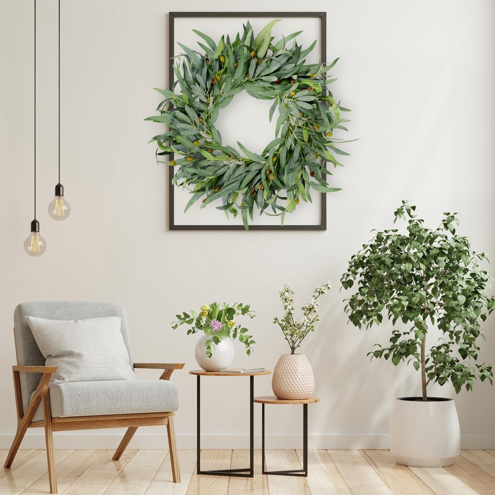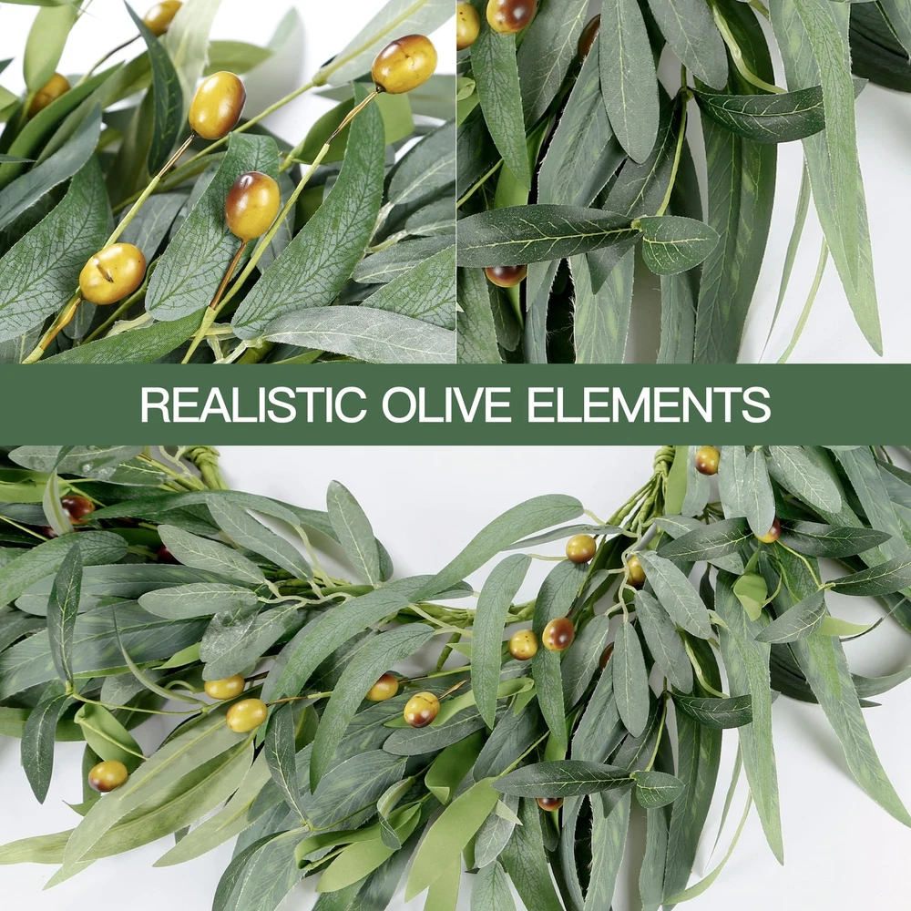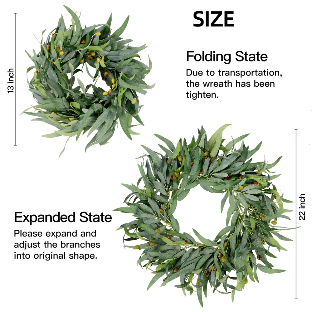 Absolutely love this olive wreath! The realistic silk leaves and natural-looking branches make it a stunning addition to my front door. It’s lightweight yet durable, holding its shape perfectly indoors or outdoors. The rich green color stays vibrant without fading, and the 22-inch size is just right—not too big, not too small. Works beautifully for everyday decor or special occasions. No maintenance needed, just instant elegance! Highly recommend for anyone wanting a timeless, welcoming touch.