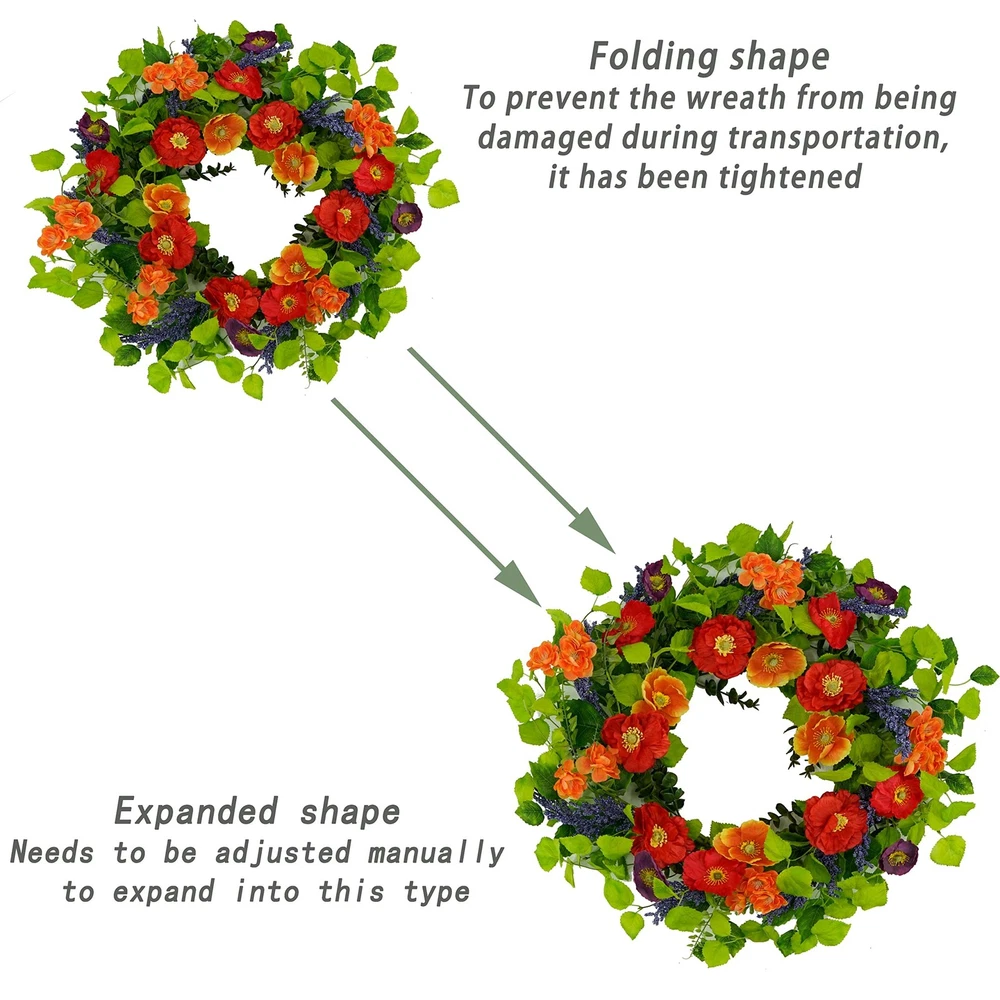22 inch Artificial Spring Summer Wreaths for Front Door Poppy Wreath with Lavender Ear,Cherry Blossom,for Front Door Indoor Outdoor Home Farmhouse Decor Product Details Color: Red Poppy Brand: WreathDream MPN: SW2023 UPC: Does not apply EAN: Does not apply Color: Red Poppy Brand: WreathDream Material: Silk Mounting Type: Door Mount Shape: Round Product Dimensions: 20"D x 20"W x 5"H Occasion: Multi-occasions Manufacturer: WreathDream Color: Red Poppy Brand: WreathDream Material: Silk Mounting Type: Door Mount Shape: Round Product Dimensions: 20"D x 20"W x 5"H Occasion: Multi-occasions Manufacturer: WreathDream Item Weight: 1.41 pounds Country of Origin: China Item model number: SW2023 Batteries required: No High-quality Material: This artificial Spring Summer poppy wreath is made of silk which can be used all year round. Unique Design: This Spring front door wreath is decorated with a full circle of Green leaves, lifelike poppy,Lavender ear,Cherry Blossom a romantic look that makes for a wonderful style for spring door decoration. Elegant and vivid colors make for timeless seasonal home decor Perfect Size: The outer diameter is about 22", the inner diameter is about 10", perfect size for indoor and outdoor decoration Easy Maintenance: Highly realistic handmade artificial wreath makes it durable and requires no special maintenance. Just wipe it with a wet tissue or towel to keep it neat Multi-occasions: The wreath can be used indoor or outdoor, place it on your front door, or hang it above your fireplace. It's also perfect for decorating weddings, birthdays, stages, bedrooms, offices, dining rooms, and others