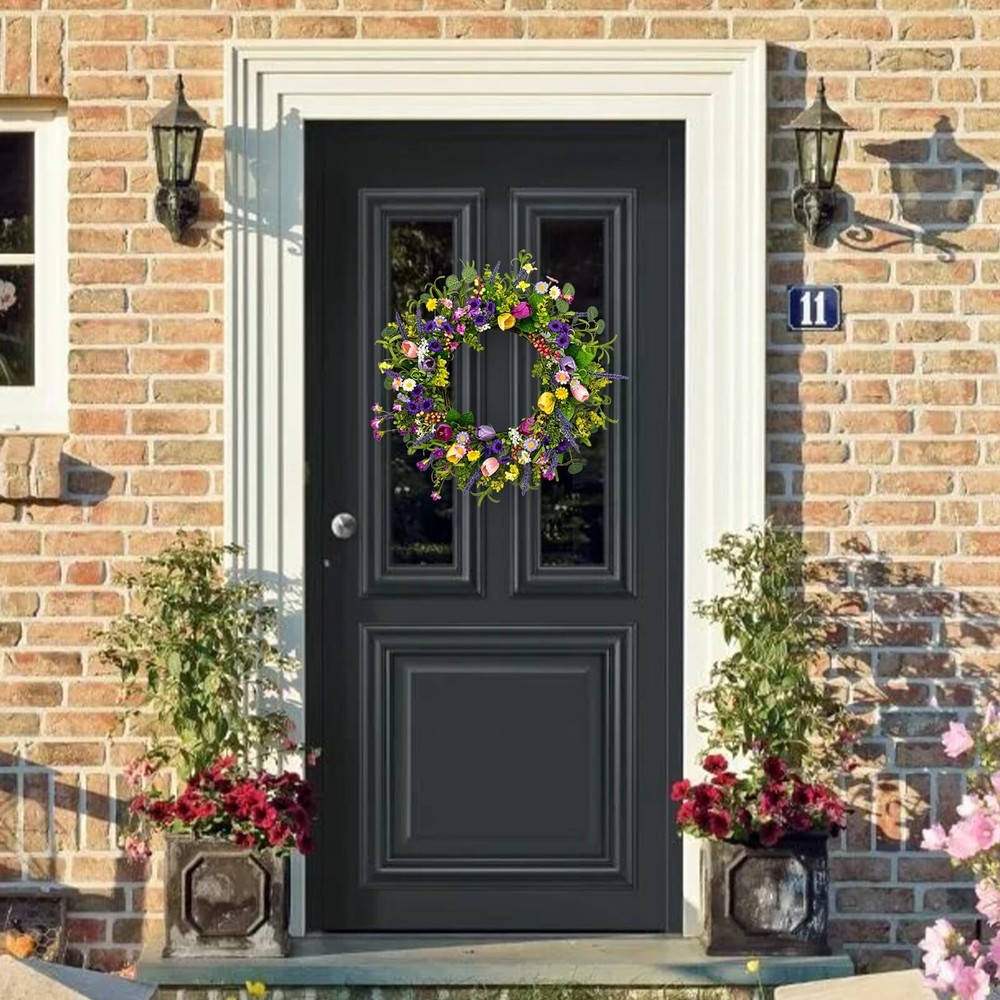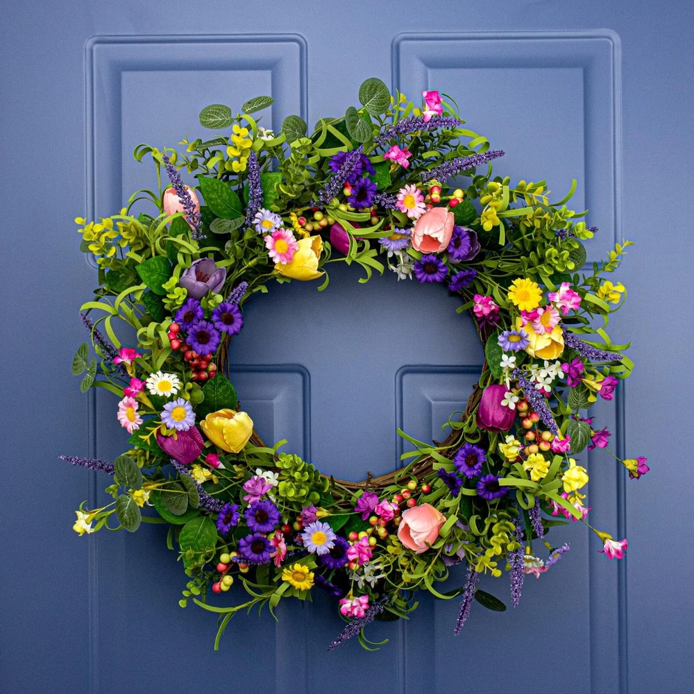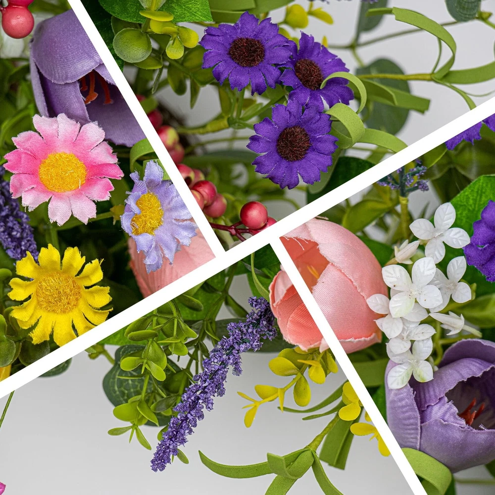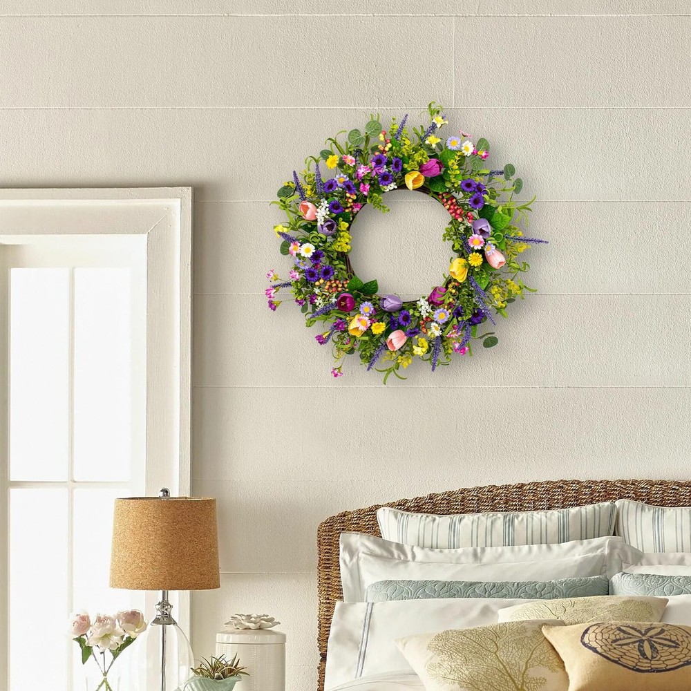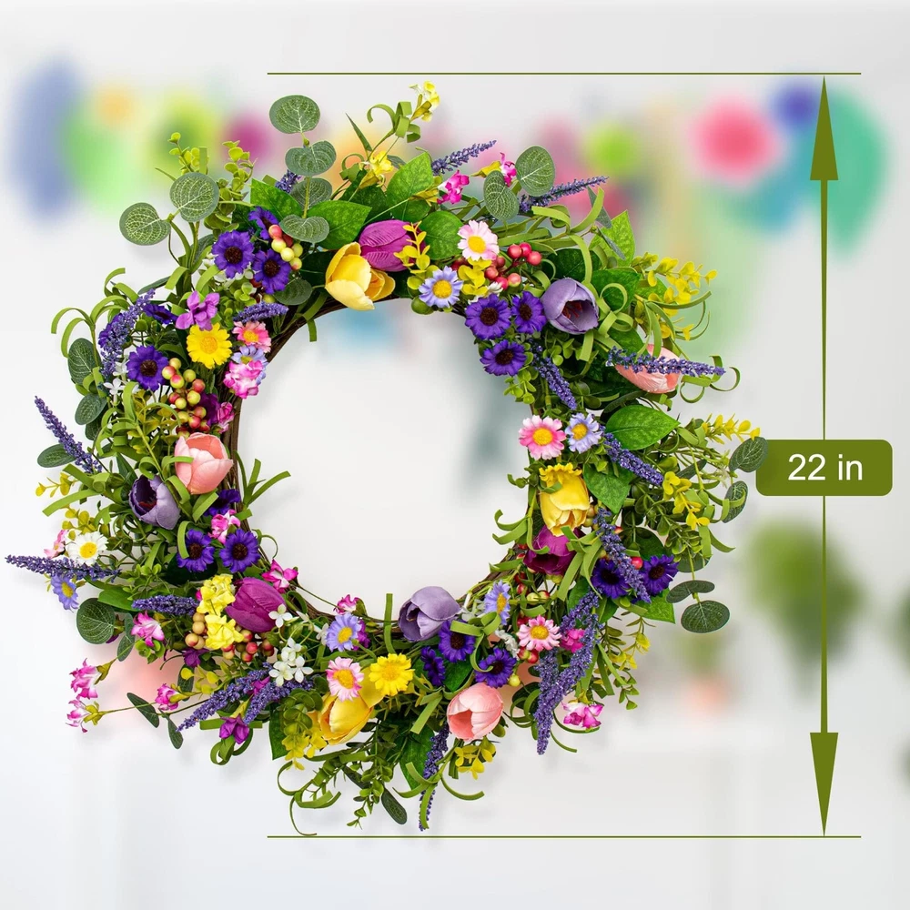 Artificial Spring Wreath 22 Inch Spring Wreaths for Front Door Tulip Wreath with Green Eucalyptus Leaves Daisy Lavender Berry for Sringtime Summer Holiday Indoor Outdoor Decor Product Details Color: Multicolor Brand: JINGHONG Material: Fabric,Plastic,Grapevine Mounting Type: Door Mount Shape: Round Product Dimensions: 4"D x 22"W x 22"H Seasons: Spring Occasion: Easter, Spring Summer Manufacturer: JINGHONG Indoor/Outdoor Usage: Indoor Color: Multicolor Brand: JINGHONG Material: Fabric,Plastic,Grapevine Mounting Type: Door Mount Shape: Round Product Dimensions: 4"D x 22"W x 22"H Seasons: Spring Occasion: Easter, Spring Summer Manufacturer: JINGHONG Indoor/Outdoor Usage: Indoor Item Weight: 1.75 pounds Country of Origin: China Item model number: XM-121 Date First Available: December 24, 2024 The Perfect Choice for a Spring Wreath: This handcrafted spring wreath features vibrant yellow, pink, and purple tulips, paired with colorful daisies and lush green eucalyptus leaves, bringing the essence of spring to your space. Whether decorating your porch or indoor area, it instantly brightens up your surroundings. Exquisite Design of a Tulip Wreath: Each tulip is lifelike, beautifully complemented by clusters of berries and a natural grapevine base, creating a realistic and natural aesthetic. This tulip wreath is not only an ideal decoration for spring but also transitions seamlessly into a summer wreath. A Decoration for All Seasons: While themed as a spring wreath, its rich colors and timeless design make it equally suitable as a summer wreath. Whether capturing the freshness of spring or the vibrancy of summer, this wreath fits perfectly. Natural Materials, Handcrafted Excellence: Made with a natural grapevine base and meticulously handcrafted flowers and foliage, every detail is crafted with care. This spring wreath is not only beautiful but also durable. Versatile for Multiple Settings: Whether hung on a door, placed as a centerpiece, or used as wall decor, this tulip wreath adds a touch of nature and elegance to your home or event space. A spring wreath, a summer wreaththis versatile piece meets all your decorative needs. Ideal Size for Any Space: Measuring 22 inches in diameter, this spring wreath is the perfect size to make a statement without overwhelming your space. Its generous proportions ensure it stands out as a stunning tulip wreath on your door, wall, or table, while its lightweight design makes it easy to hang or display. Whether as a spring wreath or a summer wreath, it fits beautifully in any setting.