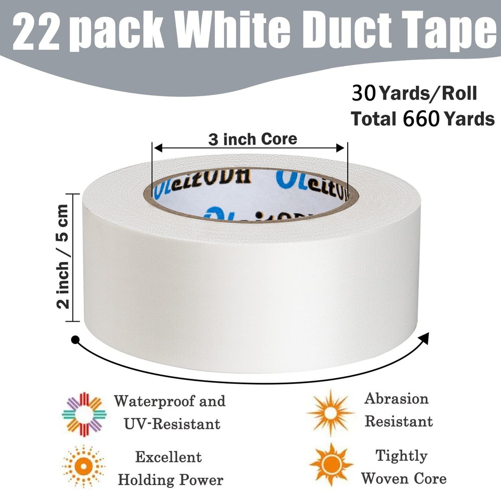 Duct Tape Heavy Duty Bulk: You will receive 22 rolls white duct tape, each roll width 2inch, length 30 yards, total 660 yards.8.3 mil thickness. strong adhesion with waterproof backing for both indoor and outdoor use, it can handle just about any weather, such as sunshine, rain, even snow. this duct tape heavy duty waterproof is great for patching, taping cords, reinforcing, tabbing, light duty bundling, capping pipe, marking, labeling, temporary repairs and more Waterproof, Residue-Free: all-weather white duct tape is ideal for sealing, waterproofing, winterizing your home, hanging plastic sheeting, and other emergency repairs. our max strength duct tape leaves no residue upon removal, without the worry about damaging surfaces. duct tape bulk will adhere to flexible surfaces such as rubber, plastic, and carpet. Easily secures to solid wood, metal, brick, and tile Easy To Tear: waterproof and all weather duct tape white is easy tear by hand both vertical and horizontal direction, waterproof, UV resistant for indoor, garden, greenhouse and other outdoor environment. use as packing tape to mail heavy cargo boxes or bundle items like wood planks for storage. take it with you while you travel or during camping, every traveler and camper can have duct tape 2 inch in their emergency kits. easy to use anywhere Strong Adhesive For Basic Repairs: multi-use white duct tapes aggressive synthetic rubber adhesive for great holding power, create a secure and immediately bond. great stretch and conformability to hold tightly around corners, bends and curves. duct tape industrial will bond the goods together for a long time and wont apart. Our tape’s strong adhesive strength is just what you need to patch, bundle and repair anything fast Wide Applications: heavy duty white duct tape that you can use for anything from home projects to serious industrial repairs. Each roll is individually wrapped, so you can easily store one in your tool kit, garage, workshop, truck, home, or even classroom. the surface of the duct tape all weather can be written by ballpoint pen, water-base pen, etc. black duct tape matte is good adhesion bonds to almost any surface, such as wood, carpet, leather, boxes, plastic, indoor and outdoor application