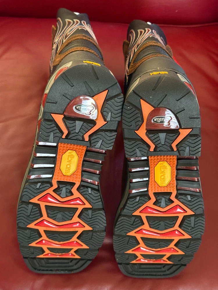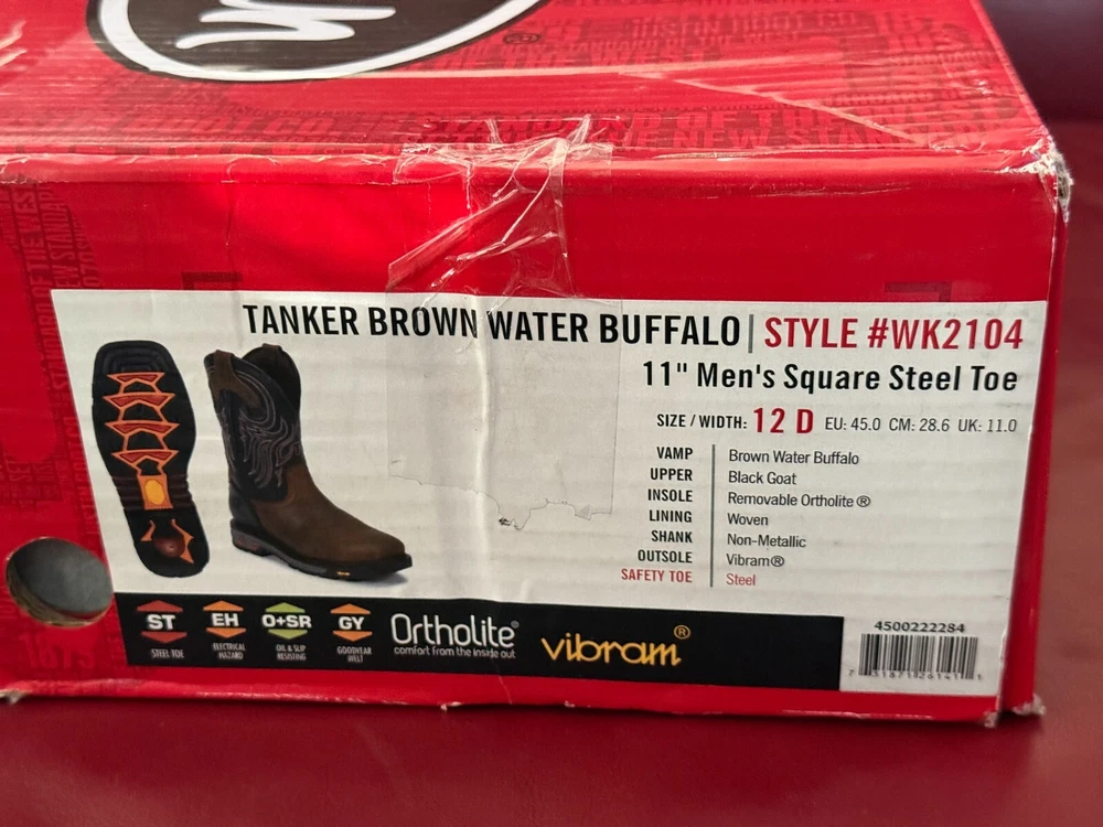 $219.95 MSRP Description & Details The Tanker Brown Steel Toe workboot has traditional cowboy boot qualities yet practical details for the work field. With a black onyx shaft and tobacco square steel toe, this boot blends functionality with style. On the interior, the Ortholite® insole cushions the foot while the steel toe protects it from any possible hazard. The exterior features the Vibram® Commander-X5™ rubber outsole that is resistant to heat, oil, chipping, chemicals, and slipping so you are prepared no matter what comes your way. This boot is electrical hazard rated and meets ASTM F2413-11, 175, C75 EH safety footwear standards. Details Upper: Premium Full Grain Leather Lining: Woven Insole: Ortholite®Removable Insert Toe Shape: Square Construction: Cement Outsole: Vibram® Safety Features: EH, Steel Toe, Oil and Slip Resisting, ASTM F2413 rated Features Vibram® Outsole - We partnered with Vibram®, the world’s leader in high performance rubber soles, to develop an outsole specifically designed for outdoor work and recreation. Slip Resisting - Designed with heavy-duty outsoles that influence the grip of the boot when walking on wet surfaces. Electric Hazard - Our electrical hazard rated boots protect you from open electrical currents from the bottom up. Tested up to 18,000 volts. Steel Toe - From the ranch to the construction site, our steel toe boots are the ideal solution for the working man and woman meeting industry standards for impact and compression.