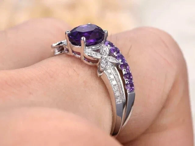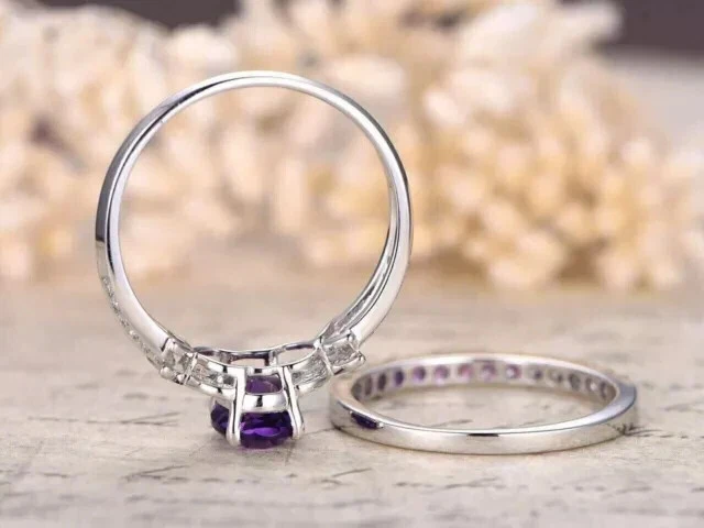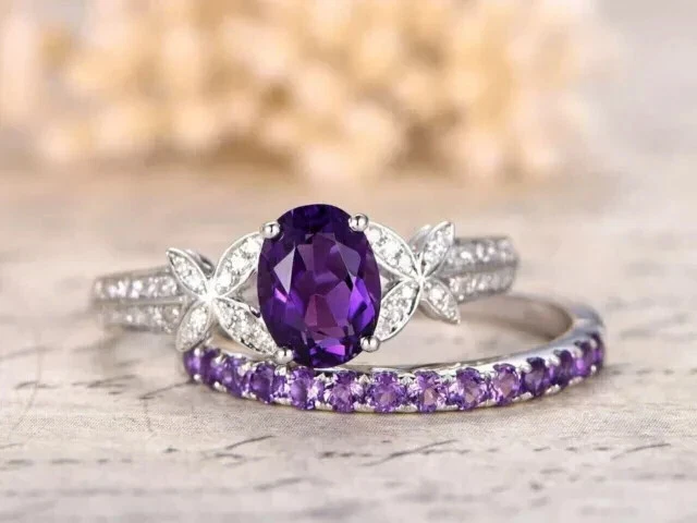 2.20Ct Oval Cut Simulated Amethyst Bridal Ring Set Wedding 14k White Gold Plated