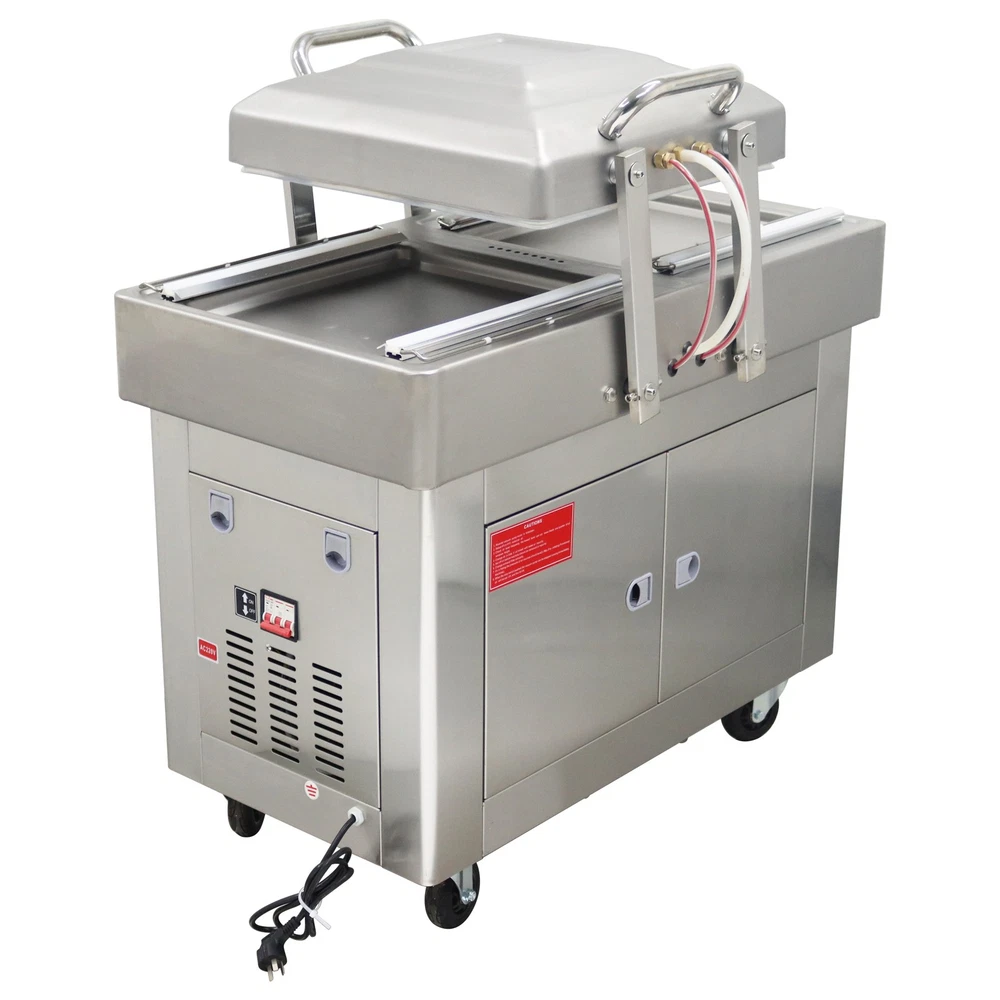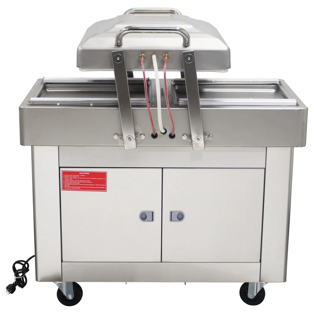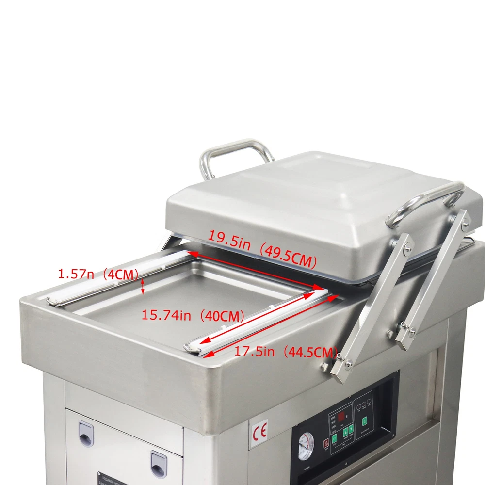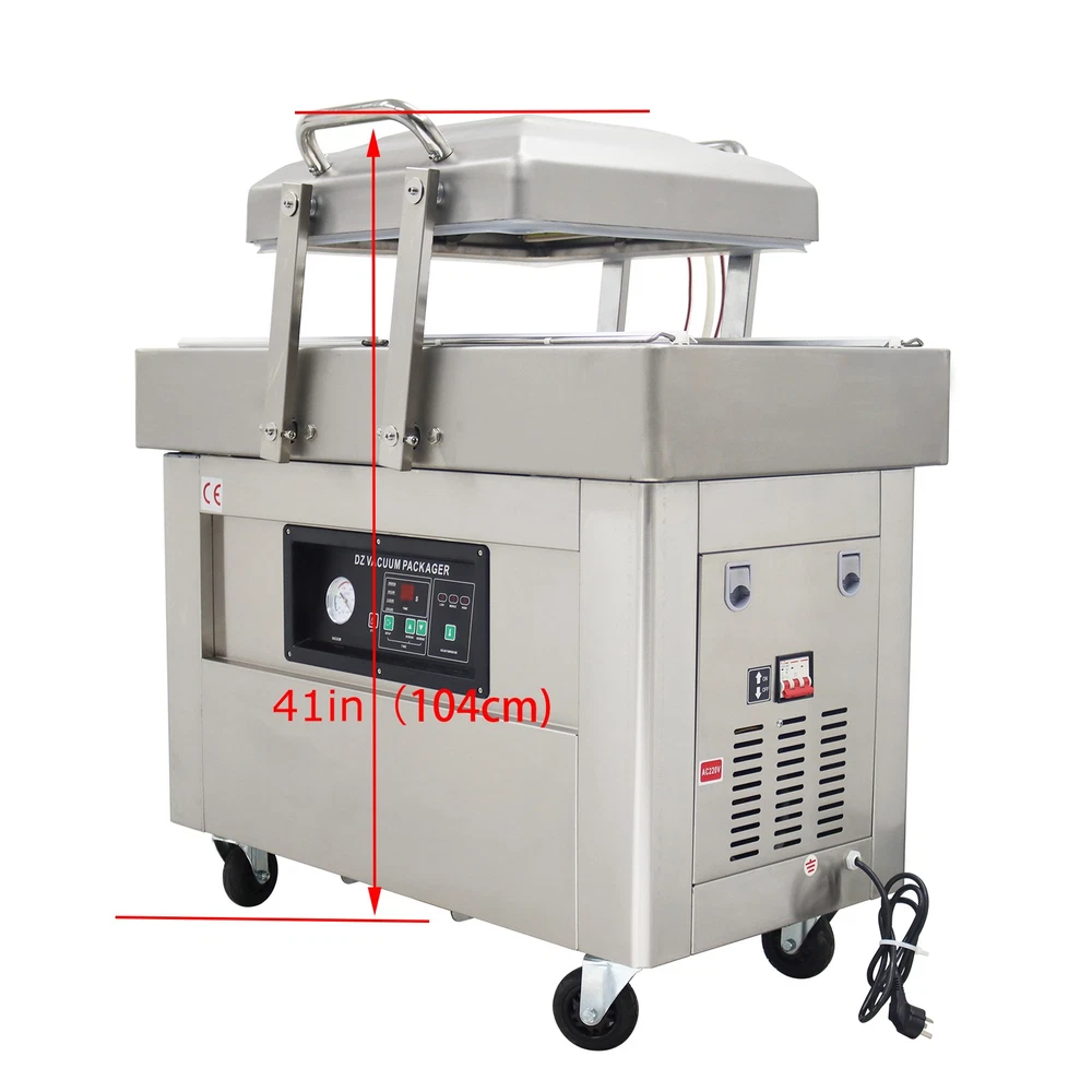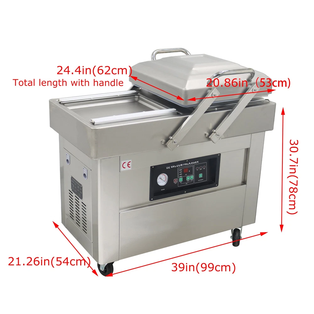 220V Commercial Two Chamber Vacuum Sealer Food Vacuum Packaging Machine 15.7'' The DZ400 machine is designed to evacuate the air from bagged food and non-food items for short and long term preservation. The DZ400 machine is ideal for many applications where the extension of a product's shelf life or a water/air barrier is necessary. The DZ400 machine can be used for sealing meats, vegetables, fruits and other perishable food items. The DZ400 machine comes with dual chambers and dual sealing bars for higher capacity sealing. Packing speed 1-3T/Min Voltage 220V Wattage 0.9KW Material Stainless Steel Vacuum chamber size 17.5*19.5*1.57inch Weight 178kg/392.42lbs Precautions for use 1. It is prohibited to package flammable and explosive materials. 2. Ensure that the equipment is well grounded and regularly check the grounding wire. 3. Keep the heat sealing strip clean to prevent foreign objects from affecting the sealing strength. 4. The sealing opening of the packaging bag should be clean and free of stains. 5. The machine should be placed in a dry place. 6. Do not touch the machine with hands in the working process, and do not stretch your hands into the packaging chambers to avoid scalds. Operation steps 1. Connect the machine to a 220V power supply, and the power indicator light will be on. 2. Put the objects into the packaging bag, flatly lay the bag opening on the heat sealing bracket, and lift the pressure strip to fix the bag opening. 3. Press down the vacuum cover, and start the vacuum pump. When the set vacuum degree is achieved, the air pumping operation stops, and the heat sealing indicator light is on. 4. The solenoid valve works, the heat sealing program begins, and the machine enters the cooling phase after the heat sealing is finished. 5. After the cooling is completed, the pressure relief solenoid valve works, the air enters the chamber, the vacuum cover is automatically lifted, and the packaging bag can be taken out. Before the machine is used, it is necessary to add No. 46 or No. 100 hydraulic oil to the vacuum pump Note:Two types of air switches are shipped randomly. Item inclued Vacuum Sealer Two Chambers 220V--160812 Shipping & Handling Default Shipping Cost or Free Shipping Information: Default shipping cost or free shipping service is only for the lower 48 United States by UPS Ground or USPS. Other areas or needs other shipping ways, please contact us. Buyers from Guam, Puerto Rico, Virgin Islands, American Samoa, Alaska, Hawaii, PO Boxes, APO/FPO addresses or other countries/areas, there WILL be extra shipping costs, please contact us for more detailed information. Please make sure your address is valid for both UPS and USPS services. Any costs incurred because of incorrect or undeliverable address should be undertaken by buyer. Handling Time: Shipping is usually made in 1-3 business days after payments cleared. Orders are processed from Monday-Friday; Not on the weekends & public holidays. Sales tax / Customs duties Any sales taxes or Customs duties are not included. If came out, they must be undertaken by the buyer. Damage In Shipping Email or call us First! We will work with you to get the case resolved in the fastest method. Return&Refund If you are not 100% happy with your purchase, please contact Us. Please don't directly opened a request or case without informing us, or else, we will do some discounts on the warranty and other sales-services later on. Hope for your understanding. Returns & Exchanges All returns must be made within 30 days of delivery date. Items must be in new, unused condition, with all original materials included with the shipment. A partial refund may be applied for opened or damaged items, depending on the condition. Items returned under the buyer’s remorse: The return shipping fee must be covered by the buyer; The original shipping cost will also be deducted from the refund. 15% restocking fee of the items purchase price will be charged. Returns that are the result of our seller's error: Buyer will receive a full refund of the item as well as shipping charges All returns require a RA (Return Authorization) number that will be given by our seller. Please contact with us at first for more details. Defective & Damaged Products If product was received damaged or not as described, please send us some pictures or videos, so we could well understand your problem, then solve them for you ASAP. Besides, it's much helpful for us to claim with UPS, remind our related department to pay much more attention to packaging later on. Hope for your understanding. Replacement or refund of defective or damaged products can only be returned in exchange for the exact same product, or else, the purchase price will be refunded back to your original payment method. If an item is received damaged, customer service must be contacted within 7 days of receiving your item. All returns require a RA (Return Authorization) number as above. Warranty& Feedback 6 months' warranty for the machines, not for the consumables. We stand behind our products all the item, so even if your warranty period has expired, you can still seek for service or technical support from us with low cost. Any warranty shipping cost to us is responsible by buyer. Any shipping cost to buyer is responsible by the seller. We committee to the customer satisfaction and want to bring you the best purchase experience. If there is any problems, please contact us ASAP. If not, please leave us a positive feedback as it's very important for us. Thanks very much. On Jul 3, 2025 at 05:41:35 PDT, seller added the following information: