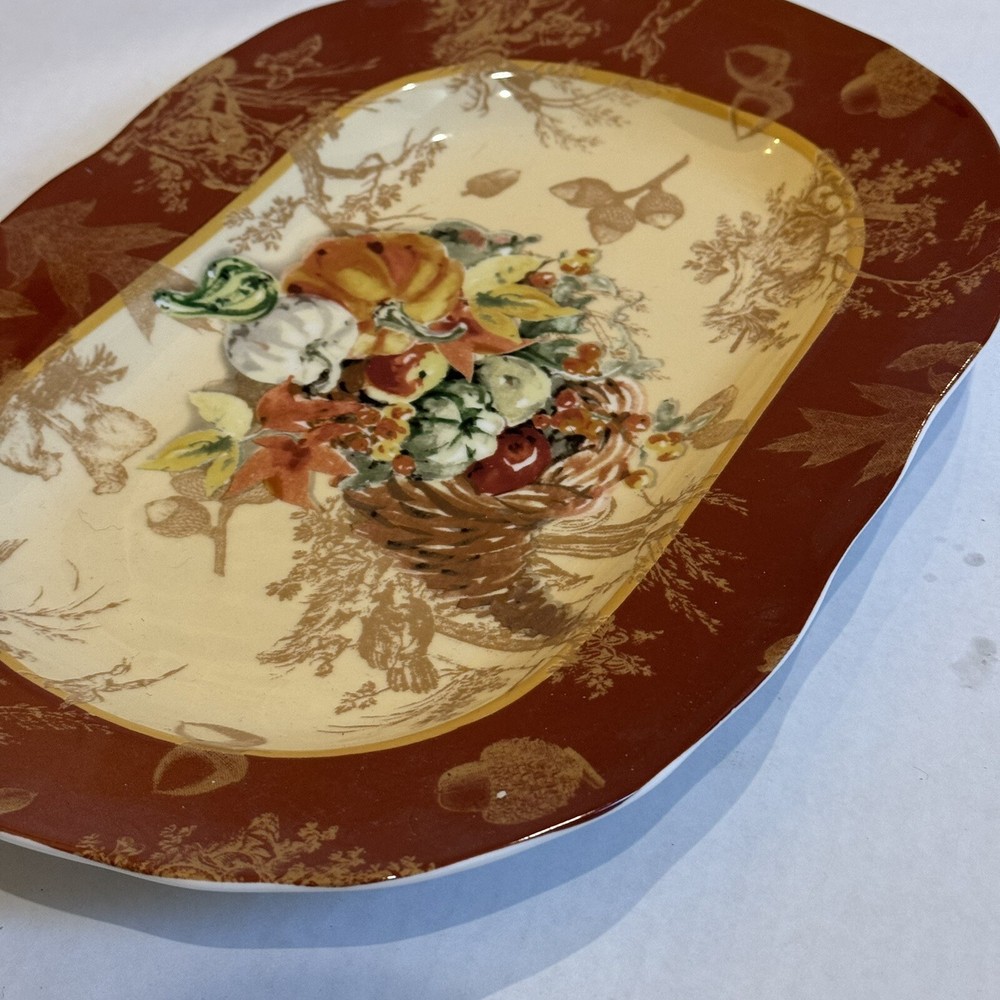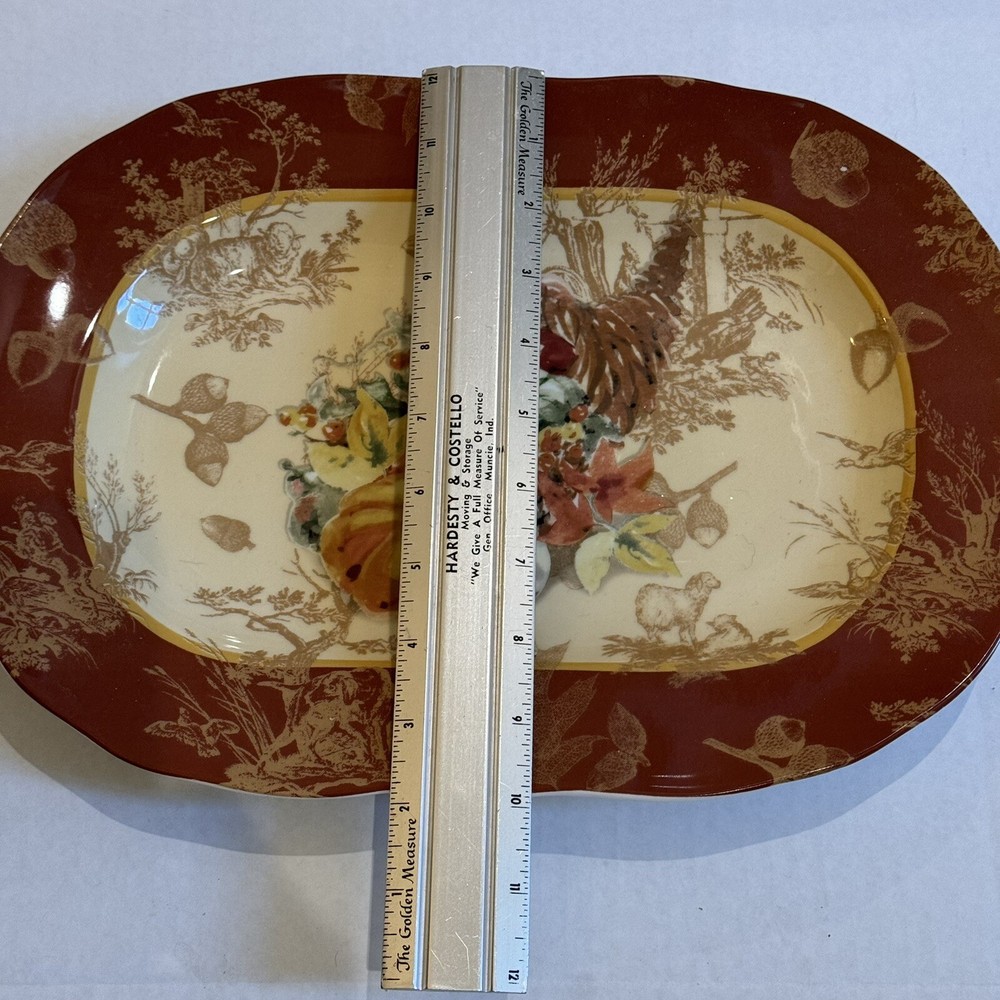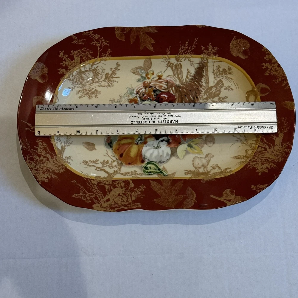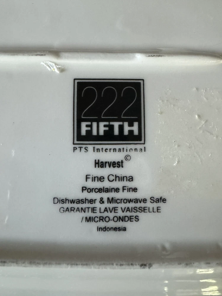 Title: 222 Fifth “Harvest” Fine China Serving Plate - Rectangular - Autumn Cornucopia Design Description: Enhance your table setting this season with this stunning 222 Fifth “Harvest” fine china serving plate. Featuring a beautifully detailed cornucopia of autumn fruits and vegetables against a warm golden background with rich red borders and intricate botanical patterns, this plate is a true statement piece. Perfect for Thanksgiving, fall gatherings, or simply adding a touch of elegance to your home. • Brand: 222 Fifth (PTS International) • Pattern: Harvest • Material: Fine China • Features: Dishwasher & Microwave Safe • Dimensions: Approx. 12” x 9” (as shown in photos) • Origin: Made in Indonesia This serving plate is both functional and decorative, making it a versatile addition to your collection. It’s in excellent condition, ready to be shipped to your home to complete your holiday decor. Keywords: 222 Fifth Harvest Plate, Fall Dinnerware, Thanksgiving China, Cornucopia Plate, Autumn Serving Dish, Fine China Platter, Holiday Entertaining, Microwave Safe Plate, Vintage Harvest Plate Shipping & Shop Policies: • I try to ship all items within 24 hours of purchase (excluding weekends and holidays). • Combine shipping when you purchase two or more items from my shop. • Visit my shop, VintageWowzers, to discover more curated treasures! New items are added daily, so be sure to follow and check back often. Thank you for shopping with me. Have a wonderful day! See you again soon! XOXO