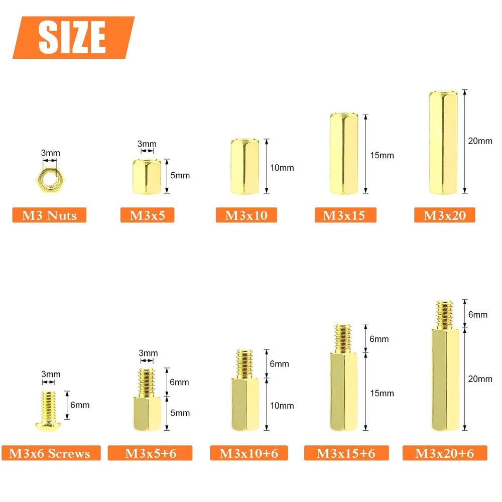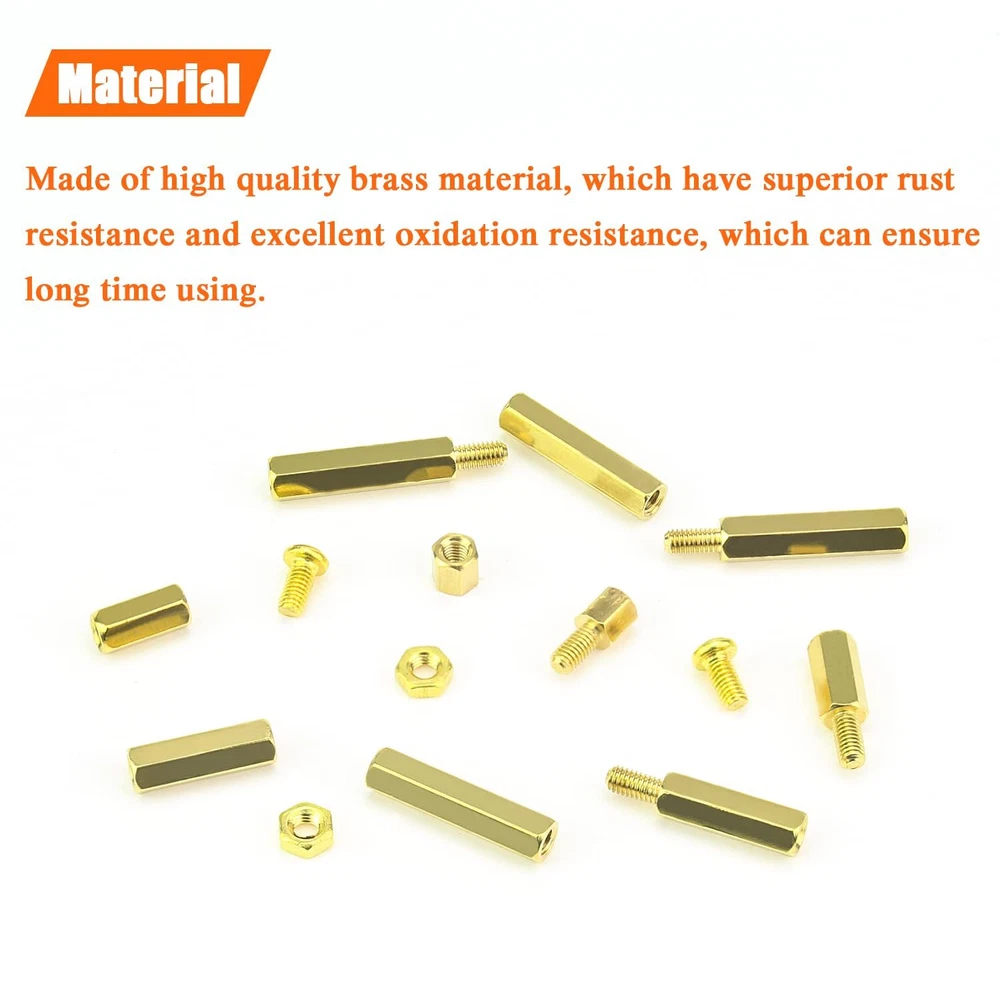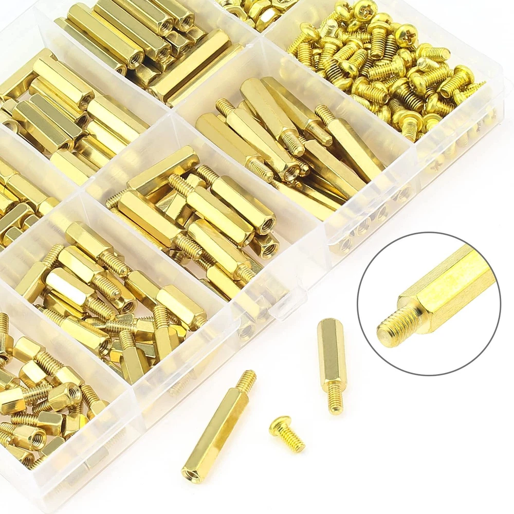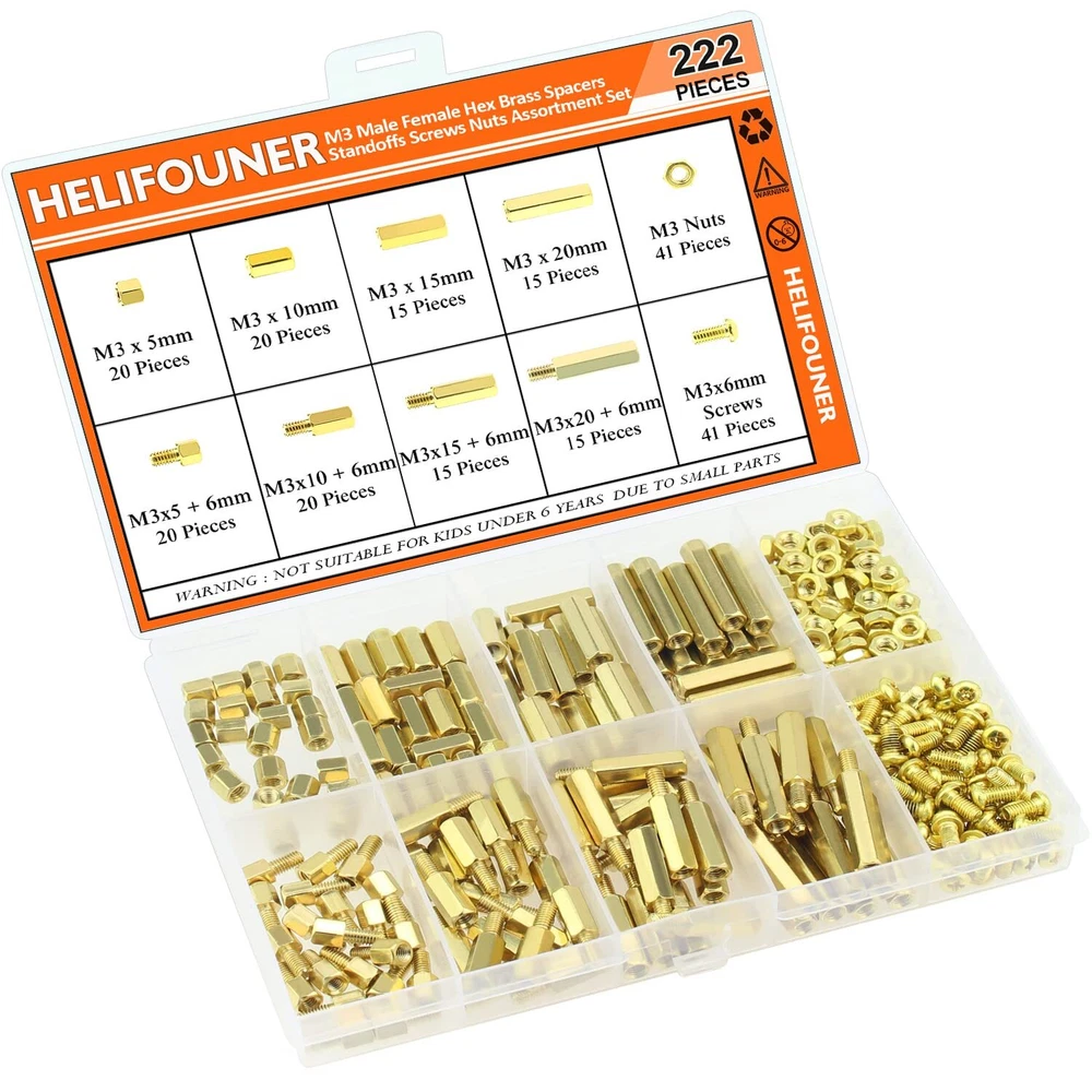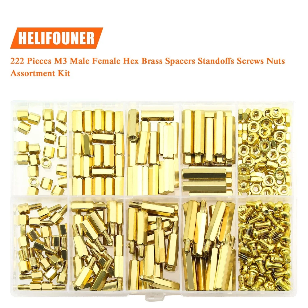 【Specifications:】 - Sizes: M3 - Material: Brass - Type: Brass Standoffs - Package Quantity: 222 Pieces 【Features:】 - The brass spacer thread is deep and clear without burr, waterproof, rust resistant. - This set includes different sizes female-female, female-male standoffs, screws and nuts, different sizes can meet your different needs. - Applies to many area, they are very easy to install, like electronic components and electronic hardware, standoffs are typically used to space circuit boards, panels, doors or gears. 【Package Included:】 <1> M3 Brass male-female standoff (5 mm + 6 mm) ------------------- 20Pieces <2> M3 Brass male-female standoff (10 mm + 6 mm) ------------------ 20Pieces <3> M3 Brass male-female standoff (15 mm + 6 mm) ----------------- 15Pieces <4> M3 Brass male-female standoff (20 mm + 6 mm) ----------------- 15Pieces <5> M3 Brass female to female 5 mm ------------------- 20Pieces <6> M3 Brass female to female 10 mm ----------------- 20Pieces <7> M3 Brass female to female 15 mm ----------------- 15Pieces <8> M3 Brass female to female 20 mm ----------------- 15Pieces <9> M3 Brass screws (M3 * 6 mm) ------------------------ 41Pieces . <10> M3 Brass nuts---------------------------------------- 41Pieces 【Package Quantity: 222 Pieces】 222 Pieces M3 Male Female Hex Brass Spacer Standoff Screw Nut. CHOKING HAZARD -- Small parts. Not for children under 3 years. Note: 1, Warning: small parts, keep away from children and . 2, If you have any questions, please feel free to us at any time. 【Sizes】M3 brass female to female length is 5 mm, 10 mm, 15 mm, 20 mm; The screw size is m3x6 mm, the thread pitch is 0.5 mm, total 222 pieces/10 sizes of the most commonly used spacer in a plastic case, different size can satisfy your different needs. 【Material】Made of durable brass material which have good corrosion resistance in bad environment like high temperature, cold weather, and high humidity areas. They have superior rust resistance and excellent oxidation resistance, which can ensure long time using. 【Design】Brass standoffs is a fastener used to create space between objects, often to properly position them. In the world of electronic components and electronic hardware, standoffs are typically used to space circuit boards, panels, doors or gears. 【Package Included】222 pieces 10 sizes in total, package in a durable transparent box with label. It is easy to distinguish the size of the product, you can choose the suitable to meet all your needs. 【Wide Applications】The brass standoffs thread is deep and clear without burr. With the broad spectrum of length, thread, and diameter, this collection of brass standoffs should be almost universal and cover most hardware DIY projects for desktop computers and some electronics.