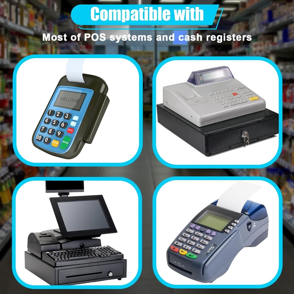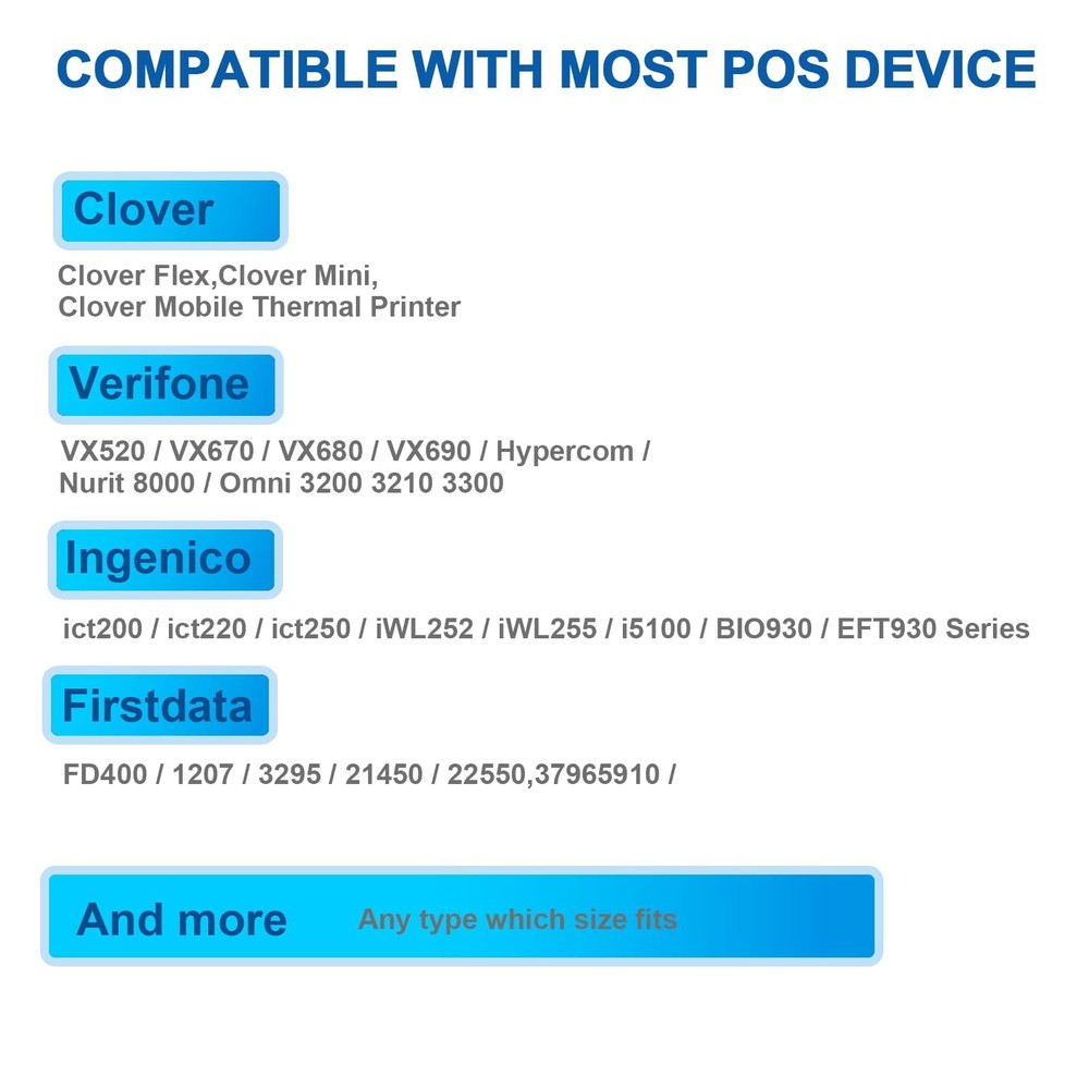 [SIZE] Receipt paper is 2 1/4" X 50' thermal printer paper, the size is strictly controlled to ensure that you will receive a long enough roll of printing paper. The Inner Core Diameter: 1/2" (14 mm), the Diameter of the whole roll is 1-9/16" (39mm). [Perfect Compatibility] This thermal receipt paper 2 1/4" x 50' fits for most of POS and Cash register device such as Clover Flex Mobile POS Clover Mini, Axalto Magic X1000 Blue Bamboo Model P25 Portable Printer Blue Bamboo Model H50 Wirelss POS Terminal Celerex CX 1000 Remote Terminal Citizen CBM262, CBM270,First Data FD400 Credit Card Terminal Hypercom I.C.E.4000, Hypercom I.C.E.4000CE, Hypercom I.C.E.5000, Hypercom I.C.E.5500, Hypercom I.C.E.6500 etc. [BPA/BPS Free]These Credit card papers are made of scientifically tested thermal materials that do not contain BPA and BPS, you can use these thermal receipt paper without any concerns. [Excellent Quality] These thermal paper equipped with durable rollers and premium thermal paper materials, which has been fully wrapped and packed in box to help you well storaged, ensure you having smooth and high definition Printing. [HIGHLY COMPATIBLE] This thermal paper receipt roll measures a standard 2 1/4" X 50'. Compatible with most POS, cash registers and credit card terminals on the market, avoid wasting money by purchasing mismatched products. [Moisture-proof Packaging] The thermal printer paper are packaged in golden plastic packaging. Ensure that the credit card paper is not soiled by dust or made moist by air during the process of mailing and storage.