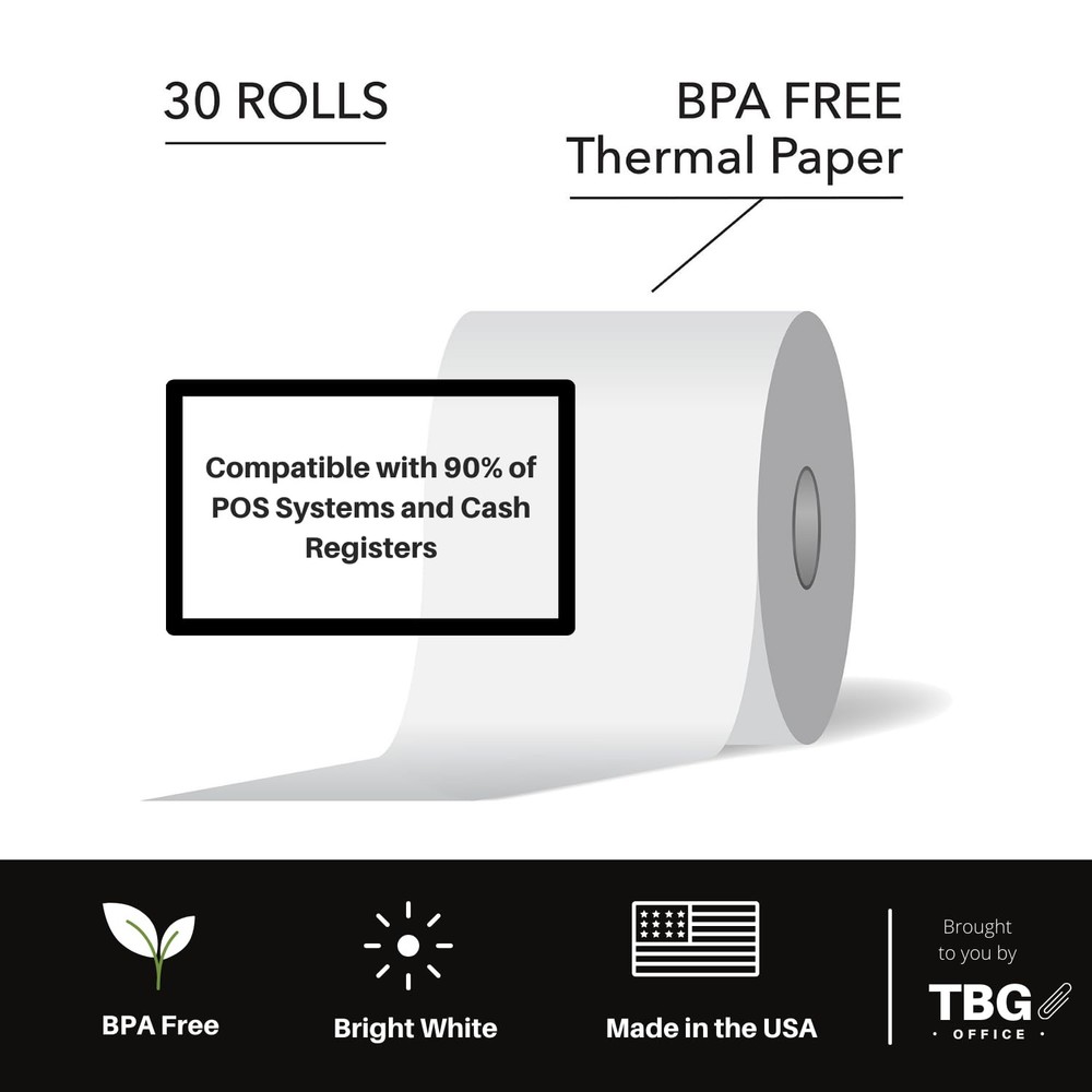 Paper Size: 2 1/4" x 50' (57mm x 15.2m). Box of 30 rolls. Each paper roll has an red end of warning signal Paper weight: 48g, Brightness: 55lm Thermal POS Register Paper. Our thermal paper register rolls produce high quality, easy to read receipts for customers and records. Each roll has a vibrant white surface that dries instantly ensuring that text is crisp and durable. All printer rolls are versatile and compatible with most thermal printing devices, fitting most common credit/debit machines, cash registers, QSRs, and calculators 2 1/4" X 50' High quality / 48 Gram / BPA free paper / Made in USA Our thermal paper register rolls produce high quality, easy to read receipts for customers and records. Each roll has a vibrant white surface that dries instantly ensuring that text is crisp and durable Fits most common cash registers and POS systems including Epson, Suremark/IBM, Clover, Cognitive TPG, Ithaca, NCR, and others Dimensions: Roll width: 2 1/4 inch (57 mm); Length: 50 feet (15.2 meters)