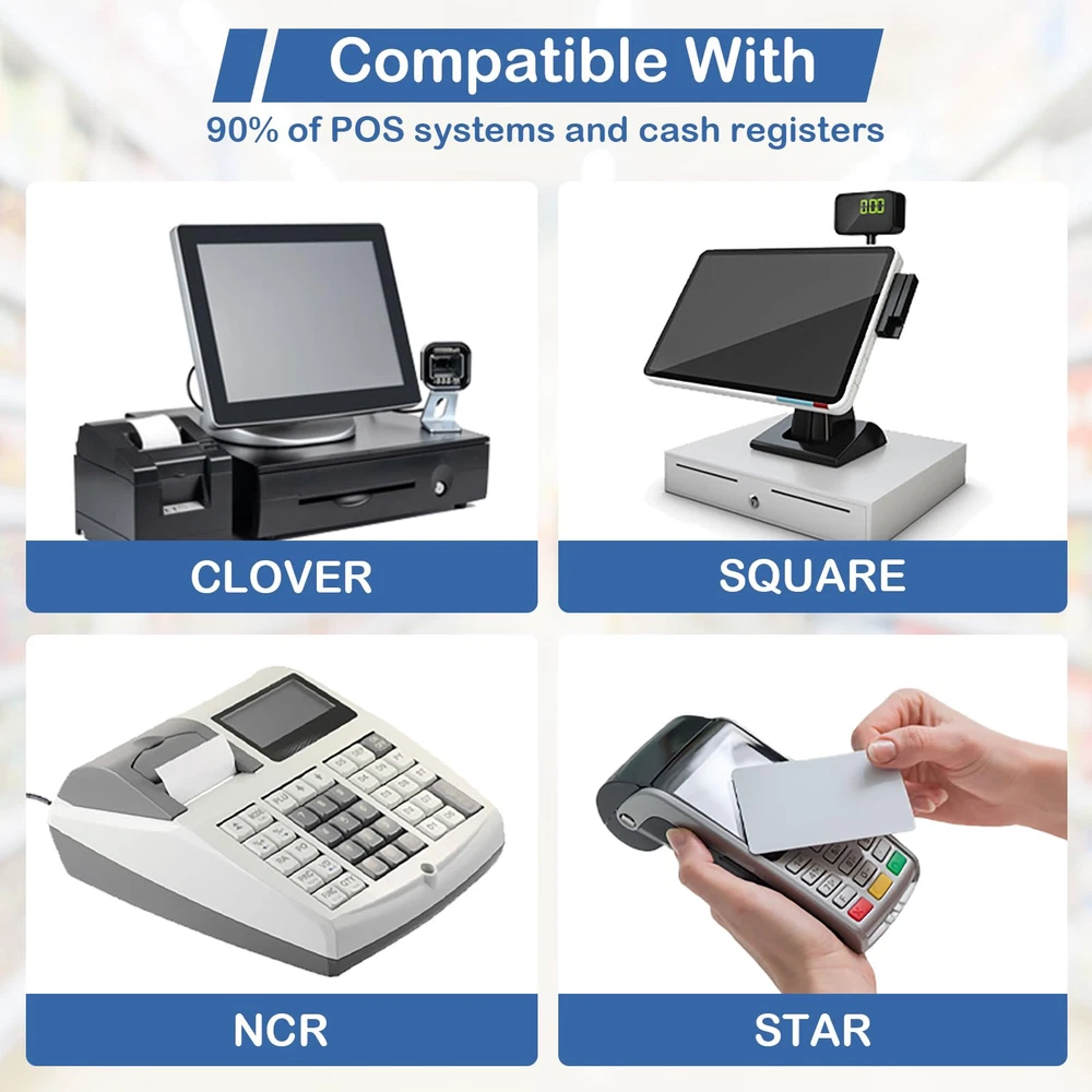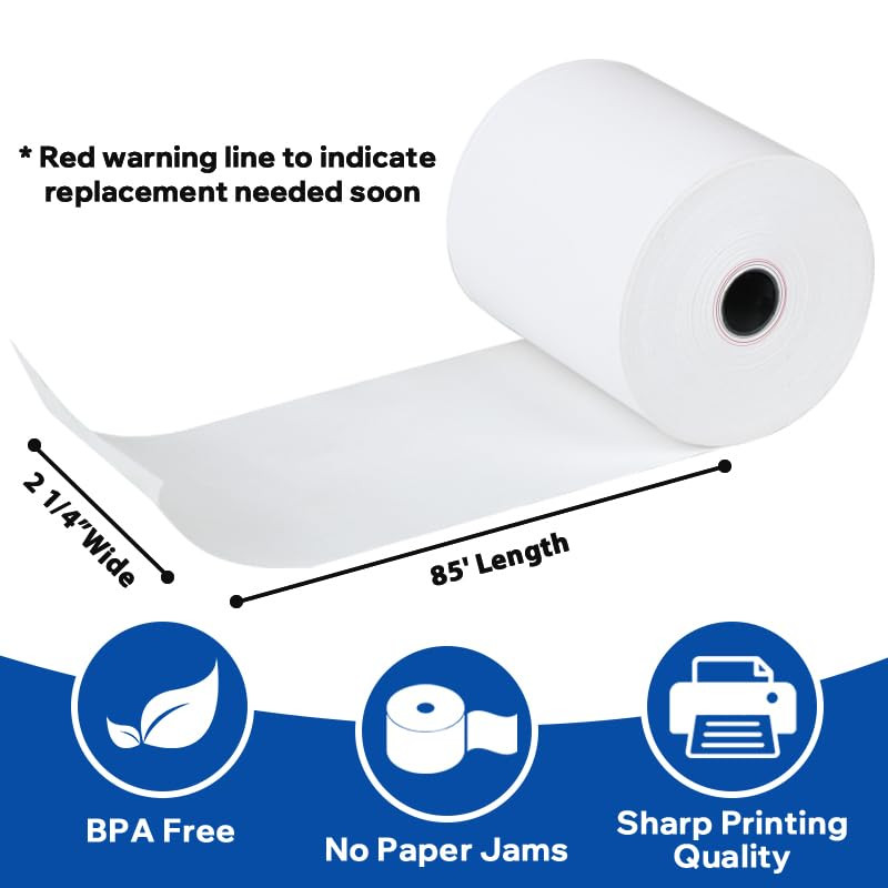 High Quality: Bold, clear print, easy to read. We use 50gsm Premium Quality White Thermal Paper that's engineered for sharp, clear, and long-lasting print images, meeting OEM standards. Thermal printer paper with robust thermal rollers, our paper rolls thermal 2 1/4 x 85 ensures smooth printing without paper jams Thermal Receipt Paper Size: 2 1/4” (width) x 1.75” (depth) x 85 feet (length). Inner Diameter: 0.67inches (17mm).Pack of 50 rolls. BPA Free Receipt Paper.Credit Card Paper rolls thermal 2 1/4 x 50 is easy to install. The 2 1/4 x 85 thermal paper rolls fits and prints out nice Safe Print Paper: The material of this 2 1/4 x 85 thermal paper receipt rolls are safe and environmentally friendly, without toner, odorless and non-toxicfree from BPA (Bisphenol A). Our BPA-FREE paper is coated with heat-sensitive technology, allowing for inkless printing, and Thermal receipt paper rolls are 100% LINT-FREE Strong Compatibility: 2 1/4" x 85' Thermal Paper (50 Rolls) This thermal receipt paper compatible with a wide range of 58mm Mini Thermal POS Printers,fits for Clover Flex Mobile POS, Clover Mini, Square Terminal Credit Card Machines, Royal Alpha, Nurit, Omni, Remote Terminal Citizen CBM262, CBM270 EBW Auto Stik 950 EMCO, Ingenico ICT220, ICT250, First Data FD400, and more End of paper: Each thermal paper rolls has an end-of-warning line, which thoughtfully reminds you to replace the paper. The paper rolls can work for most machines. Credit card paper rolls thermal 2 1/4 x 85 ensures smooth printing without paper jams Versatile Use: Versatility of the print copy paper.Our thermal paper rolls 2.25 x 85 are designed to work seamlessly with most thermal receipt printers. They find applications in various business settings, including malls, supermarkets, banks, restaurants, and more Easy to use: Thermal receipt paper is easy to use,no stickers, no cut requiring. The thermal Paper Receipt Rolls will works great in our printer, just open your printer insert and close the door.They are very quick to open, so quick to change out, when you have a customer waiting for a receipt Service promise: We care about your shopping experience. Thermal paper will go through strict quality control work to ensure that the goods received by customers are of high quality. To ensure your complete Satisfaction. If there are any problems with the thermal paper 2 1/4 x 85, please contact us, We will give the best service to solve the problem