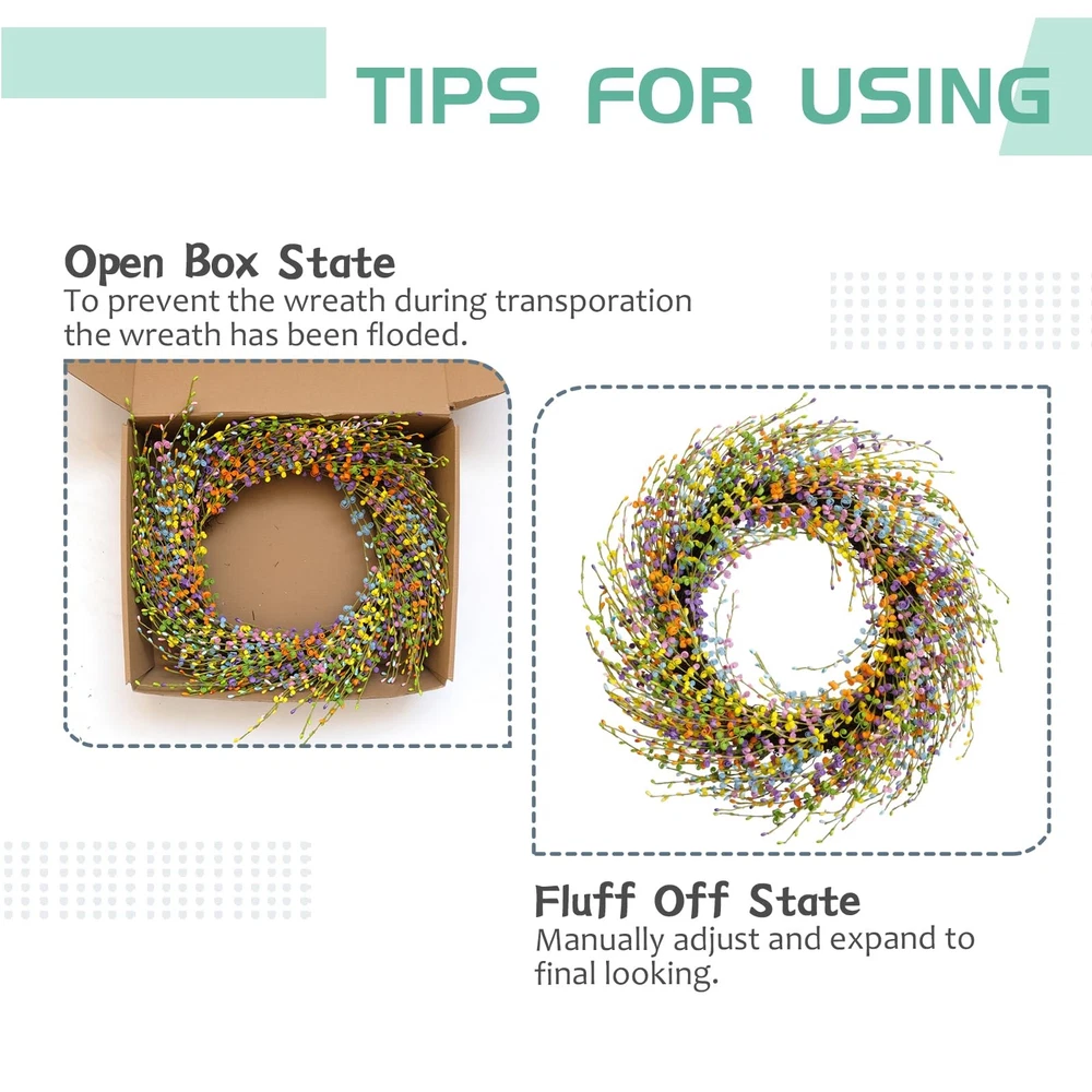 This everyday wreath is made of yellow, orange, green, baby pink, baby blue, purple color soft touch leaves, together with the high quality berries. The whole wreath is full of the atmosphere of colorful and elegant. And this door wreath is a especially valuable home decoration for purchase, because you can hang it all the year round, and the color is very Easter as well. [Colorful Leaves Door Wreath] This everyday wreath is made of yellow, orange, green, baby pink, baby blue, purple color soft touch leaves, together with the high quality berries. The whole wreath is full of the atmosphere of colorful and elegant. And this door wreath is a especially valuable home decoration for purchase, because you can hang it all the year round, and the color is very Easter as well. [22 Inch Everyday Wreath] The outer diameter of this beautiful everyday door wreath is about 22 inch, this size is moderate and suitable for any sense, you can hang it on your front door, porch door, windows, walls etc, and you also can put it inside to complete the whole indoor decor, such as hanging it on your inside doors, kitchen, living room and bedroom. [Spring Summer Indoor Outdoor Wreath] The style of this soft touch leaves wreath is rustic and farmhouse, this style can well fitted into all kinds of home decoration style. Even you wanna decorate your home or pick it as a gift to your family and friends, this wreath is also a good choice. [Grapevine Wreath with Berries] The base of the wreath is natural grapevine which is more stable and long-lasting, and the wreath will come with a strong box, you can use it for storage as well. Taking some colors to your love home. [Tips] 1.Fluff off the wreath to a perfect shape before hanging. 2.Please indoor use and covered outdoor use to keep the wreath long-lasting.