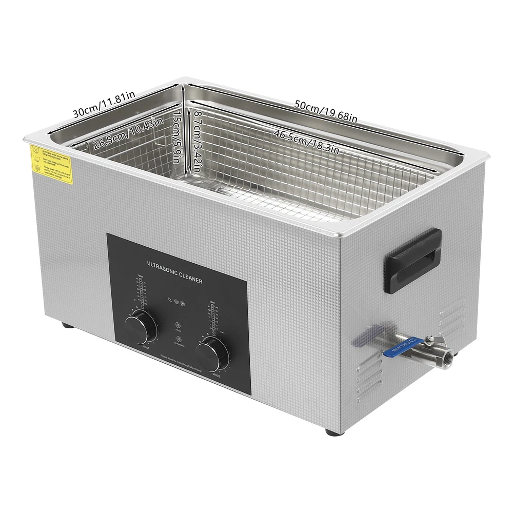 Specifications Color: Silver Style: Modern Shape: Rectangular Material: 304 Stainless Steel, 201 Stainless Steel Mount Type: Countertop Assembly Required: Yes Plug Type: US Standard Power Supply: AC100-120V, 60Hz Ultrasonic Frequency: 40Khz Ultrasonic Power: 480W Heating Power: 500W Power Cord Length: 1.5m/4.92ft Temperature Range: 15-80℃/59-176℉ Time Setting Range: 1-60min Inner Capacity: 22L/5.81Gal Effective Capacity: 17.5L/4.62Gal Drain Valve Diameter: 1/2" Product Inner Size: 50*30*15cm/19.69*11.81*5.9in Cleaning Basket Size: 46.5*26.5*8.7cm/18.3*10.43*3.43in Packaging Size: 66*42*35.5cm/25.98*16.54*13.98in Gross Weight: 12.47kg/27.49lbs Net Weight: 10.4kg/22.93lbs Package Included 1* Ultrasonic Cleaning Machine 1* Cleaning Basket 1* Power Cord 1* English Ultrasonic Jewelry Cleaning Machine 22L Ultrasound Watch Glasses Cleaner 480W US Description~~ Specifications Color: Silver Style: Modern Shape: Rectangular Material: 304 Stainless Steel, 201 Stainless Steel Mount Type: Countertop Assembly Required: Yes Plug Type: US Standard Power Supply: AC100-120V, 60Hz Ultrasonic Frequency: 40Khz Ultrasonic Power: 480W Heating Power: 500W Power Cord Length: 1.5m/4.92ft Temperature Range: 15-80℃/59-176℉ Time Setting Range: 1-60min Inner Capacity: 22L/5.81Gal Effective Capacity: 17.5L/4.62Gal Drain Valve Diameter: 1/2" Product Inner Size: 50*30*15cm/19.69*11.81*5.9in Cleaning Basket Size: 46.5*26.5*8.7cm/18.3*10.43*3.43in Packaging Size: 66*42*35.5cm/25.98*16.54*13.98in Gross Weight: 12.47kg/27.49lbs Net Weight: 10.4kg/22.93lbs Package Included 1* Ultrasonic Cleaning Machine 1* Cleaning Basket 1* Power Cord 1* English Manual Description This ultrasonic cleaner's high-frequency ultrasonic waves can delve into microscopic crevices, breaking down grease and stains adhering to jewelry, spectacles, tableware, braces, and other miniature, intricate items. It features a knob-type timer and temperature control design for a simple operation that simplifies cleaning tasks, bringing technological convenience to your daily life. Key Features Quality and Reliability : The product is made of 304 stainless steel and 201 stainless steel, which is resistant to rust, corrosion, and deformation, giving the product a long service life and excellent working performance. Efficient Cleaning: Different from other cleaning technologies, 40Khz ultrasonic technology can remove dirt on the surface of objects, and penetrate blind holes, and cracks, thus thoroughly cleaning the dirt that cannot be cleaned by hand without damaging your belongings. Moreover, the degas mode can eliminate ultrasonic fatigue and improve cleaning results. Adjustable Design: The product comes with knob-type temperature (59-176℉) and time control (1-60min) to meet the cleaning needs of different objects. Large Capacity: The 4.62gal effective capacity and large cleaning basket (18.3*10.43*3.43 inches) can easily hold and clean most of your watches, jewelry, and more. Efficient Heat Dissipation: The heat dissipation windows and the powerful cooling fan can accelerate heat dissipation, reduce failure rate, and increase service life. Safety Guarantee: The product is equipped with a fuse, when the circuit is overloaded, it will automatically fuse to stop the power supply, avoiding damage to the machine and injury to you. Simple Operation: Equipped with an intuitive and user-friendly operational interface, this product simplifies activation and adjustment of cleaning time and temperature settings, making it accessible to you. Easy to Clean: The fingerprint-resistant stainless steel shell, simple structure, and smooth surface make it more convenient for daily cleaning. Details Cleaning Basket: It can reduce scratches during cleaning to better protect your valuables items, and can also be used to drip-dry items. Side Handles: They make it convenient to move the machine. Drain Valve: It allows you to drain standing water and cleaning fluids more easily. Top Lid: It can well seal the machine to reduce heat loss and noise. Meanwhile, the handle on the top allows you to easily pick up the lid. Sturdy Feet: They prevent the product from sliding and enhance stability during operation. Application It can be used in homes, laboratories, the jewelry industry, industry, electrical industry, hospitals, and more. It is specially used for cleaning jewelry, eyeglasses, watches, dentures, dental instruments, clocks and watches, motorcycle parts, automobile parts, bicycle parts, hardware, tools, engine parts, and more. Notes Please check the size carefully before ordering. Please note that the heating is turned on when the preset temperature is higher than the actual temperature. Please note that the ultrasonic cleaning process can also slowly heat the cleaning liquid, so the temperature of the cleaning liquid is likely to be higher than the preset temperature. 304 stainless steel material makes the device resistant to weak acids and weak alkalis. However, please don't use strong acids or strong alkali. Please do not place items directly on the bottom of the cleaning tank and please put items into the washing basket for cleaning. It needs to be filled with 2/3 of the water and please avoid dry-burning. Please read the operating manual and label completely before use. And pay particular attention to the safety instructions included. Please allow the slight color difference caused by the shooting light and 1-3cm error due to manual measurement, and make sure you do not mind before you order. tu1 Payment Delivery details Terms of sales About us Contact us Payment We accept ebay payment 。 Fees such as import duties, taxes are not included in the item price or shipping costs. These charges are the buyer's responsibility. Delivery details Shipping: 2-9 working days to: USA Terms of sales We maintain high standards of excellence and strive for hundred percent customer satisfaction. Feedback is very important to us. We hope that you contact us immediately before you giv