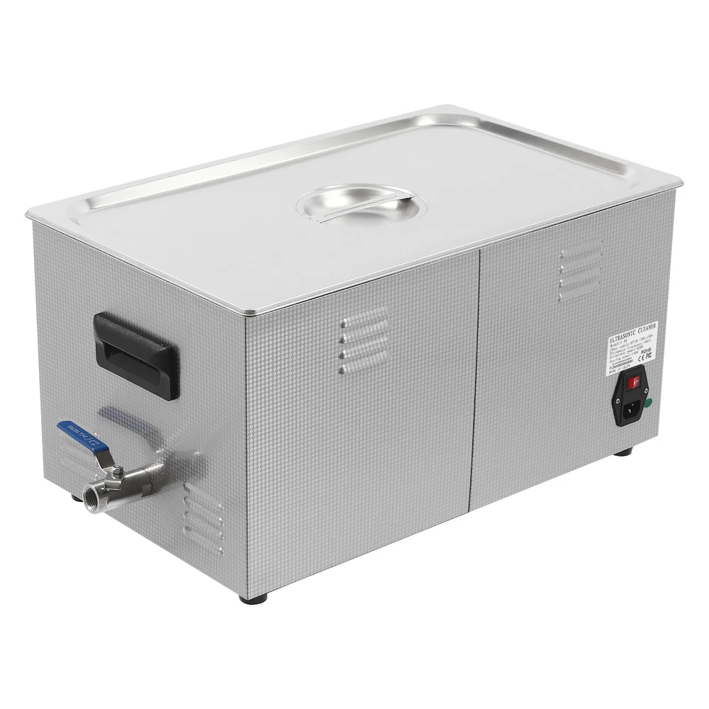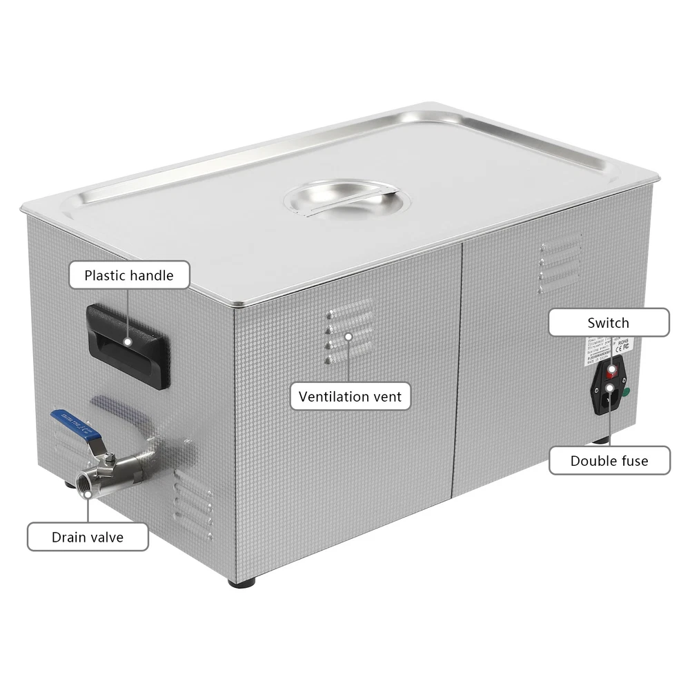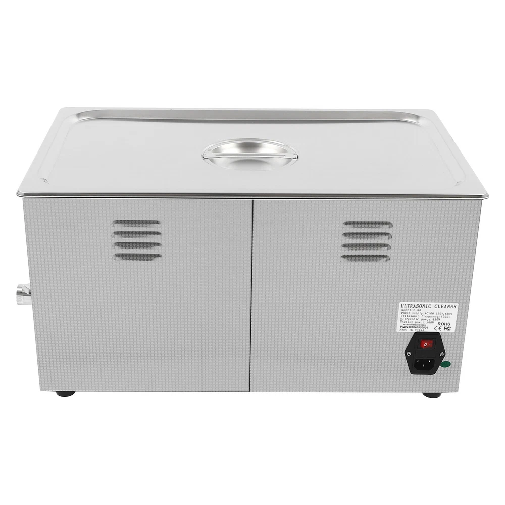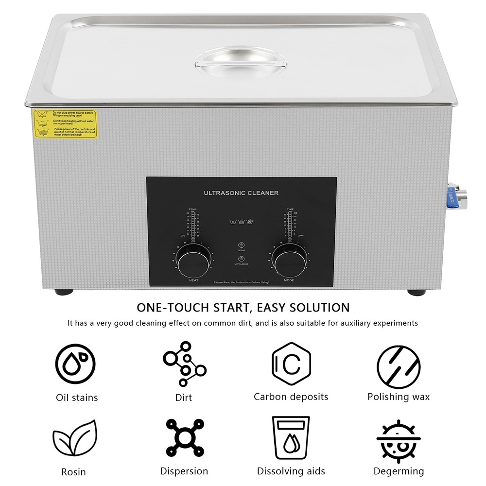 Specifications Color: Silver Style: Modern Shape: Rectangular Material: 304 Stainless Steel, 201 Stainless Steel Mount Type: Countertop Assembly Required: Yes Plug Type: US Standard Power Supply: AC100-120V, 60Hz Ultrasonic Frequency: 40Khz Ultrasonic Power: 480W Heating Power: 500W Power Cord Length: 1.5m/4.92ft Temperature Range: 15-80℃/59-176℉ Time Setting Range: 1-60min Inner Capacity: 22L/5.81Gal Effective Capacity: 17.5L/4.62Gal Drain Valve Diameter: 1/2" Product Inner Size: 50*30*15cm/19.69*11.81*5.9in Cleaning Basket Size: 46.5*26.5*8.7cm/18.3*10.43*3.43in Packaging Size: 66*42*35.5cm/25.98*16.54*13.98in Gross Weight: 12.47kg/27.49lbs Net Weight: 10.4kg/22.93lbs Package Included 1* Ultrasonic Cleaning Machine 1* Cleaning Basket 1* Power Cord 1* English Specifications Color: Silver Style: Modern Shape: Rectangular Material: 304 Stainless Steel, 201 Stainless Steel Mount Type: Countertop Assembly Required: Yes Plug Type: US Standard Power Supply: AC100-120V, 60Hz Ultrasonic Frequency: 40Khz Ultrasonic Power: 480W Heating Power: 500W Power Cord Length: 1.5m/4.92ft Temperature Range: 15-80℃/59-176℉ Time Setting Range: 1-60min Inner Capacity: 22L/5.81Gal Effective Capacity: 17.5L/4.62Gal Drain Valve Diameter: 1/2" Product Inner Size: 50*30*15cm/19.69*11.81*5.9in Cleaning Basket Size: 46.5*26.5*8.7cm/18.3*10.43*3.43in Packaging Size: 66*42*35.5cm/25.98*16.54*13.98in Gross Weight: 12.47kg/27.49lbs Net Weight: 10.4kg/22.93lbs Package Included 1* Ultrasonic Cleaning Machine 1* Cleaning Basket 1* Power Cord 1* English Manual Description This ultrasonic cleaner's high-frequency ultrasonic waves can delve into microscopic crevices, breaking down grease and stains adhering to jewelry, spectacles, tableware, braces, and other miniature, intricate items. It features a knob-type timer and temperature control design for a simple operation that simplifies cleaning tasks, bringing technological convenience to your daily life. Key Features Quality and Reliability : The product is made of 304 stainless steel and 201 stainless steel, which is resistant to rust, corrosion, and deformation, giving the product a long service life and excellent working performance. Efficient Cleaning: Different from other cleaning technologies, 40Khz ultrasonic technology can remove dirt on the surface of objects, and penetrate blind holes, and cracks, thus thoroughly cleaning the dirt that cannot be cleaned by hand without damaging your belongings. Moreover, the degas mode can eliminate ultrasonic fatigue and improve cleaning results. Adjustable Design: The product comes with knob-type temperature (59-176℉) and time control (1-60min) to meet the cleaning needs of different objects. Large Capacity: The 4.62gal effective capacity and large cleaning basket (18.3*10.43*3.43 inches) can easily hold and clean most of your watches, jewelry, and more. Efficient Heat Dissipation: The heat dissipation windows and the powerful cooling fan can accelerate heat dissipation, reduce failure rate, and increase service life. Safety Guarantee: The product is equipped with a fuse, when the circuit is overloaded, it will automatically fuse to stop the power supply, avoiding damage to the machine and injury to you. Simple Operation: Equipped with an intuitive and user-friendly operational interface, this product simplifies activation and adjustment of cleaning time and temperature settings, making it accessible to you. Easy to Clean: The fingerprint-resistant stainless steel shell, simple structure, and smooth surface make it more convenient for daily cleaning. Details Cleaning Basket: It can reduce scratches during cleaning to better protect your valuables items, and can also be used to drip-dry items. Side Handles: They make it convenient to move the machine. Drain Valve: It allows you to drain standing water and cleaning fluids more easily. Top Lid: It can well seal the machine to reduce heat loss and noise. Meanwhile, the handle on the top allows you to easily pick up the lid. Sturdy Feet: They prevent the product from sliding and enhance stability during operation. Application It can be used in homes, laboratories, the jewelry industry, industry, electrical industry, hospitals, and more. It is specially used for cleaning jewelry, eyeglasses, watches, dentures, dental instruments, clocks and watches, motorcycle parts, automobile parts, bicycle parts, hardware, tools, engine parts, and more. Notes Please check the size carefully before ordering. Please note that the heating is turned on when the preset temperature is higher than the actual temperature. Please note that the ultrasonic cleaning process can also slowly heat the cleaning liquid, so the temperature of the cleaning liquid is likely to be higher than the preset temperature. 304 stainless steel material makes the device resistant to weak acids and weak alkalis. However, please don't use strong acids or strong alkali. Please do not place items directly on the bottom of the cleaning tank and please put items into the washing basket for cleaning. It needs to be filled with 2/3 of the water and please avoid dry-burning. Please read the operating manual and label completely before use. And pay particular attention to the safety instructions included. Please allow the slight color difference caused by the shooting light and 1-3cm error due to manual measurement, and make sure you do not mind before you order. Payment Delivery details Terms of sales About us Contact us Payment We accept ebay payment 。 Fees such as import duties, taxes are not included in the item price or shipping costs. These charges are the buyer's responsibility. Delivery details Shipping: 2-9 working days to: USA Terms of sales We maintain high standards of excellence and strive for hundred percent customer satisfaction. Feedback is very important to us. We hope that you contact us immediately before you give neutral or negative feedback, so that we can address your concerns. It is impossible to address i