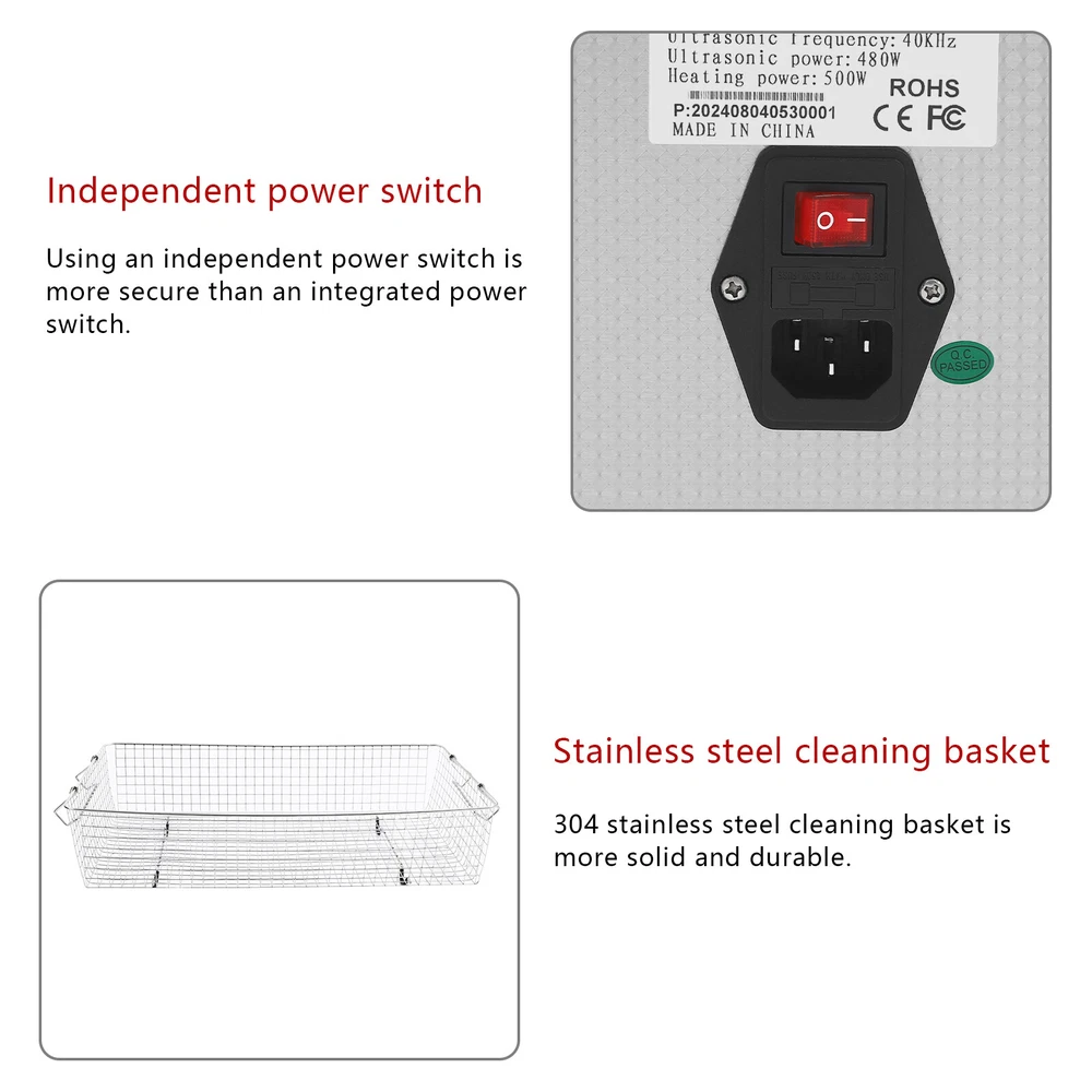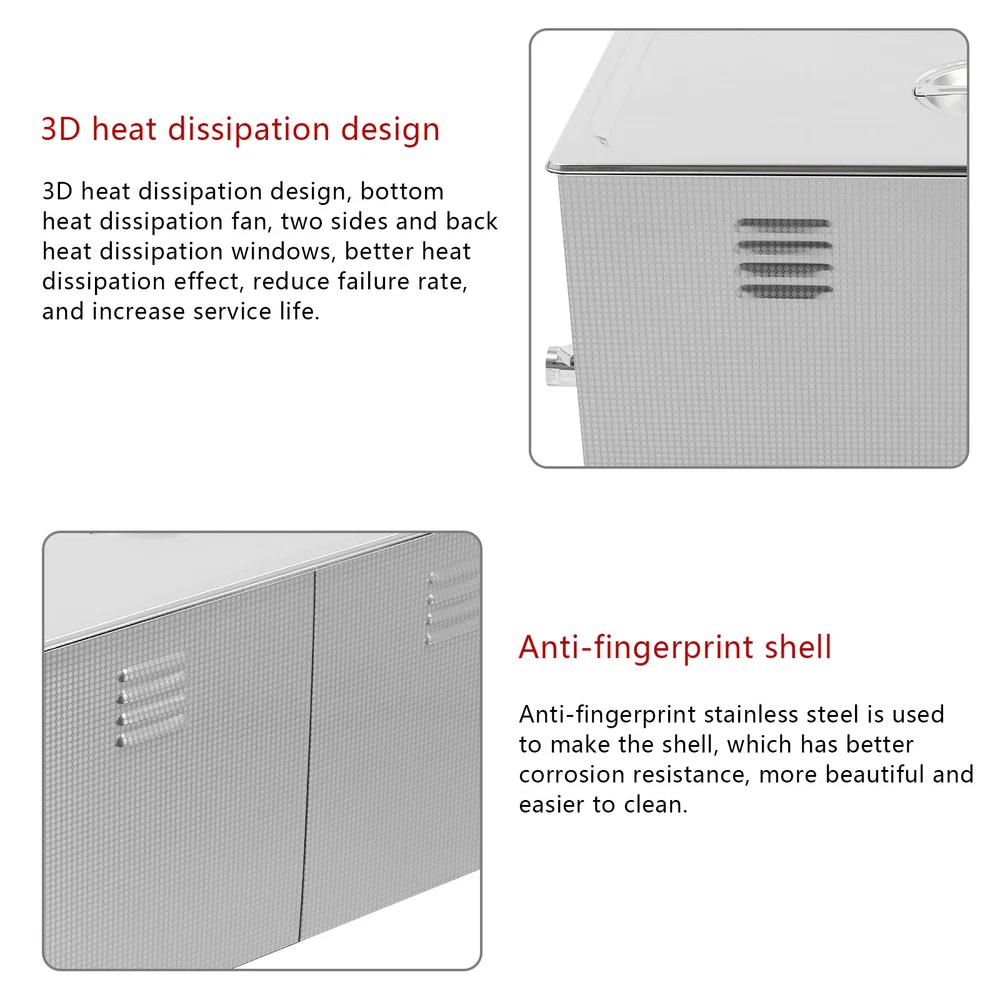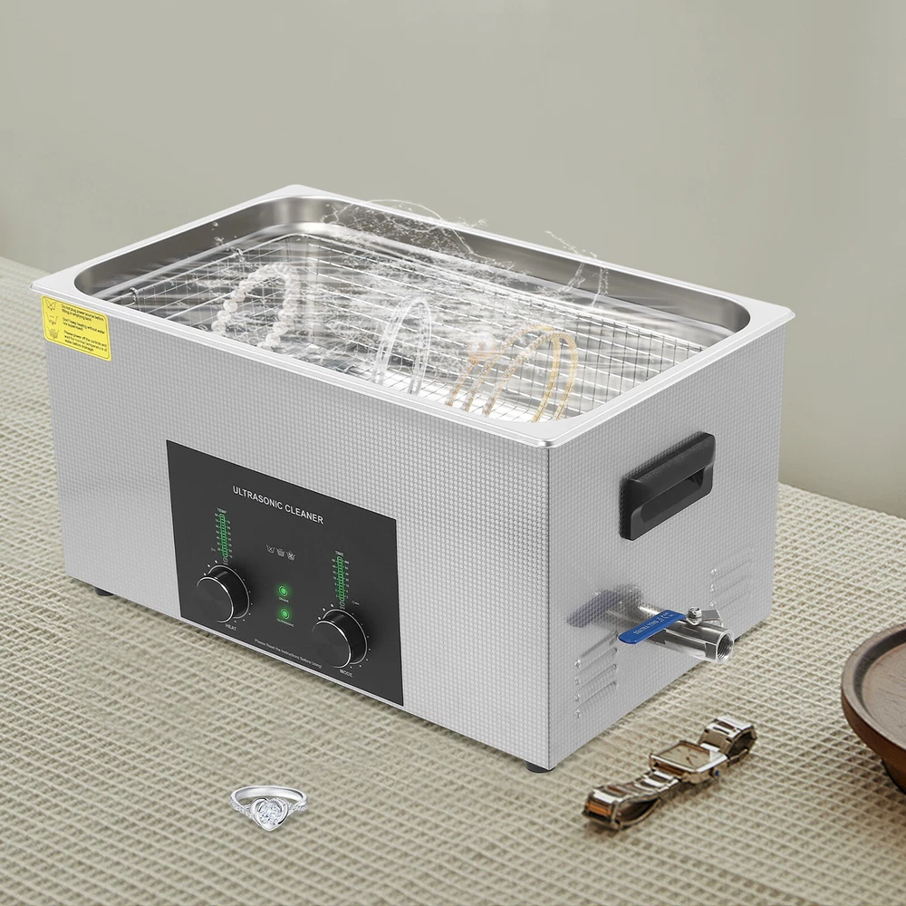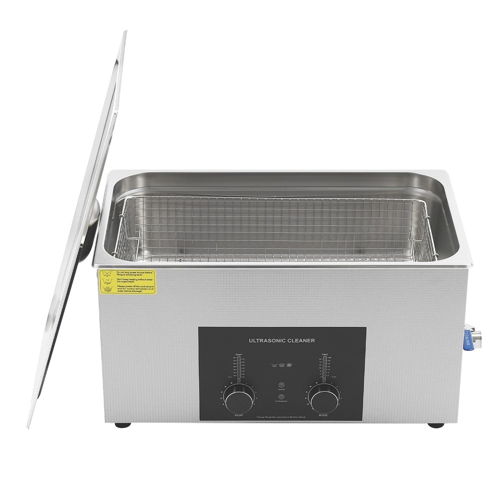 Specifications Color: Silver Style: Modern Shape: Rectangular Material: 304 Stainless Steel, 201 Stainless Steel Mount Type: Countertop Assembly Required: Yes Plug Type: US Standard Power Supply: AC100-120V, 60Hz Ultrasonic Frequency: 40Khz Ultrasonic Power: 480W Heating Power: 500W Power Cord Length: 1.5m/4.92ft Temperature Range: 15-80℃/59-176℉ Time Setting Range: 1-60min Inner Capacity: 22L/5.81Gal Effective Capacity: 17.5L/4.62Gal Drain Valve Diameter: 1/2" Product Inner Size: 50*30*15cm/19.69*11.81*5.9in Cleaning Basket Size: 46.5*26.5*8.7cm/18.3*10.43*3.43in Packaging Size: 66*42*35.5cm/25.98*16.54*13.98in Gross Weight: 12.47kg/27.49lbs Net Weight: 10.4kg/22.93lbs Package Included 1* Ultrasonic Cleaning Machine 1* Cleaning Basket 1* Power Cord 1* English Specifications Color: Silver Style: Modern Shape: Rectangular Material: 304 Stainless Steel, 201 Stainless Steel Mount Type: Countertop Assembly Required: Yes Plug Type: US Standard Power Supply: AC100-120V, 60Hz Ultrasonic Frequency: 40Khz Ultrasonic Power: 480W Heating Power: 500W Power Cord Length: 1.5m/4.92ft Temperature Range: 15-80℃/59-176℉ Time Setting Range: 1-60min Inner Capacity: 22L/5.81Gal Effective Capacity: 17.5L/4.62Gal Drain Valve Diameter: 1/2" Product Inner Size: 50*30*15cm/19.69*11.81*5.9in Cleaning Basket Size: 46.5*26.5*8.7cm/18.3*10.43*3.43in Packaging Size: 66*42*35.5cm/25.98*16.54*13.98in Gross Weight: 12.47kg/27.49lbs Net Weight: 10.4kg/22.93lbs Package Included 1* Ultrasonic Cleaning Machine 1* Cleaning Basket 1* Power Cord 1* English Manual Description This ultrasonic cleaner's high-frequency ultrasonic waves can delve into microscopic crevices, breaking down grease and stains adhering to jewelry, spectacles, tableware, braces, and other miniature, intricate items. It features a knob-type timer and temperature control design for a simple operation that simplifies cleaning tasks, bringing technological convenience to your daily life. Key Features Quality and Reliability : The product is made of 304 stainless steel and 201 stainless steel, which is resistant to rust, corrosion, and deformation, giving the product a long service life and excellent working performance. Efficient Cleaning: Different from other cleaning technologies, 40Khz ultrasonic technology can remove dirt on the surface of objects, and penetrate blind holes, and cracks, thus thoroughly cleaning the dirt that cannot be cleaned by hand without damaging your belongings. Moreover, the degas mode can eliminate ultrasonic fatigue and improve cleaning results. Adjustable Design: The product comes with knob-type temperature (59-176℉) and time control (1-60min) to meet the cleaning needs of different objects. Large Capacity: The 4.62gal effective capacity and large cleaning basket (18.3*10.43*3.43 inches) can easily hold and clean most of your watches, jewelry, and more. Efficient Heat Dissipation: The heat dissipation windows and the powerful cooling fan can accelerate heat dissipation, reduce failure rate, and increase service life. Safety Guarantee: The product is equipped with a fuse, when the circuit is overloaded, it will automatically fuse to stop the power supply, avoiding damage to the machine and injury to you. Simple Operation: Equipped with an intuitive and user-friendly operational interface, this product simplifies activation and adjustment of cleaning time and temperature settings, making it accessible to you. Easy to Clean: The fingerprint-resistant stainless steel shell, simple structure, and smooth surface make it more convenient for daily cleaning. Details Cleaning Basket: It can reduce scratches during cleaning to better protect your valuables items, and can also be used to drip-dry items. Side Handles: They make it convenient to move the machine. Drain Valve: It allows you to drain standing water and cleaning fluids more easily. Top Lid: It can well seal the machine to reduce heat loss and noise. Meanwhile, the handle on the top allows you to easily pick up the lid. Sturdy Feet: They prevent the product from sliding and enhance stability during operation. Application It can be used in homes, laboratories, the jewelry industry, industry, electrical industry, hospitals, and more. It is specially used for cleaning jewelry, eyeglasses, watches, dentures, dental instruments, clocks and watches, motorcycle parts, automobile parts, bicycle parts, hardware, tools, engine parts, and more. Notes Please check the size carefully before ordering. Please note that the heating is turned on when the preset temperature is higher than the actual temperature. Please note that the ultrasonic cleaning process can also slowly heat the cleaning liquid, so the temperature of the cleaning liquid is likely to be higher than the preset temperature. 304 stainless steel material makes the device resistant to weak acids and weak alkalis. However, please don't use strong acids or strong alkali. Please do not place items directly on the bottom of the cleaning tank and please put items into the washing basket for cleaning. It needs to be filled with 2/3 of the water and please avoid dry-burning. Please read the operating manual and label completely before use. And pay particular attention to the safety instructions included. Please allow the slight color difference caused by the shooting light and 1-3cm error due to manual measurement, and make sure you do not mind before you order. Payment Delivery details Terms of sales About us Contact us Payment We accept ebay payment 。 Fees such as import duties, taxes are not included in the item price or shipping costs. These charges are the buyer's responsibility. Delivery details Shipping: 2-9 working days to: USA Terms of sales We maintain high standards of excellence and strive for hundred percent customer satisfaction. Feedback is very important to us. We hope that you contact us immediately before you give neutral or negative feedback, so that we can address your concerns. It is impossible to address i